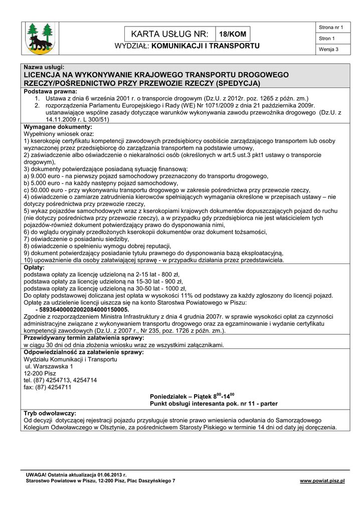 Strona nr 1 KARTA USŁUG NR: 18/KOM WYDZIAŁ: KOMUNIKACJI I TRANSPORTU Stron 1 Wersja 3 Nazwa usługi: LICENCJA NA WYKONYWANIE KRAJOWEGO TRANSPORTU DROGOWEGO RZECZY/POŚREDNICTWO PRZY PRZEWOZIE RZECZY (SPEDYCJA) Podstawa prawna: 1. Ustawa z dnia 6 września 2001 r. o transporcie drogowym (Dz.U. z 2012r. poz. 1265 z późn. zm.) 2. rozporządzenia Parlamentu Europejskiego i Rady (WE) Nr 1071/2009 z dnia 21 października 2009r. ustanawiające wspólne zasady dotyczące warunków wykonywania zawodu przewoźnika drogowego (Dz.U. z 14.11.2009 r. L 300/51) Wymagane dokumenty: Wypełniony wniosek oraz: 1) kserokopię certyfikatu kompetencji zawodowych przedsiębiorcy osobiście zarządzającego transportem lub osoby wyznaczonej przez przedsiębiorcę do zarządzania transportem na podstawie umowy, 2) zaświadczenie albo oświadczenie o niekaralności osób (określonych w art.5 ust.3 pkt1 ustawy o transporcie drogowym), 3) dokumenty potwierdzające posiadaną sytuację finansową: a) 9.000 euro - na pierwszy pojazd samochodowy przeznaczony do transportu drogowego, b) 5.000 euro - na każdy następny pojazd samochodowy, c) 50.000 euro - przy wykonywaniu transportu drogowego w zakresie pośrednictwa przy przewozie rzeczy, 4) oświadczenie o zamiarze zatrudnienia kierowców spełniających wymagania określone w przepisach ustawy – nie dotyczy pośrednictwa przy przewozie rzeczy, 5) wykaz pojazdów samochodowych wraz z kserokopiami krajowych dokumentów dopuszczających pojazd do ruchu (nie dotyczy pośrednictwa przy przewozie rzeczy), a w przypadku gdy przedsiębiorca nie jest właścicielem tych pojazdów-również dokument potwierdzający prawo do dysponowania nimi, 6) do wglądu oryginały przedłożonych kserokopii dokumentów oraz dokument tożsamości, 7) oświadczenie o posiadaniu siedziby, 8) oświadczenie o spełnieniu wymogu dobrej reputacji, 9) dokument potwierdzający posiadanie tytułu prawnego do dysponowania bazą eksploatacyjną, 10) upoważnienie dla osoby załatwiającej sprawę - w przypadku działania przez przedstawiciela. Opłaty: podstawa opłaty za licencję udzieloną na 2-15 lat - 800 zł, podstawa opłaty za licencję udzieloną na 15-30 lat - 900 zł, podstawa opłaty za licencję udzieloną na 30-50 lat - 1000 zł, Do opłaty podstawowej doliczana jest opłata w wysokości 11% od podstawy za każdy zgłoszony do licencji pojazd. Opłatę za udzielenie licencji uiszcza się na konto Starostwa Powiatowego w Piszu: - 58936400002002084000150005. Zgodnie z rozporządzeniem Ministra Infrastruktury z dnia 4 grudnia 2007r. w sprawie wysokości opłat za czynności administracyjne związane z wykonywaniem transportu drogowego oraz za egzaminowanie i wydanie certyfikatu kompetencji zawodowych (Dz.U. z 2007 r., Nr 235, poz. 1726 z późn. zm.). Przewidywany termin załatwienia sprawy: w ciągu 30 dni od dnia złożenia wniosku wraz ze wszystkimi załącznikami. Odpowiedzialność za załatwienie sprawy: Wydziału Komunikacji i Transportu ul. Warszawska 1 12-200 Pisz tel. (87) 4254713, 4254714 fax: (87) 4254711 00 00 Poniedziałek – Piątek 8 -14 Punkt obsługi interesanta pok. nr 11 - parter Tryb odwoławczy: Od decyzji dotyczącej rejestracji pojazdu przysługuje stronie prawo wniesienia odwołania do Samorządowego Kolegium Odwoławczego w Olsztynie, za pośrednictwem Starosty Piskiego w terminie 14 dni od daty jej doręczenia. UWAGA! Ostatnia aktualizacja 01.06.2013 r. Starostwo Powiatowe w Piszu, 12-200 Pisz, Plac Daszyńskiego 7 www.powiat.pisz.pl