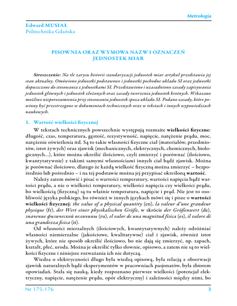 Metrologia Edward Musiał Politechnika Gdańska PISOWNIA ORAZ WYMOWA NAZW I OZNACZEŃ JEDNOSTEK MIAR Streszczenie: Na tle zarysu historii standaryzacji jednostek miar artykuł przedstawia jej stan aktualny. Omówiono jednostki podstawowe i jednostki pochodne układu SI oraz jednostki dopuszczone do stosowania z jednostkami SI. Przedstawiono i uzasadniono zasady zapisywania jednostek głównych i jednostek złożonych oraz zasady tworzenia jednostek krotnych. Wskazano możliwe nieporozumienia przy stosowaniu jednostek spoza układu SI. Podano zasady, które powinny być przestrzegane w dokumentach technicznych oraz w tekstach i innych wypowiedziach naukowych. 1. Wartość wielkości fizycznej W tekstach technicznych powszechnie występują rozmaite wielkości fizyczne: długość, czas, temperatura, gęstość, rezystywność, napięcie, natężenie prądu, moc, natężenie oświetlenia itd. Są to takie własności fizyczne ciał (materiałów, przedmiotów, istot żywych) oraz zjawisk (mechanicznych, elektrycznych, chemicznych, biologicznych…), które można określić ilościowo, czyli zmierzyć i porównać (ilościowo, kwantytatywnie) z takimi samymi własnościami innych ciał bądź zjawisk. Można je porównać ilościowo, dlatego że każdą wielkość fizyczną można zmierzyć – bezpośrednio lub pośrednio – i na tej podstawie można jej przypisać określoną wartość. Należy zatem mówić i pisać o wartości temperatury, wartości napięcia bądź wartości prądu, a nie o wielkości temperatury, wielkości napięcia czy wielkości prądu, bo wielkością (fizyczną) są tu właśnie temperatura, napięcie i prąd. Nie jest to osobliwość języka polskiego, bo również w innych językach mówi się i pisze o wartości wielkości fizycznej: the value of a physical quantity (en), la valeur d’une grandeur physique (fr), der Wert einer physikalischen Größe, w skrócie der Größenwert (de), значение физической величины (ru), el valor de una magnitud física (es), il valore di una grandezza fisica (it). Od własności mierzalnych (ilościowych, kwantytatywnych) należy odróżniać własności niemierzalne (jakościowe, kwalitatywne) ciał i zjawisk, również istot żywych, które nie sposób określić ilościowo, bo nie dają się zmierzyć, np. zapach, kształt, płeć, uroda. Można je określić tylko słownie, opisowo, a zatem nie są to wielkości fizyczne i niniejsze rozważania ich nie dotyczą. Wiedza o elektryczności długo była wiedzą opisową, była relacją z obserwacji zjawisk naturalnych bądź eksperymentów w pracowniach pasjonatów, była zbiorem opowiadań. Stała się nauką, kiedy rozpoznano pierwsze wielkości (potencjał elektryczny, napięcie, natężenie prądu, opór elektryczny) i zależności między nimi, bo Nr 175-176 3