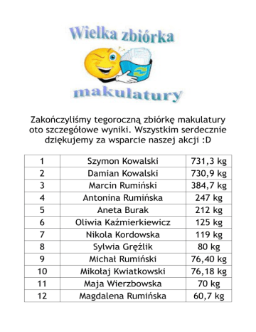 Zakończyliśmy tegoroczną zbiórkę makulatury oto szczegółowe wyniki. Wszystkim serdecznie dziękujemy za wsparcie naszej akcji :D 1 2 3 4 5 6 7 8 9 10 11 12 Szymon Kowalski Damian Kowalski Marcin Rumiński Antonina Rumińska Aneta Burak Oliwia Kaźmierkiewicz Nikola Kordowska Sylwia Gręźlik Michał Rumiński Mikołaj Kwiatkowski Maja Wierzbowska Magdalena Rumińska 731,3 kg 730,9 kg 384,7 kg 247 kg 212 kg 125 kg 119 kg 80 kg 76,40 kg 76,18 kg 70 kg 60,7 kg 13 14 15 16 17 18 19 20 21 22 23 24 25 26 27 28 29 30 31 32 33 34 35 Liliana Rumińska Zofia Wierzbowska Cyprian Gierłowski Michał Jaranowski Kamil Gierłowski Hubert Jaranowski Hubert Gorczyński Dawid Janowski Kacper Łańcucki Kacper Drzażdżewski Natalia Dąbrowska Rafał Dąbrowski Dawid Dąbrowski Kamil Botkiewicz Bartek Tejza Krystian Gorczyński Konrad Popielarski Kinga Romanowska Katarzyna Błotnicka Tina Błotnicka Szymon Błotnicki Wiktor Bolewski Czarek Błotnicki 54 kg 52 kg 50,8 kg 50 kg 47,8 kg 34 kg 34 kg 26,22 kg 25 kg 25 kg 20 kg 20 kg 20 kg 18 kg 15 kg 14,5 kg 14,50 kg 14,1 kg 11 kg 11 kg 11 kg 10,75 kg 9 kg 36 37 38 39 40 41 42 Amelia Celmer Sylwia Frącz Filip Zalewski Angelika Kowalkowska Weronika Nowak Piotr Kiełpiński Norbert Kowalkowski 7 kg 5,30 kg 5,22 kg 5 kg 2,5 kg 2,40 kg 1 kg I miejsce - klasa II – 1227,75 kg II miejsce - klasa V – 1224,02 kg III miejsce - klasa 0 – 531,48 kg IV miejsce - klasa I – 194,42 kg V miejsce - klasa III – 182,6 kg VI miejsce - klasa IV – 135,5 kg VII miejsce - klasa VI – 33,40 kg