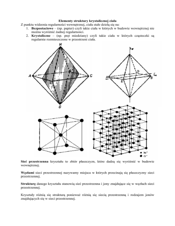 Elementy struktury krystalicznej ciała Z punktu widzenia regularności wewnętrznej, ciała stałe dzielą się na: 1. Bezpostaciowe – (np. papier) czyli takie ciała w których w budowie wewnętrznej nie można wyróżnić żadnej regularności. 2. Krystaliczne – (np. pręt miedziany) czyli takie ciała w których cząsteczki są regularnie rozmieszczone w przestrzeni ciała. Sieć przestrzenna kryształu to zbiór płaszczyzn, które dadzą się wyróżnić w budowie wewnętrznej. Węzłami sieci przestrzennej nazywamy miejsca w których przecinają się płaszczyzny sieci przestrzennej. Strukturę danego kryształu stanowią sieć przestrzenna i jony znajdujące się w węzłach sieci przestrzennej. Kryształy różnią się strukturą ponieważ różnią się siecią przestrzenną i rodzajem jonów znajdujących się w sieci przestrzennej. Substancja jest izotropowa jeżeli z każdego jej punktu w każdym kierunku ma te same własności (wygląda tak samo). Substancja jest anizotropowa jeżeli z każdego jej punktu w każdym kierunku nie ma tych samych własności (nie wygląda tak samo)