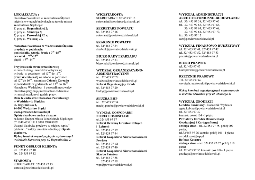LOKALIZACJA : Starostwo Powiatowe w Wodzisławiu Śląskim mieści się w trzech budynkach na terenie miasta Wodzisławia Śląskiego: 1) przy ul. Bogumińskiej 2; 2) przy ul. Mendego 3; 3) przy ul. Pszowskiej 92 a; 4) przy ul. Wałowej 30. Starostwo Powiatowe w Wodzisławiu Śląskim urzęduje w godzinach: poniedziałki, wtorki, środy : 730 -1530 czwartki : 730 -1700 piątki : 730 -1400 Przyjmowanie stron przez Starostę w ramach skarg i wniosków odbywa się w środy w godzinach od 1300 do 1600, przez Wicestarostę we wtorki w godzinach od 1200 do 1600, natomiast Członek Zarządu w poniedziałki w godzinach od 1300 do 1600. Naczelnicy Wydziałów i pozostali pracownicy Starostwa przyjmują interesantów codziennie w ramach ustalonych godzin pracy. Dane teleadresowe Starostwa Powiatowego w Wodzisławiu Śląskim: ul. Bogumińska 2, 44-300 Wodzisław Śląski www.powiatwodzislawski.pl Opłaty skarbowe można uiszczać: na konto Urzędu Miasta Wodzisławia Śląskiego: 67 1240 4357 1111 0010 3970 8909 Uwaga! Na druku przelewu w miejscu wpisu” tytułem:...” należy umieścić adnotację: Opłata skarbowa. Wykaz komórek organizacyjnych usytuowanych w siedzibie Starostwa przy ul. Bogumińskiej 2: PUNKT OBSŁUGI KLIENTA tel. 32/ 453 97 10 fax. 32/ 453 97 12 STAROSTA SEKRETARIAT: 32/ 453 97 13 [email protected] WICESTAROSTA SEKRETARIAT: 32/ 453 97 16 [email protected] SEKRETARZ POWIATU tel. 32/ 453 97 16 [email protected] SKARBNIK POWIATU tel. 32/ 453 97 34 [email protected] BIURO RADY I ZARZĄDU tel. 32/ 453 97 33 [email protected] WYDZIAŁ ORGANIZACYJNOADMINISTRACYJNY tel. 32/ 453 97 29 [email protected] Referat Organizacyjny i Kadr tel. 32/ 453 97 20 [email protected] SŁUŻBA BHP tel. 32/ 453 97 54 [email protected] WYDZIAŁ GOSPODARKI NIERUCHOMOŚCIAMI tel.32/ 453 97 57 Referat Ochrony Gruntów Rolnych i Leśnych tel. 32/ 453 97 19 tel. 32/ 453 97 44 Referat Gospodarki Nieruchomościami Powiatu tel. 32/ 453 97 61 tel. 32/ 453 97 40 Referat Gospodarki Nieruchomościami Skarbu Państwa tel. 32/ 453 97 58 32/ 453 97 59 [email protected] WYDZIAŁ ADMINISTRACJI ARCHITEKTONICZNO-BUDOWLANEJ tel. 32/ 453 97 38, 32/ 453 97 65 tel. 32/ 453 97 62, 32/ 453 97 66, 32/ 453 97 63, 32/ 453 97 68, 32/ 453 97 64, 32/ 453 97 79, fax. 32/ 453 97 12 [email protected] WYDZIAŁ FINANSOWO-BUDŻETOWY tel. 32/ 453 97 41, 32/ 453 97 42 tel. 32/ 453 97 52, 32/ 453 97 53 [email protected] BIURO PRAWNE tel. 32/ 453 97 47 [email protected] RZECZNIK PRASOWY Tel. 32/ 453 97 69 [email protected] Wykaz komórek organizacyjnych usytuowanych w siedzibie Starostwa przy ul. Mendego 3: WYDZIAŁ GEODEZJI Geodeta Powiatowy - Naczelnik Wydziału [email protected] tel. 32/ 453 97 32 kontakt: pokój 104 - I piętro Powiatowy Ośrodek Dokumentacji Geodezyjnej i Kartograficznej obsługa stron - tel. 32/453 97 75, pokój 002 parter, tel.32/453 97 76 kontakt: pokój 101 - I piętro [email protected] Referat Katastru obsługa stron – tel. 32/ 453 97 67, pokój 010 parter tel. 32/ 453 97 56 kontakt: pok.106 - I piętro [email protected] Wykaz komórek organizacyjnych usytuowanych w siedzibie Starostwa przy ul. Pszowskiej 92a: KANCELARIA tel. 32/ 453 99 69 fax. 32/ 453 99 69 CZŁONEK ZARZĄDU SEKRETARIAT: 32/ 412 09 85 [email protected] PEŁNOMOCNIK DS. SYSTEMU ZARZĄDZANIA JAKOŚCIĄ tel. 32/ 412 09 39 fax.32/ 453 99 69 [email protected] BIURO INFORMATYKI tel. 32/ 453 97 31 – ul. Bogumińska 2 32/ 453 99 87 – ul. Pszowska 92a [email protected] BIURO KONTROLI I AUDYTU WEWNĘTRZNEGO tel. 32/ 412 09 47, 32/ 412 09 50 [email protected] WYDZIAŁ KOMUNIKACJI i TRANSPORTU poniedziałek, wtorek, środa: 800-1500 czwartek: 800-1700 piątek : 800-1300 Kancelaria tel. 32/ 412 09 00, fax. 32/412 09 01 [email protected] Punkt Obsługi Klienta tel. 32/ 412 09 06 Referat Rejestracji Pojazdów tel. 32/ 412 09 12, 32/ 412 09 07, 32/ 412 09 09 Referat Praw Jazdy tel. 32/ 412 09 04 Referat Transportu tel. 32/ 412 09 13 Zarządzanie ruchem tel. 32/ 412 09 63 Opłaty za wydanie dokumentu można uiszczać na konto Starostwa Powiatowego w Wodzisławiu Śląskim: 43 1560 1094 2125 0085 5020 0036: (istnieje możliwość uiszczenia opłaty w agencji bankowej obok siedziby Starostwa przy ul. Pszowskiej 92a). WYDZIAŁ INFRASTRUKTURY TECHNICZNEJ tel. 32/ 453 99 79, 32/ 453 99 76 fax. 32/ 453 99 78 [email protected] WYDZIAŁ OŚWIATY tel./fax. 32/ 453 99 60 Referat Edukacji tel. 32/ 453 99 61, 32/ 453 99 68 [email protected] Referat Ekonomiczny tel. 32/ 453 99 64, 32/ 453 99 65 [email protected] Referat Projektów Edukacyjnych tel. 32/ 453 99 67 [email protected] WYDZIAŁ STRATEGII i ROZWOJU POWIATU tel. 32/ 412 09 41, [email protected] [email protected] Referat Kultury i Sportu tel. 32/ 412 09 62, 32/ 412 09 46 [email protected] [email protected] Inkubator Ekonomii Społecznej Subregionu Zachodniego tel. 32/ 453 99 83, [email protected] WYDZIAŁ ZDROWIA i POLITYKI SPOŁECZNEJ tel. 32/ 453 99 71 fax. 32/ 453 99 75 [email protected] WYDZIAŁ OBYWATELSKI, OCHRONY INFORMACJI NIEJAWNYCH i ZARZĄDZANIA KRYZYSOWEGO tel. 32/ 412 09 71, 32/ 412 09 72 [email protected] POWIATOWE CENTRUM ZARZĄDZANIA KRYZYSOWEGO ul. Pszowska 68, 44-300 Wodzisław Śląski tel. 32/ 453 93 93, 32/ 453 93 80 fax. 32/ 453 93 92 [email protected] [email protected] WYDZIAŁ OCHRONY ŚRODOWISKA tel. 32/ 412 09 54, 32/ 412 09 55, 32/ 412 09 56, 32/ 412 09 57, 32/ 412 09 58, 32/ 412 09 59, 32/ 412 09 60 [email protected] WYDZIAŁ ZAMÓWIEŃ PUBLICZNYCH tel. 32/ 412 09 30, 32/ 412 09 32 fax. 32/ 412 09 31 [email protected] BIURO POWIATOWEGO RZECZNIKA KONSUMENTÓW poniedziałek, wtorek: 930 - 1530 środa: nie przyjmuje czwartek: 930 – 1700 piątek : 930 – 1400 tel. 32/ 453 99 62 [email protected] Wykaz komórek organizacyjnych usytuowanych w siedzibie Starostwa przy ul. Wałowej 30 : POWIATOWY ZESPÓŁ DS. ORZEKANIA O NIEPEŁNOSPRAWNOŚCI W WODZISŁAWIU ŚLĄSKIM tel. 32/ 455 14 30 wew.43 [email protected] Data aktualizacji : 06.05.2014r.