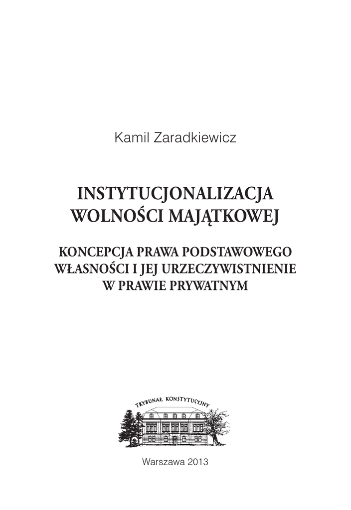 Kamil Zaradkiewicz Instytucjonalizacja wolności majątkowej Koncepcja prawa podstawowego własności i jej urzeczywistnienie w prawie prywatnym Warszawa 2013 Niniejsza publikacja ukazuje się jako tom XLV Studiów i Materiałów Trybunału Konstytucyjnego Redakcja i korekta techniczna: Biblioteka Trybunału Konstytucyjnego Projekt graficzny okładki: Zygmunt Zaradkiewicz Recenzja wydawnicza: Dr hab. prof. UW Mirosław Wyrzykowski Afiliacja autora: Uniwersytet Warszawski Copyright by Biuro Trybunału Konstytucyjnego, Warszawa 2013 ISBN: 978-83-87515-69-0 ISSN: 1426-1030 Nakład: 200 egz. Wydawca: Biuro Trybunału Konstytucyjnego 00-918 Warszawa, Al. J.Ch. Szucha 12a www.trybunal.gov.pl Skład, druk i oprawa: Pracownia C&C Sp. z o.o. www.pracowniacc.pl spis treści Ważniejsze skróty����������������������������������������������������������������������������������������������� 8 Wstęp ��������������������������������������������������������������������������������������������������������������� 11 Rozdział I. Idea własności i przyporządkowanie dóbr majątkowych������������� 15 1.1. Własność – idea i prawo������������������������������������������������������������������������� 15 1.1.1. Własność jako idea����������������������������������������������������������������������� 15 1.1.2. Własność jako instytucja prawa cywilnego – zarys ujęcia ������������� 27 1.2. Własność jako prawo człowieka������������������������������������������������������������� 48 1.3. Konstytucja a prawo cywilne ����������������������������������������������������������������� 61 1.4. Bezpośrednie stosowanie art. 21 i 64 Konstytucji����������������������������������� 64 1.5. W łasność jako konstytucyjne prawo wolnościowe – zarys problematyki�����71 1.5.1. Funkcje i cele prawa podstawowego własności ����������������������������� 71 1.5.2. Ochrona przyporządkowania dóbr����������������������������������������������� 75 1.5.3. Własność a wolność majątkowa – zarys problematyki������������������� 78 1.5.4. Własność jako konstytucyjne prawo podstawowe ����������������������� 80 1.5.5. Prawo wolnościowe, obronne, negatywne������������������������������������� 89 1.6. Konstytucyjna ochrona własności podmiotów publicznych ������������������� 96 1.7. Wnioski����������������������������������������������������������������������������������������������� 114 Rozdział II. Własność a swoboda dysponowania dobrami majątkowymi ��� 121 2.1. Wolność a prawo��������������������������������������������������������������������������������� 121 2.1.1. Wolność jako wartość konstytucyjna ����������������������������������������� 121 2.1.2. Autonomia woli ����������������������������������������������������������������������� 124 2.1.3. Konstytucyjne wolności podstawowe����������������������������������������� 126 2.2. Wolnościowy wymiar własności����������������������������������������������������������� 132 2.3. Konstytucyjne prawo do własności������������������������������������������������������� 137 2.3.1. „Prawo do własności” a wolność majątkowa������������������������������� 137 2.3.2. Wolność majątkowa a dziedziczenie������������������������������������������� 148 2.3.3. Wolność a przymus korzystania z własności������������������������������� 165 Rozdział III. Konstytucyjne prawo własności i inne prawa majątkowe – treść i zakres ����������
