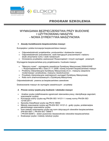 PROGRAM SZKOLENIA WYMAGANIA BEZPIECZEŃSTWA PRZY BUDOWIE I UŻYTKOWANIU MASZYN - NOWA DYREKTYWA MASZYNOWA 1. Zasady kształtowania bezpieczeństwa maszyn Europejska i polska koncepcja bezpieczeństwa maszyn • • • Odpowiedzialność projektantów, producentów i dostawców maszyn Odpowiedzialność pracodawców, osób kierujących pracownikami i nadzoru służb utrzymania ruchu i osób narażonych Omówienie przykładów zastosowań Rozporządzeń i innych wymagań prawnych Wymagania bezpieczeństwa przy projektowaniu i budowie maszyn • • • • "Maszyny nowe" - wymagania zasadnicze Dyrektywy Maszynowej 2006/42/WE i Rozporządzenia MG z dnia 21.11.2008. rozwój inżynierii bezpieczeństwa maszyn Problemy interpretacyjne Dyrektywy Maszynowej (m.in.: maszyny zespolone modernizacje i przebudowy, maszyny nieukończone) Przykłady interpretacyjne ważniejszych wymagań Dyrektywy Maszynowej Rola norm zharmonizowanych z Dyrektywą Maszynową Odpowiedzialność prawna za bezpieczeństwo zawodowe Dostosowanie maszyn do wymogów zasadniczych - przykłady 2. Proces oceny ryzyka przy budowie i obsłudze maszyn • • • • • • Analiza ryzyka (zdefiniowanie ograniczeń stanowiska pracy; identyfikacja zagrożeń; szacowanie ryzyka) Koncepcja oceny ryzyka wg PN-EN ISO 14121-1 i nowej normy PN-EN ISO 12100:2011 Sposoby klasyfikacji ryzyka wg PN-N-18002 Metody szacowania ryzyka wg PN-EN ISO 14121-2 - grafy ryzyka, problematyka jakościowego szacowania ryzyka Inne metody szacowania ryzyka wg norm dotyczących obwodów bezpieczeństwa (PN-EN 954-1, PN-EN ISO 13849-1 i PN-EN 62061) - dobór poziomów niezawodności obwodów bezpieczeństwa Ewaluacja ryzyka i metody redukcji ryzyka 3. Techniczne środki kształtowania bezpieczeństwa • • • • • • • Zasady doboru, instalowania i eksploatowania technicznych środków bezpieczeństwa Urządzenia ochronne odgradzające - osłony i ograniczniki Urządzenia ochronne nieodgradzające bezdotykowe i czułe na nacisk Urządzenia i aspekty funkcjonalne bezpieczeństwa maszyn Wymagania bezpieczeństwa układów sterowania maszyn Środki informowania i ostrzegania Przykłady zastosowania technicznych środków bezpieczeństwa w celu redukcji ryzyka do poziomu akceptowalnego 4. Wymagania bezpieczeństwa układów sterowania maszyn • • • Szacowanie ryzyka w celu doboru parametrów niezawodnościowych obwodów bezpieczeństwa (KAT, PL, SIL) praca na wybranych przykładach Kategorie niezawodnościowe obwodów bezpieczeństwa wg PN-EN 954-1 i PN-EN ISO 13849-1 Określenie współczynników niezawodnościowych elementów bezpieczeństwa wg PN-EN ISO 13849-1 5. Warsztaty z oceny ryzyka • • • • • Ocena stanu bezpieczeństwa maszyn i ich układów sterowania (konstrukcja, techniczne środki bezpieczeństwa, informowanie i ostrzeganie Szacowanie ryzyka Ocena / akceptowalność poziomu ryzyka Wypełnianie karty oceny ryzyka maszyn Zarządzanie bezpieczeństwem maszyn przy użyciu narzędzi informatycznych (CMMS MASZYNA) 6. Wykładowcy • • • • dr inż. Stanisław Kowalewski – ELOKON Polska mgr inż. Wojciech Bernadkiewicz – TECH-SYSTEM mgr inż. Markus Kusiak – ELOKON Polska mgr inż. Włodzimierz Łapanowski – Państwowa Inspekcja Pracy – Nadzór Rynku 7. Miejsce szkolenia HOTEL MIŁOMŁYN ZDRÓJ 14-140 MIŁOMŁYN ul. OSTRÓDZKA 2B 8. Adresat szkolenia • Kadra zarządzająca, projektanci maszyn i stanowisk pracy, technolodzy, służby utrzymania ruchu, służby systemów zarządzania bezpieczeństwem, jakością i środowiskiem, inspektorzy pracy, pracownicy urzędów celnych 9. Termin 22-23.03.2012