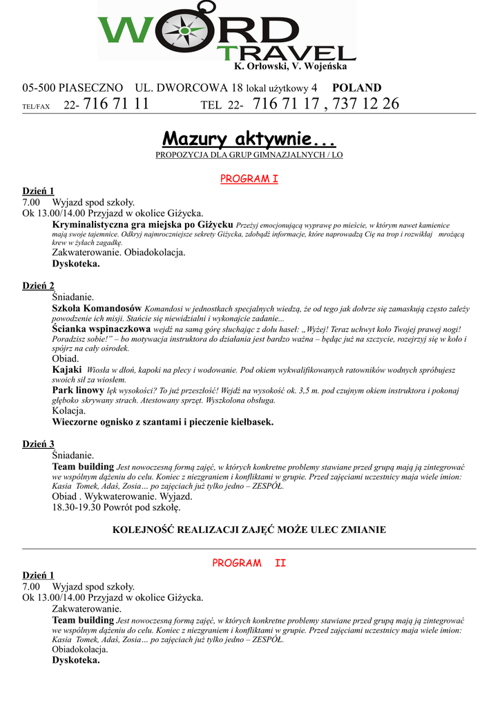 K. Orłowski, V. Wojeńska 05-500 PIASECZNO UL. DWORCOWA 18 lokal użytkowy 4 TEL/FAX 22- 716 71 11 TEL 22- 716 71 17 POLAND , 737 12 26 Mazury aktywnie... PROPOZYCJA DLA GRUP GIMNAZJALNYCH / LO PROGRAM I Dzień 1 7.00 Wyjazd spod szkoły. Ok 13.00/14.00 Przyjazd w okolice Giżycka. Kryminalistyczna gra miejska po Giżycku Przeżyj emocjonującą wyprawę po mieście, w którym nawet kamienice mają swoje tajemnice. Odkryj najmroczniejsze sekrety Giżycka, zdobądź informacje, które naprowadzą Cię na trop i rozwikłaj mrożącą krew w żyłach zagadkę. Zakwaterowanie. Obiadokolacja. Dyskoteka. Dzień 2 Śniadanie. Szkoła Komandosów Komandosi w jednostkach specjalnych wiedzą, że od tego jak dobrze się zamaskują często zależy powodzenie ich misji. Stańcie się niewidzialni i wykonajcie zadanie... Ścianka wspinaczkowa wejdź na samą górę słuchając z dołu haseł: „Wyżej! Teraz uchwyt koło Twojej prawej nogi! Poradzisz sobie!” – bo motywacja instruktora do działania jest bardzo ważna – będąc już na szczycie, rozejrzyj się w koło i spójrz na cały ośrodek. Obiad. Kajaki Wiosła w dłoń, kapoki na plecy i wodowanie. Pod okiem wykwalifikowanych ratowników wodnych spróbujesz swoich sił za wiosłem. Park linowy lęk wysokości? To już przeszłość! Wejdź na wysokość ok. 3,5 m. pod czujnym okiem instruktora i pokonaj głęboko skrywany strach. Atestowany sprzęt. Wyszkolona obsługa. Kolacja. Wieczorne ognisko z szantami i pieczenie kiełbasek. Dzień 3 Śniadanie. Team building Jest nowoczesną formą zajęć, w których konkretne problemy stawiane przed grupą mają ją zintegrować we wspólnym dążeniu do celu. Koniec z niezgraniem i konfliktami w grupie. Przed zajęciami uczestnicy maja wiele imion: Kasia Tomek, Adaś, Zosia… po zajęciach już tylko jedno – ZESPÓŁ. Obiad . Wykwaterowanie. Wyjazd. 18.30-19.30 Powrót pod szkołę. KOLEJNOŚĆ REALIZACJI ZAJĘĆ MOŻE ULEC ZMIANIE PROGRAM II Dzień 1 7.00 Wyjazd spod szkoły. Ok 13.00/14.00 Przyjazd w okolice Giżycka. Zakwaterowanie. Team building Jest nowoczesną formą zajęć, w których konkretne problemy stawiane przed grupą mają ją zintegrować we wspólnym dążeniu do celu. Koniec z niezgraniem i konfliktami w grupie. Przed zajęciami uczestnicy maja wiele imion: Kasia Tomek, Adaś, Zosia… po zajęciach już tylko jedno – ZESPÓŁ. Obiadokolacja. Dyskoteka. Dzień 2 Śniadanie. ABC Żeglarstwa Poczuj wiatr w żaglach i spróbuj swych sił za sterem. Teraz już wiesz, czym są cumy, fok, grot, keja i żadne komendy nie są już straszne! Pod okiem instruktora staniesz się prawdziwym Wilkiem Morskim i poznasz w praktyce smak żeglarskiej przygody! Zajęcia odbywają się pod okiem doświadczonych instruktorów żeglarstwa. Chrzest żeglarza - przygotuj się na spotkanie z samym Neptunem. Wymaluj całą buzię, przygotuj dary i przejdź prawdziwy chrzest bojowy by móc godnie przyjąć swe wodne imię. Obiad Symulacyjna gra medyczna To nie jest zwykła gra. Innowacyjne zajęcia, których celem jest integracja zespołu, praca zespołowa oraz dostarczenie praktycznej wiedzy i umiejętności medycznych. To idealny sprawdzian wytrzymałości, odwagi i odporności na stres! Pierwsza pomoc Weź sprawy w swoje ręce i dowiedz się jak prawidłowo oceniać stan poszkodowanego, wezwać pogotowie i udzielić pierwszej pomocy. Zajęcia w praktyce utrwalą zdobytą wiedzę. Zajęcia prowadzone pod okiem Ratownika Medycznego. Ta wiedza ratuje życie! Kolacja Wieczorne ognisko z szantami i pieczenie kiełbasek. Dzień 3 Śniadanie. Architekci i konstruktorzy najpierw kask i rękawiczki – w takiej pracy jest to podstawa bezpieczeństwa – dalej plan konstrukcji, zebranie materiałów i budowa! Co to będzie? Tor do MiniGolfa? Basen? Kto wie… Obiad. Wykwaterowanie. Wyjazd. 18.30-19.30 Powrót pod szkołę. KOLEJNOŚĆ REALIZACJI ZAJĘĆ MOŻE ULEC ZMIANIE PROGRAM III Dzień 1 7.00 Wyjazd spod szkoły. Ok 13.00/14.00 Przyjazd w okolice Giżycka. Zakwaterowanie. Survival Złóżcie dary Duchom Lasu, stwórzcie swój obóz i poczujcie się chociaż raz w życiu niczym Bear Grylls, który potrafi przetrwać wszystko! Obiadokolacja. Mission impossible Dobre planowanie to podstawa sukcesu wielu akcji. W świecie gry ta umiejętność będzie kluczowa, aby odbić wyjątkowo ważnego agenta. Sprawdźcie sami kto to i kto go porwał. Dzień 2 Śniadanie. Mistrz smaku Spektakularny kulinarny pojedynek, wielkie emocje i pyszne jedzenie. Kto zdobędzie miano Mistrza Smaku? Może Ty? Architekci i konstruktorzy najpierw kask i rękawiczki – w takiej pracy jest to podstawa bezpieczeństwa – dalej plan konstrukcji, zebranie materiałów i budowa! Co to będzie? Tor do Mini Golfa? Basen? Kto wie… Obiad. Pierwsza pomoc Weź sprawy w swoje ręce i dowiedz się jak prawidłowo oceniać stan poszkodowanego, wezwać pogotowie i udzielić pierwszej pomocy. Zajęcia w praktyce utrwalą zdobytą wiedzę. Zajęcia prowadzone pod okiem Ratownika Medycznego. Ta wiedza ratuje życie! Intelshow jeżeli szukasz świetnej alternatywy na wieczór wybierz Talent Show, na którym w światłach reflektorów każdy będzie mógł zaprezentować to w czym jest naprawdę dobry! Kolacja. Gra nocna po Twierdzy Boyen Poznanie sekretów Twierdzy Boyen z okresu I Wojny Światowej wymaga sporej odwagi. Szczególnie, jeśli rzecz dzieje się w nocy. Wejdź w świat meldunków, agentów i sekretnych przejść, aby rozwikłać zagadkę sprzed lat. Dzień 3 Śniadanie. Dzika kuchnia do jednego gara wrzucamy wszystko co zdrowe, ekologiczne i nadające się do jedzenia. Pokażemy, że zielona kuchnia to nie przeżytek, a godny uwagi rarytas. Obiad. Wykwaterowanie. Wyjazd. 18.30-19.30 Powrót pod szkołę. KOLEJNOŚĆ REALIZACJI ZAJĘĆ MOŻE ULEC ZMIANIE Świadczenia: - transport lux autokarem marki, np. Mercedes, Volvo, Scania, MAN, Neoplan z WC, DVD, barkiem, uchylnymi siedzeniami - zakwaterowanie w hotelu, pensjonacie, ośrodk
