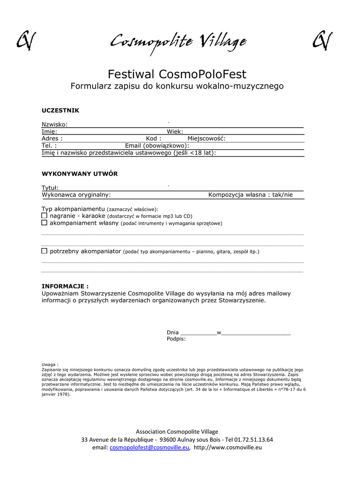 Festiwal CosmoPoloFest Formularz zapisu do konkursu wokalno-muzycznego UCZESTNIK Nzwisko: ˙ Imię: Wiek: Adres : Kod : Miejscowość: Tel. : Email (obowiązkowo): Imię i nazwisko przedstawiciela ustawowego (jeśli <18 lat): WYKONYWANY UTWÓR Tytuł: Wykonawca oryginalny: ˙ Kompozycja własna : tak/nie Typ akompaniamentu (zaznaczyć właściwe): nagranie - karaoke (dostarczyć w formacie mp3 lub CD) akompaniament własny (podać intrumenty i wymagania sprzętowe) potrzebny akompaniator (podać typ akompaniamentu – pianino, gitara, zespół itp.) INFORMACJE : Upoważniam Stowarzyszenie Cosmopolite Village do wysyłania na mój adres mailowy informacji o przyszłych wydarzeniach organizowanych przez Stowarzyszenie. Dnia ___________w_____________________ Podpis: Uwaga : Zapisanie się niniejszego konkursu oznacza domyślną zgodę uczestnika lub jego przedstawiciela ustawowego na publikację jego zdjęć z tego wydarzenia. Możliwe jest wysłanie sprzeciwu wobec powyższego drogą pocztową na adres Stowarzyszenia. Zapis oznacza akceptację regulaminu wewnętrznego dostępnego na stronie cosmoville.eu. Informacje z niniejszego dokumentu będą przetwarzane informatycznie. Jest to niezbędne do umieszczenia na liście uczestników konkursu. Mają Państwo prawo wglądu, modyfikowania, poprawiania i usuwania danych Państwa dotyczących (art. 34 de la loi « Informatique et Libertés » n°78-17 du 6 janvier 1978). Association Cosmopolite Village 33 Avenue de la République - 93600 Aulnay sous Bois - Tel 01.72.51.13.64 email: [email protected], http://www.cosmoville.eu