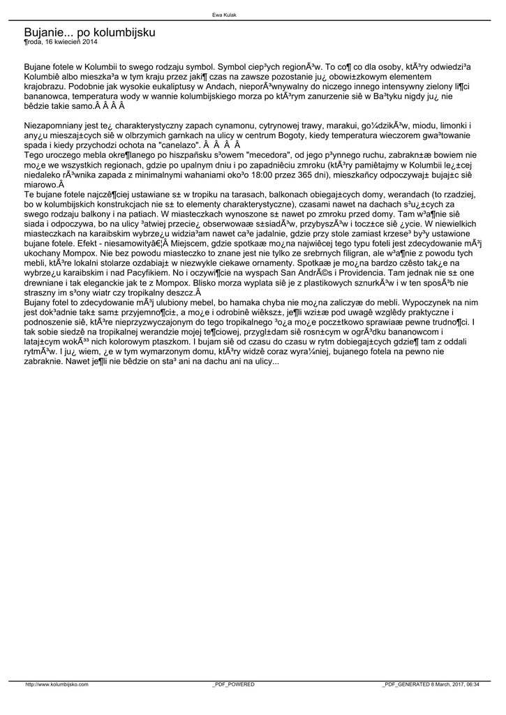 Ewa Kulak Bujanie... po kolumbijsku ¶roda, 16 kwiecieñ 2014 Bujane fotele w Kolumbii to swego rodzaju symbol. Symbol ciep³ych regionów. To co¶ co dla osoby, który odwiedzi³a Kolumbiê albo mieszka³a w tym kraju przez jaki¶ czas na zawsze pozostanie ju¿ obowi±zkowym elementem krajobrazu. Podobnie jak wysokie eukaliptusy w Andach, nieporównywalny do niczego innego intensywny zielony li¶ci bananowca, temperatura wody w wannie kolumbijskiego morza po którym zanurzenie siê w Ba³tyku nigdy ju¿ nie bêdzie takie samo.    Niezapomniany jest te¿ charakterystyczny zapach cynamonu, cytrynowej trawy, marakui, go¼dzików, miodu, limonki i any¿u mieszaj±cych siê w olbrzymich garnkach na ulicy w centrum Bogoty, kiedy temperatura wieczorem gwa³towanie spada i kiedy przychodzi ochota na "canelazo".     Tego uroczego mebla okre¶lanego po hiszpañsku s³owem "mecedora", od jego p³ynnego ruchu, zabrakn±æ bowiem nie mo¿e we wszystkich regionach, gdzie po upalnym dniu i po zapadniêciu zmroku (który pamiêtajmy w Kolumbii le¿±cej niedaleko równika zapada z minimalnymi wahaniami oko³o 18:00 przez 365 dni), mieszkañcy odpoczywaj± bujaj±c siê miarowo. Te bujane fotele najczê¶ciej ustawiane s± w tropiku na tarasach, balkonach obiegaj±cych domy, werandach (to rzadziej, bo w kolumbijskich konstrukcjach nie s± to elementy charakterystyczne), czasami nawet na dachach s³u¿±cych za swego rodzaju balkony i na patiach. W miasteczkach wynoszone s± nawet po zmroku przed domy. Tam w³a¶nie siê siada i odpoczywa, bo na ulicy ³atwiej przecie¿ obserwowaæ s±siadów, przybyszów i tocz±ce siê ¿ycie. W niewielkich miasteczkach na karaibskim wybrze¿u widzia³am nawet ca³e jadalnie, gdzie przy stole zamiast krzese³ by³y ustawione bujane fotele. Efekt - niesamowity… Miejscem, gdzie spotkaæ mo¿na najwiêcej tego typu foteli jest zdecydowanie mój ukochany Mompox. Nie bez powodu miasteczko to znane jest nie tylko ze srebrnych filigran, ale w³a¶nie z powodu tych mebli, które lokalni stolarze ozdabiaj± w niezwykle ciekawe ornamenty. Spotkaæ je mo¿na bardzo czêsto tak¿e na wybrze¿u karaibskim i nad Pacyfikiem. No i oczywi¶cie na wyspach San Andrés i Providencia. Tam jednak nie s± one drewniane i tak eleganckie jak te z Mompox. Blisko morza wyplata siê je z plastikowych sznurków i w ten sposób nie straszny im s³ony wiatr czy tropikalny deszcz. Bujany fotel to zdecydowanie mój ulubiony mebel, bo hamaka chyba nie mo¿na zaliczyæ do mebli. Wypoczynek na nim jest dok³adnie tak± sam± przyjemno¶ci±, a mo¿e i odrobinê wiêksz±, je¶li wzi±æ pod uwagê wzglêdy praktyczne i podnoszenie siê, które nieprzyzwyczajonym do tego tropikalnego ³o¿a mo¿e pocz±tkowo sprawiaæ pewne trudno¶ci. I tak sobie siedzê na tropikalnej werandzie mojej te¶ciowej, przygl±dam siê rosn±cym w ogródku bananowcom i lataj±cym wokó³ nich kolorowym ptaszkom. I bujam siê od czasu do czasu w rytm dobiegaj±cych gdzie¶ tam z oddali rytmów. I ju¿ wiem, ¿e w tym wymarzonym domu, który widzê coraz wyra¼niej, bujanego fotela na pewno nie zabraknie. Nawet je¶li nie bêdzie on sta³ ani na dachu ani na ulicy... http://www.kolumbijsko.com _PDF_POWERED _PDF_GENERATED 8 March, 2017, 06:34