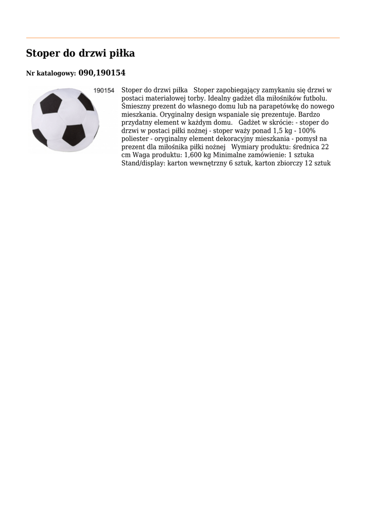 Stoper do drzwi piłka Nr katalogowy: 090,190154 Stoper do drzwi piłka Stoper zapobiegający zamykaniu się drzwi w postaci materiałowej torby. Idealny gadżet dla miłośników futbolu. Śmieszny prezent do własnego domu lub na parapetówkę do nowego mieszkania. Oryginalny design wspaniale się prezentuje. Bardzo przydatny element w każdym domu. Gadżet w skrócie: - stoper do drzwi w postaci piłki nożnej - stoper waży ponad 1,5 kg - 100% poliester - oryginalny element dekoracyjny mieszkania - pomysł na prezent dla miłośnika piłki nożnej Wymiary produktu: średnica 22 cm Waga produktu: 1,600 kg Minimalne zamówienie: 1 sztuka Stand/display: karton wewnętrzny 6 sztuk, karton zbiorczy 12 sztuk