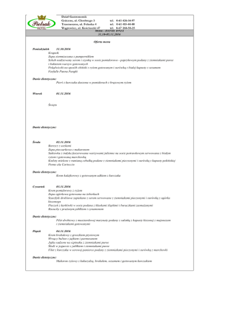 Dział Gastronomii: Gniezno, ul. Chrobrego 3 tel. 0-61 426-14-97 Trzemeszno, ul. Foluska 4 tel. 0-61 415-44-00 Wągrowiec, ul. Kościuszki 47 tel. 0-67 268-58-25 Menu - DANIE DNIA 31.10-05.11.2016 Oferta menu Poniedziałek 31.10.2016 Krupnik Zupa ziemniaczana z pumperniklem Schab nadziewany serem i szynką w sosie pomidorowo - paprykowym podany z ziemniakami puree i bukietem warzyw gotowanych Polędwiczki na sposób chiński z ryŜem gotowanym i surówką z białej kapusty z sezamem Farfalle Panna Funghi Danie dietetyczne: Pierś z kurczaka duszona w pomidorach z brązowym ryŜem Wtorek 01.11.2016 Święto Danie dietetyczne: Środa 02.11.2016 Barszcz z uszkami Zupa pieczarkowa z makaronem Sakiewka z indyka faszerowana warzywami julienne na sosie potrawkowym serwowana z białym ryŜem i gotowaną marchewką Kotlety mielone z rumianą cebulką podane z ziemniakami pieczonymi i surówką z kapusty pekińskiej Penne ala Cartoccio Danie dietetyczne: Krem kalafiorowy z gotowanym udkiem z kurczaka Czwartek 03.11.2016 Krem pomidorowy z ryŜem Zupa ogórkowa gotowana na Ŝeberkach Szaszłyki drobiowe zapiekane z serem serwowane z ziemniakami pieczonymi i surówką z ogórka kiszonego Pieczeń z karkówki w sosie podana z kluskami śląskimi i buraczkami zasmaŜanymi Racuchy z praŜonym jabłkiem i cynamonem Danie dietetyczne: Filet drobiowy z musztardowej marynaty podany z sałatką z kapusty kiszonej z majonezem i ziemniakami gotowanymi Piątek 04.11.2016 Krem brokułowy z groszkiem ptysiowym Wrzący bulion z jajkiem i parmezanem Jajka sadzone na szpinaku z ziemniakami puree Śledź w jogurcie z jabłkiem i ziemniakami puree Filet z kurczaka w serowej panierce podany z ziemniakami pieczonymi i surówką z marchewki Danie dietetyczne: Makaron ryŜowy z kukurydzą, brokułem, sezamem i gotowanym kurczakiem Dział Gastronomii: Gniezno, ul. Chrobrego 3 tel. 0-61 426-14-97 Trzemeszno, ul. Foluska 4 tel. 0-61 415-44-00 Wągrowiec, ul. Kościuszki 47 tel. 0-67 268-58-25 Menu - DANIE DNIA 31.10-05.11.2016 Sobota 05.11.2016 Zupa z Ŝółtej fasoli szparagowej śurek staropolski na naturalnym zakwasie śołądki drobiowe w sosie koperkowym z białym ryŜem i gotowaną marchewką Kotlet schabowy po wiejsku z ziemniakami gotowanymi i surówką Colesłav Pierogi z serem z sosem jogurtowym Danie dietetyczne: Kurczak w sosie teyraki na brązowym ryŜu z warzywami na sposób chiński Przygotowała Iwona Nawrocka Manager Hotelu Oferta jest propozycją wstępną. Hotel moŜe wprowadzić zmiany w powyŜszej ofercie.
