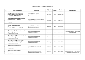 PLAN WYDAWNICZY NA ROK 2015 Lp. Tytuł/Autor/Redaktor Recenzent Objętość Nakład [ark. wyd./str. ] Termin złożenia 1. „Biologiczne uwarunkowania chorób cywilizacyjnych. Część I. Miażdżyca” K. Czyżewska, M. Kramkowska prof. dr hab. Alina Woźniak prof. dr hab. Maria Iskra 80 stron 200 III-IV kw. 2015 2. „Pharmacokinetics. Laboratory practical Course for Pharm.D. students” Red. F. Główka prof. dr hab. Barbara Gawrońska-Szklarz dr hab. Maria Walczak 100 stron 120 II kw. 2015 3. „Metody badawcze biofizyki” Red. L. Kubisz, P. Piskunowicz, M. Tuliszka prof. dr hab. Grażyna Olchowik prof. dr hab. Feliks Jaroszyk 300 stron 300 IV kw. 2015 4. „Parasitology. Workbook for students of 6-year MD program” A. Majewska, P. Nowosad prof. dr hab. Piotr Kurnatowski dr hab. Joanna Stańczak 55 stron online II kw. 2015 5. „Zeszyt do ćwiczeń. Biologia pasożytów dla studentów farmacji” A. Majewska, P. Nowosad prof. dr hab. Piotr Kurnatowski dr hab. Joanna Stańczak 56 stron online I kw. 2015 6. „Zeszyt do ćwiczeń. Parazytologia dla studentów kierunku lekarskiego” A. Majewska, P. Nowosad prof. dr hab. Piotr Kurnatowski dr hab. Joanna Stańczak 53 strony online I kw. 2015 7. „Zdrowie publiczne w zarysie” Red. T. Maksymiuk prof. dr hab. Jerzy Marcinkowski 150 stron 500 I kw. 2015 8. „Medycyna w cieniu nazizmu” Red. M. Musielak prof. dr hab. Janusz Rybakowski dr hab. Jaromir Jeszke prof. UAM 400 stron 300 III kw. 2015 Uwagi Komisji Finansowanie: fundusz anglojęzyczny 500-04-01123180 Współfinansowanie: środki Katedry Nauk Społecznych ok 6000,00 9. „Wydział Nauk o Zdrowiu Uniwersytetu im. Karola Marcinkowskiego w Poznaniu w latach 1975-2015. Czterdzieści lat w służbie prof. dr hab. Krzysztof Wiktorowicz uniwersyteckich nauk medycznych” prof. dr hab. Lechosław Dworak Red. M. Musielak, W. Samborski 500 stron 600 I kw. 2015 10. „Liczba w medycynie i kulturze świata Biblii” B. Pawlaczyk ks. prof. dr hab. Bogdan Poniży 150 stron 300 II kw. 2015 11. „Podstawy patofizjologii dla dietetyków” Red. J. Witowski prof. dr hab. Marian Grzymisławski prof. dr hab. Maria Iskra 140 stron 400 IV kw. 2015 12. „Ultrasonografia głowy i szyi” Red. Ł. Łuczewski prof. dr hab. Maciej Misiołek dr hab. Agnieszka Trojanowska 130 stron 1000 I kw. 2016 prof. dr hab. Edmund Grześkowiak prof. dr hab. Jolanta Helena Kotlińska 300 stron 600 2015/2016 prof. dr hab. Krzysztof Stachewicz 200 stron 100 I kw. 2015 prof. dr hab. Marek Wesołowski 250 stron 300 III kw. 2015 prof. dr hab. Jacek Dutkiewicz 300 stron Wyd. Online prof. dr hab. Jadwiga Mielcarek prof. dr hab. Maria Iskra 160 stron 300 13. 14. 15. 16. 17. „Wstęp do farmakologii ogólnej i podstawy receptury dla studentów medycyny” Red. T. Bobkiewicz-Kozłowska „Etyka, bioetyka, medycyna – zagadnienia wybrane” Red. G. Jarząbek-Bielecka „Analiza instrumentalna” Red. Z.J. Kokot „Higiena, ergonomia i medycyna pracy w pielęgniarstwie i ratownictwie medycznym. Zagadnienia wybrane” Red. B. Bilski „Wprowadzenie do technologii jednostkowych procesów fizycznych i bioprocesów oraz nanotechnologii” Red. T. Gośliński, T. Koczorowski, M. Wierzchowski Finansowanie: Grant naukowy WCO Finansowanie własne Zgoda na wydanie papierowe na żądanie Przeniesiono z planu na rok 2014 IV kw. 2015 Przeniesiono z planu na rok 2014 18. 19. 20. „Praktyczna okulistyka dziecięca – dla okulistów, pediatrów i studentów medycyny” Red. A. Gotz-Więckowska „Chemia medyczna / Chemia leków. Leki – aktywność biologiczna, mechanizmy działania, zastosowanie” M. Zając, A. Jelińska, I. Muszalska „Skrypt do ćwiczeń z ortopedii z elementami traumatologii narządu ruchu dla studentów Wydziału Lekarskiego” Red. T. Kotwicki, L. Romanowski, J. Kaczmarczyk prof. dr hab. Wojciech Cichy 200 stron 500 Przeniesiono z planu na rok 2014 prof. dr hab. Jerzy Pałka prof. dr hab. Anna Gumieniczek 600 stron 600 II kw. 2015 Przeniesiono z planu na rok 2014 prof. dr hab. Andrzej Szulc prof. dr hab. Andrzej Pucher 200 stron Wyd. online IV kw. 2015 Przeniesiono z planu na rok 2014 21. „Audiologia kliniczna. Zarys” – wydanie V Red. A. Pruszewicz, A. Obrębowski prof. dr hab. Edward Hojan 706 stron 600 Przeniesiono z planu na rok 2014 22. „Anatomia kliniczna układu nerwowego” Red. W. Woźniak prof. dr hab. Barbara Steinborn dr hab. Henryk Witmanowski 300 stron 600 Przeniesiono z planu na rok 2014 prof. dr hab. Teresa Torlińska prof. dr hab.Włodzimierz Samborski 250 stron 300 Przeniesiono z planu na rok 2014 prof. dr hab. Leon Drobnik 130 stron 300 Przeniesiono z planu na rok 2014 prof. dr hab. Edward Jeliński dr hab. Jarosław Barański 200 stron 150 Przeniesiono z planu na rok 2014 Finansowanie kosztów recenzji ze środków Katedry Nauk Społecznych Wyd. online W przypadku, gdy książka będzie wykorzystana na egzaminie lub zaliczeniu, zgodna na wydanie papierowe na żądanie Przeniesiono z planu na rok 2014 23. 24. „Anatomia czynnościowa – podręcznik dla studentów fizjoterapii i ratownictwa medycznego” W. Woźniak, M. Bruska „First Aid” – wydanie II uaktualnione M. Grześkowiak, J. Rosada-Kurasińska, R. Podlewski 25. „Kazimierz Filip Wize (1873-1953) – lekarz i filozof. Zarys biografii intelektualnej” Red. M. Musielak 26. „Humanizm w medycynie” Red. B. Stelcer, W. Strzelecki prof. dr hab. Michał Musielak dr hab. Ewa Mojs prof. UM 230 stron 27. „Choroby zakaźne podręcznik dla studentów” Red. I. Mozer-Lisewska, A. Kowala-Piaskowska prof. dr hab. Aldona Kasprzak 300 stron 300 28. „Zarys foniatrii klinicznej” A. Pruszewicz, A. Obrębowski prof. dr hab. Grażyna Mielnik-Niedzielska prof. dr hab. Jarosław Markowski 800 stron 1000 II kw. 2015 Przeniesiono z planu na rok 2014 dr hab. Henryk Witmanowski, prof. UM prof. dr hab. Leszek Kubisz 250 stron 800 II kw. 2015 Przeniesiono z planu na rok 2014 prof. dr hab. Wiesław Bryl 350 stron 300 I kw. 2015 Przeniesiono z