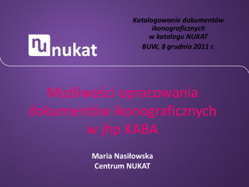 Katalogowanie dokumentów ikonograficznych w katalogu NUKAT BUW, 8 grudnia 2011 r. Możliwości opracowania dokumentów ikonograficznych w jhp KABA Maria Nasiłowska Centrum NUKAT Sposoby opracowania dokumentu z wykorzystaniem jhp KABA 1. Opracowanie przedmiotowe • wskazuje na przedmiot treści dokumentu • nie stosuje się do literatury pięknej, fundamentalnych dzieł filozoficznych, dzieł muzycznych 2. Opracowanie z wykorzystaniem haseł w funkcji tematu formalnego • wskazuje na formę treści dokumentu • nie stosuje się do monografii o treści informacyjnej Dokumenty opracowywane z wykorzystaniem jhp KABA 1. Opracowanie wyłącznie przedmiotowe: monografie informacyjne 2. Opracowanie z wykorzystaniem haseł w funkcji tematu formalnego, rzadko opracowanie przedmiotowe: literatura piękna, dokumenty muzyczne, filmy 3. Opracowanie z wykorzystaniem haseł w funkcji tematu formalnego, równolegle z opracowaniem przedmiotowym: dokumenty kartograficzne, wydawnictwa ciągłe, dokumenty życia społecznego (?) 4. Brak opracowania jhp KABA: fundamentalne dzieła filozoficzne Opracowanie dokumentu – poziomy Postać fizyczna dokumentu – nie określana w jhp KABA Forma treści dokumentu: - literatura, rodzaj, gatunek literacki - rodzaj filmu - rodzaj mapy, atlasu - forma muzyczna, obsada wykonawcza - forma treści dżs - forma treści wydawnictwa ciągłego Przedmiot treści dokumentu: - przedmiot monografii, wydawnictwa ciągłego, mapy, atlasu, filmu. Opracowanie dokumentu – charakterystyka dokumentu Jaka jest forma treści dokumentu, obsada wykonawcza, typ filmu, mapy, atlasu, dżs, wydawnictwa ciągłego? Co jest przedmiotem treści monografii, wydawnictwa ciągłego, mapy, atlasu, filmu? Opracowanie dokumentu w jhp KABA Dokument ikonograficzny Jaka jest forma treści dokumentu ikonograficznego? - malarstwo, - grafika - plakaty, afisze - fotografie - karty pocztowe - ... Co jest przedmiotem treści dokumentu? Opracowanie dokumentu w jhp KABA Dokument ikonograficzny Jaka jest forma treści dokumentu ikonograficznego? Co jest przedmiotem treści dokumentu? – dokument ikonograficzny nie ma treści typowej dla dokumentów informacyjnych Co jest obiektem przedstawionym na dokumencie? – obecnie nie ma formatowej możliwości odróżnienia obiektu przedstawionego na dokumencie od przedmiotu treści Opracowanie dokumentu w jhp KABA Opracowanie dokumentu ikonograficznego Jaka jest forma treści dokumentu ikonograficznego? • • • • • • Malarstwo hiszpańskie Grafika barokowa Plakaty Fotografie Karty pocztowe ... Opracowanie dokumentu ikonograficznego - wnioski Opracowanie dokumentu ikonograficznego nie będzie uwzględniać: - formy fizycznej dokumentu - nie stosowane w jhp KABA - przedmiotu dokumentu Do rozważenia: - obiekt przedstawiony na dokumencie – w niektórych przypadkach obecne zasady dają taka możliwość Opracowanie dokumentu ikonograficznego będzie uwzględniać formę treści dokumentu. Opracowanie dokumentu ikonograficznego - wnioski Opracowanie dokumentu ikonograficznego nie może uwzględniać przedmiotu dokumentu – dokument nie posiada treści mającej przedmiot. Opracowanie dokumentu ikonograficznego nie może uwzględniać obiektu przedstawionego na dokumencie ze względu na: - brak możliwości formatowego wyróżnienia obiektu - zastosowanie określnika formy ( „karty pocztowe” , „fotografie”) wyraża przedmiot - obiekt dzieła sztuki z natury nie jest jednoznaczny Opracowanie dokumentu ikonograficznego – stan obecny słownictwa jhp KABA Określniki formy „karty pocztowe” , „fotografie” stosuje się do kart pocztowych i fotografii przedstawiających dany przedmiot (obiekt). Powyższe zasady stanowią wyjątek w metodyce jhp KABA. Utworzenie zasad opracowania dokumentów ikonograficznych w jhp KABA będzie wymagało: - rozważenia likwidacji stosowania tej zasady - lub przyjęcia ogólnej zasady stosowania określników formy po nazwie obiektu – metodologicznie nieprecyzyjne rozwiązanie Przykłady 100 1@ $a Kulik, Rafał. 245 10 $a Czy to sen? $h [Dokument ikonograficzny] / $c Rafał Kulik. 260 @@ $a Wrocław : $b Internetowa Galeria Sztuki, $c [ca 2005-2007]. 300 @@ $a 1 graf. : $b cyfrowa barwna ; $c 20 x 30 cm. ... 655 @@ $a Rysunek $z Polska $y 1990-. Przykłady 100 1@ $a Sierakowski, $ebastian $d (1743-1824). 245 10 $a Proiekt [!] reformy facyaty [!] kościoła kathed[ralnego] [!] krakows[kiego] 1788 $h [Dokument ikonograficzny] / $c przez X. Seb: A. Sierakowskiego kan[on]i[k]a krak. 246 3@ $a Projekt reformy facjaty kościoła katedralnego krakowskiego 1788 246 13 $a Projekt przebudowy fasady katedry krakowskiej 260 @@ $c 1788. 300 @@ $a 1 rys. : $b tusz ; $c 47,3 x 30,3 cm. ... 655 @@ $a Rysunek architektoniczny $z Polska $y 18 w. Przykłady 100 1@ $a Wyczółkowski, Leon $d (1852-1936). 245 10 $a [Autoportret] $h [Dokument ikonograficzny] / $c LWyczół[kowski]. 260 @@ $c 1911. 300 @@ $a 1 rys. : $b kredka ; $c 33,3 x 23,5 cm. ... 500 @@ $a Napis u dołu z prawej, nad sygn. artysty: Rysunek oryginalny do litografii. ... 655 @@ $a Autoportrety $z Polska $y 1900-1945. 655 @@ $a Rysunek $z Polska $y 1900-1945. Przykłady 100 1@ $a Jakubowski, Wojciech $d (1929- ). 245 10 $a Ex libris Biblioteca comunale di Lurago Marinone $h [Dokument ikonograficzny] / $c JW. 260 @@ $a [Gdynia : $b nakł. autora, $c 1991]. 300 @@ $a 1 graf. (ekslibris) : $b miedzior. ; $c 7,2 x 6 cm. ... 520 8@ $a Przedstawia Anioła unoszącego się nad księgą i przewracającego stronice. ... 655 @@ $a Ekslibris polski $y 1990-. Przykłady 100 1@ $a Lenica, Alfred $d (1899-1977). 245 10 $a [Kompozycja] $h [Dokument ikonograficzny] / $c Lenica. 260 @@ $a [Warszawa?, $c ca 1964]. 300 @@ $a 1 rys. : $b gwasz na pap. milimetrowym ; $c 42 x 29,5 cm. ... 520 8@ $a Abstrakcyjny układ czerwonawych, brunatnych i jasnozielonych smug i linii na zielonym tle. ... 655 @@ $a Gwasz $y 1945-1970. Przykłady 245 00 $a [Morskie Oko w Tatrach] $h [Dokument ikonografic