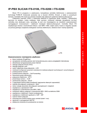 IP-PBX SLICAN ITS-0106, ITS-0206 i ITS-0286 Slican ITS to przyjazna w użytkowaniu, kompaktowa centralka telefoniczna z zastosowaniem technologii PURE-IP. Doskonale sprawdza się w biurach (SOHO), firmach, a także w prywatnych domach. Centralka ITS może być również modułem dla większych systemów telekomunikacyjnych. Połączenie Internetu (VoIP) z tradycyjną telefonią to gwarancja taniej, szybkiej i niezawodnej łączności ze światem. Łatwa instalacja, małe wymiary, możliwość zdalnego zarządzania (on-line) centralką oraz atrakcyjna cena, sprawiają, że jest ona niezastąpiona we wszelkich zastosowaniach wymagających nowoczesnych i stabilnych rozwiązań telekomunikacyjnych. Centralka Slican ITS współpracuje również z bramofonami Slican z serii BRV i SKD, dzięki czemu można w dogodny sposób za pomocą jednego urządzenia obsługiwać rozmowy telefoniczne, otwierać drzwi i bramę wjazdową. S E R W E R Y I C E N T R A L E ■ ITS Zaawansowane rozwiązania użytkowe: ■ ■ ■ ■ ■ ■ ■ ■ ■ ■ ■ ■ ■ ■ ■ ■ ■ ■ ■ ■ ■ ■ ■ ■ ■ łatwa instalacja (Plug&Play) zarządzanie centralką poprzez sieć komputerową przy użyciu przeglądarki internetowej aktualizacja oprogramowania przez Internet obsługa połączeń POTS (FXO) obsługa połączeń VoIP wybór najtańszej drogi połączenia - LCR możliwość konfiguracji uprawnień (restrykcji) do realizacji połączeń wychodzących i przychodzących przekazywanie rozmów przekierowania połączeń – Call Forwarding dzwonienie grupy abonentów połączenia trójstronne - 3PTY prezentacja numeru – CLIP zawieszenie połączeń - HOLD 3 zapowiedzi słowne DISA (możliwość nagrywania własnych zapowiedzi) melodia dla połączeń oczekujcych - MoH różne rodzaje dzwonków dla połączeń wewnętrznych i miejskich współpraca z operatorami VoIP współpraca z bramofonami serii BRV i SKD możliwość odbioru połączeń z bramofonów BRV i SKD na telefonie GSM współpraca z telefonami / faxami analogowymi współpraca z telefonami zgodnymi z VoIP – SIP wydruk historii połączeń automatyczna zmiana trybów pracy centrali (dzień / noc) zgodność z wymaganiami R&TTE estetyczna obudowa do powieszenia na ścianie 1 S E R W E R Y I ■ PRZYKŁADOWA KONFIGURACJA CENTRALKI ITS Typ centrali Wyposażenie ITS-0106 ITS-0206 ITS-0286 Abonenci analogowi (FXS) 6 6 6 Linie miejskie (FXO) 1 2 2 Abonenci IP (IPS) 1 1 8 Linie IP (IPO) 2 2 6 Port Ethernet 10 / 100 1 1 1 Dostępne urządzenia współpracujące Slican Obsługiwane protokoły Parametry VoIP C E N T R A L E telefon analogowy Slican XL-2023ID bramofony Slican typ BRV i SKD SIP 2.0 (kodeki G.711) SIP 2.0 (kodeki G.711 i G.729) Współpraca z innymi aplikacjami / urządzeniami aplikacje komputerowe typu „softphone” lub sprzętowy telefon IP, bramy VoIP (SIP 2.0) Tryb pracy klient lub / i serwer VoIP ~230 V; 50 Hz; < 15 VA Wymiary (mm) szerokość x wysokość x głębokość 191 x 111 x 36 Technologia PURE-IP stan na 14.09.2010 Zasilanie 2