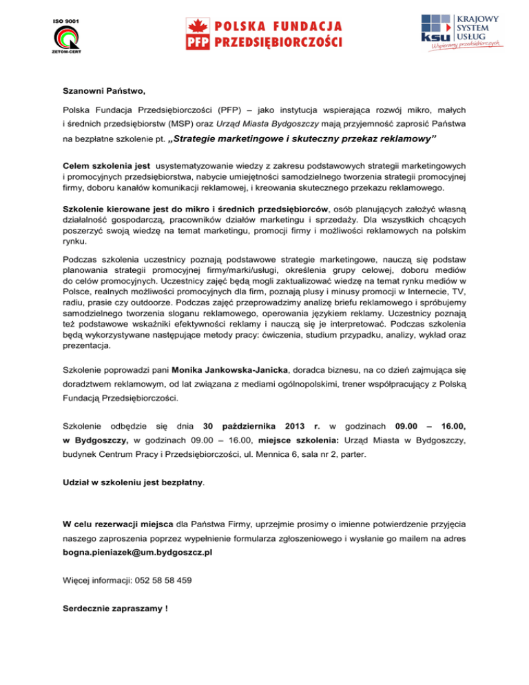 ISO 9001 ZETOM-CERT Szanowni Państwo, Polska Fundacja Przedsiębiorczości (PFP) – jako instytucja wspierająca rozwój mikro, małych i średnich przedsiębiorstw (MSP) oraz Urząd Miasta Bydgoszczy mają przyjemność zaprosić Państwa na bezpłatne szkolenie pt. „Strategie marketingowe i skuteczny przekaz reklamowy” Celem szkolenia jest usystematyzowanie wiedzy z zakresu podstawowych strategii marketingowych i promocyjnych przedsiębiorstwa, nabycie umiejętności samodzielnego tworzenia strategii promocyjnej firmy, doboru kanałów komunikacji reklamowej, i kreowania skutecznego przekazu reklamowego. Szkolenie kierowane jest do mikro i średnich przedsiębiorców, osób planujących załoŜyć własną działalność gospodarczą, pracowników działów marketingu i sprzedaŜy. Dla wszystkich chcących poszerzyć swoją wiedzę na temat marketingu, promocji firmy i moŜliwości reklamowych na polskim rynku. Podczas szkolenia uczestnicy poznają podstawowe strategie marketingowe, nauczą się podstaw planowania strategii promocyjnej firmy/marki/usługi, określenia grupy celowej, doboru mediów do celów promocyjnych. Uczestnicy zajęć będą mogli zaktualizować wiedzę na temat rynku mediów w Polsce, realnych moŜliwości promocyjnych dla firm, poznają plusy i minusy promocji w Internecie, TV, radiu, prasie czy outdoorze. Podczas zajęć przeprowadzimy analizę briefu reklamowego i spróbujemy samodzielnego tworzenia sloganu reklamowego, operowania językiem reklamy. Uczestnicy poznają teŜ podstawowe wskaźniki efektywności reklamy i nauczą się je interpretować. Podczas szkolenia będą wykorzystywane następujące metody pracy: ćwiczenia, studium przypadku, analizy, wykład oraz prezentacja. Szkolenie poprowadzi pani Monika Jankowska-Janicka, doradca biznesu, na co dzień zajmująca się doradztwem reklamowym, od lat związana z mediami ogólnopolskimi, trener współpracujący z Polską Fundacją Przedsiębiorczości. Szkolenie odbędzie się dnia 30 października 2013 r. w godzinach 09.00 – 16.00, w Bydgoszczy, w godzinach 09.00 – 16.00, miejsce szkolenia: Urząd Miasta w Bydgoszczy, budynek Centrum Pracy i Przedsiębiorczości, ul. Mennica 6, sala nr 2, parter. Udział w szkoleniu jest bezpłatny. W celu rezerwacji miejsca dla Państwa Firmy, uprzejmie prosimy o imienne potwierdzenie przyjęcia naszego zaproszenia poprzez wypełnienie formularza zgłoszeniowego i wysłanie go mailem na adres [email protected] Więcej informacji: 052 58 58 459 Serdecznie zapraszamy ! ISO 9001 ZETOM-CERT Program szkolenia „Strategie marketingowe i skuteczny przekaz reklamowy” Godzina 09.00 – 09.15 09.15 – 10.30 10.30 – 10.45 10.45 – 12.15 12.15 – 12.45 12.45– 14.15 14.15 – 14.30 14.30 – 16.00 16.00 Temat zajęć Powitanie uczestników i wprowadzenie • Istota i cele strategii marketingowej w przedsiębiorstwie - Zasady tworzenia strategii - Myślenie strategiczne - Strategie konkurowania - Strategie „push” i „pull” Przerwa • Reklama i tworzenie strategii promocji - Etapy tworzenia strategii promocji - Wybór grupy celowej - Instrumenty ATL i BTL - Istota reklamy – model AIDA - Kanały, nośniki i środki przekazu reklamowego Przerwa • Rynek reklamowy w Polsce - wady i zalety poszczególnych mediów - Struktura i potencjał polskiego rynku reklamowego w Polsce - Reklama internetowa - Reklama telewizyjna - Reklama radiowa - Reklama prasowa - Product placement - Reklama zewnętrzna - Reklama ambientowa Przerwa • Skuteczny przekaz reklamowy - Język reklamy - Skuteczny slogan reklamowy – zasady tworzenia - Efektywność reklamy – podstawowe wskaźniki - Współpraca z agencją reklamową i profesjonalny brief Zakończenie szkolenia