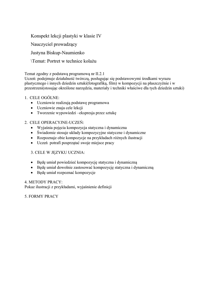 Konspekt lekcji plastyki w klasie IV Nauczyciel prowadzący Justyna Biskup-Naumienko \Temat: Portret w technice kolażu Temat zgodny z podstawą programową nr II.2.1 Uczeń: podejmuje działalność twórczą, posługując się podstawowymi środkami wyrazu plastycznego i innych dziedzin sztuki(fotografiką, film) w kompozycji na płaszczyźnie i w przestrzeni(stosując określone narzędzia, materiały i techniki właściwe dla tych dziedzin sztuki) 1. CELE OGÓLNE: Uczniowie realizują podstawę programowa Uczniowie znaja cele lekcji Tworzenie wypowiedzi –ekspresja przez sztukę 2. CELE OPERACYJNE-UCZEŃ: Wyjaśnia pojęcia kompozycja statyczna i dynamiczna Świadomie stosuje układy kompozycyjne statyczne i dynamiczne Rozpoznaje obie kompozycje na przykładach różnych ilustracji Uczeń potrafi posprzątać swoje miejsce pracy 3. CELE W JĘZYKU UCZNIA: Będę umiał powiedzieć kompozycję statyczna i dynamiczną Będę umiał dowolnie zastosować kompozycję statyczna i dynamiczną Będę umiał rozpoznać kompozycje 4. METODY PRACY: Pokaz ilustracji z przykładami, wyjaśnienie definicji 5. FORMY PRACY
