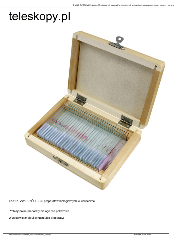 TKANKI ZWIERZÄ CE - zestaw 30 pokazowych preparatów biologicznych w drewnianej walizeczce (preparaty gotowe) - oferta te teleskopy.pl TKANKI ZWIERZÊCE - 30 preparatów biologicznych w walizeczce Profesjonalne preparaty biologiczne pokazowe. W zestawie znajduj si nastpujce preparaty: http://teleskopy.pl/product_info.php?products_id=1535 1 December, 2012, 10:48 TKANKI ZWIERZÄ CE - zestaw 30 pokazowych preparatów biologicznych w drewnianej walizeczce (preparaty gotowe) - oferta te 1. pantofelek W.M. (ang. paramecium W.M. ) 2. pantofelek koniugacja, W.M. (ang. paramecium conjugation, W.M. ) 3. pantofelek podzia³, W.M. (ang. paramecium in fission, W.M. ) 4. euglena W.M. (ang. euglena W.M. ) 5. stu³bia C.S. (ang. hydra C.S. ) 6. stu³bia, C.S. (ang. hydra, C.S. ) 7. stu³bia L.S. (ang. hydra L.S. ) 8. stu³bia p±czkuj±ca, W.M. (ang. hydra with bud, W.M. ) 9. przywra mêska, W.M. (ang. schistosoma male, W.M. ) 10. przywra ¿eñska, W.M. (ang. schistosoma female, W.M. ) 11. jaja glisty, C.S. (ang. ascaris egg, C.S. ) 12. larwy przywry, W.M. (ang. schistosoma miracidia, W.M. ) 13. przywra ceraroae, W.M. (ang. schistosoma ceraroae, W.M. ) 14. przywra dojrzewaj±ca, W.M. (ang. schistosoma adults in copula, W.M. ) 15. cysta z larw± tasiemca, W.M. (ang. bladder worm, W.M. ) 16. tasiemiec dojrza³y, W.M. (ang. tapeworm, mature proglottid, W.M. ) http://teleskopy.pl/product_info.php?products_id=1535 1 December, 2012, 10:48 TKANKI ZWIERZÄ CE - zestaw 30 pokazowych preparatów biologicznych w drewnianej walizeczce (preparaty gotowe) - oferta te 17. glista mêska i ¿eñska, C.S. (ang. ascaris female and male, C.S. ) 18. jaja glisty koñskiej, Sec. (ang. mitosis horse ascaris eggs, Sec. ) 19. d¿d¿ownica, C.S. (ang. earthworm C.S. ) 20. aparat gêbowy pszczo³y, W.M. (ang. honey bee mouth parts, W.M. ) 21. aparat gêbowy komara, W.M. (ang. mosquite mouth parts, W.M. ) 22. larwa muchy domowej, W.M. (ang. culex common house mosquito, larva, W.M. ) 23. aparat gêbowy muchy, W.M. (ang. house fly mouth parts, W.M. ) 24. aparat ss±cy motyla, W.M. (ang. butterfly mouth parts, W.M. ) 25. tylne odnó¿e pszczo³y, W.M. (ang. honey bee hind leg, W.M. ) 26. mrówka, W.M. (ang. ant W.M. ) 27. skrzele ma³¿a, C.S. (ang. clam gill, C.S. ) 28. jaja ¿aby, C.S (ang. frog egg, C.S. ) 29. w±troba ¿aby, Sec. (ang. frog liver, Sec. ) 30. krew go³êbia rozmaz (ang. blood pigcon, smear ) http://teleskopy.pl/product_info.php?products_id=1535 1 December, 2012, 10:48 TKANKI ZWIERZÄ CE - zestaw 30 pokazowych preparatów biologicznych w drewnianej walizeczce (preparaty gotowe) - oferta te http://teleskopy.pl/product_info.php?products_id=1535 1 December, 2012, 10:48