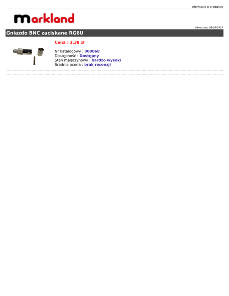 Informacje o produkcie Utworzono 08-03-2017 Gniazdo BNC zaciskane RG6U Cena : 3,38 zł Nr katalogowy : 000068 Dostępność : Dostępny Stan magazynowy : bardzo wysoki Średnia ocena : brak recenzji