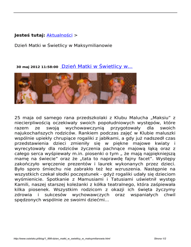 Jesteś tutaj: Aktualności > Dzień Matki w Świetlicy w Maksymilianowie 30 maj 2012 11:58:00 Dzień Matki w Świetlicy w... 25 maja od samego rana przedszkolaki z Klubu Malucha „Maksiu” z niecierpliwością oczekiwały swoich popołudniowych występów, które razem ze swoją wychowawczynią przygotowały dla swoich najukochańszych rodziców. Rankiem podczas zajęć w Klubie maluszki wspólnie upiekły chrupiące rogaliki z jabłkami, a gdy już nadszedł czas przedstawienia dzieci zmieniły się w piękne majowe kwiaty i wyrecytowały dla rodziców życzenia pachnące majową łąką oraz z całego serca wyśpiewały m.in. piosenki o tym „ że mają najpiękniejszą mamę na świecie” oraz że „tata to naprawdę fajny facet”. Występy zakończyło wręczenie prezentów i laurek wykonanych przez dzieci. Było sporo śmiechu nie zabrakło też łez wzruszenia. Następnie na wszystkich czekał słodki poczęstunek - gdyż rogaliki udały się dzieciom wyśmienicie. Spotkanie z Mamusiami i Tatusiami uświetnił występ Kamili, naszej starszej koleżanki z kółka teatralnego, która zaśpiewała kilka piosenek. Wszystkim rodzicom z okazji ich święta życzymy zdrowia i sukcesów wychowawczych oraz wspaniałych chwil spędzonych wspólnie ze swoimi dziećmi... http://www.osielsko.pl/blog/1_898-dzien_matki_w_swietlicy_w_maksymilianowie.html Strona 1/2 /Ewa Sójka/ drukuj Wróć http://www.osielsko.pl/blog/1_898-dzien_matki_w_swietlicy_w_maksymilianowie.html Powered by TCPDF (www.tcpdf.org) Strona 2/2