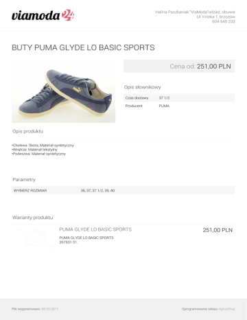 Halina Paszkaniak "ViaModa"odzież, obuwie Ul. Krótka 1, brzozów 604 645 233 BUTY PUMA GLYDE LO BASIC SPORTS Cena od: 251,00 PLN Opis słownikowy Czas dostawy 37 1/2 Producent PUMA Opis produktu •Cholewa: Skóra, Materiał syntetyczny •Wnętrze: Materiał tekstylny •Podeszwa: Materiał syntetyczny Parametry WYBIERZ ROZMIAR 36, 37, 37 1/2, 39, 40 Warianty produktu PUMA GLYDE LO BASIC SPORTS 251,00 PLN PUMA GLYDE LO BASIC SPORTS 357531 01. Plik wygenerowano: 08-03-2017 Oprogramowanie sklepu: AptusShop Halina Paszkaniak "ViaModa"odzież, obuwie Ul. Krótka 1, brzozów 604 645 233 Galeria Plik wygenerowano: 08-03-2017 Powered by TCPDF (www.tcpdf.org) Oprogramowanie sklepu: AptusShop