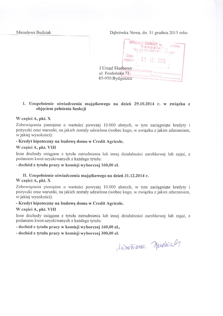 Mircgwa Budziak Dąbrówka Nowa, dn. g 31 grudnia 2015 roku Miir@ 'ś 3 i i IUrząd Skarb wy ul. Fordońs .7 85-950 Bydg?? zez a I. Uzupełnienie oświadczenia majątkowego na dzień 29.10.2014 r. objęciem pełnienia funkcji W związku z W części A, pkt. X Zobowiązania pienięzne o wartości powyżej 10.000 złotych, w tym zaciągnięte kredyty i pozyczki oraz warunki, na jakich zostały udzielone (wobec kogo, W związku z jakim zdarzeniem, wjakiej wysokości): - Kredyt hipoteczny na budowę domu w Credit Agricole. W części A, pkt. VIII Inne dochody osiągane z tytułu zatrudnienia lub innej działalności zarobkowej lub zajęć, z podaniem kwot uzyskiwanych z każdego tytułu: - dochód z tytułu pracy W komisji wyborczej 160,00 zł. II. Uzupełnienie oświadczenia majątkowego na dzień 31.12.2014 r. W części A, pkt. X Zobowiązania pienięzne o wartości powyżej 10.000 złotych, w tym zaciągnięte kredyty i pożyczki oraz warunki, na jakich zostały udzielone (wobec kogo, w związku z jakim zdarzeniem, wjakiej wysokości): - Kredyt hipoteczny na budowę domu w Credit Agricole. W części A, pkt. VIII Inne dochody osiągane z tytułu zatrudnienia lub innej działalności zarobkowej lub zajęc', z podaniem kwot uzyskiwanych z każdego tytułu: - dochód z tytulu pracy w komisji wyborczej 160,00 zł., - dochód z tytułu pracy w ko misji wyborczej 300,00 zł.
