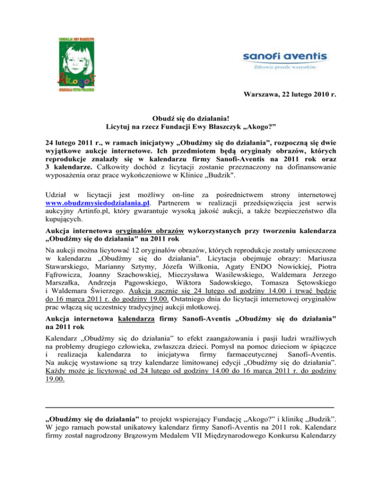 Warszawa, 22 lutego 2010 r. Obudź się do działania! Licytuj na rzecz Fundacji Ewy Błaszczyk „Akogo?” 24 lutego 2011 r., w ramach inicjatywy „Obudźmy się do działania”, rozpoczną się dwie wyjątkowe aukcje internetowe. Ich przedmiotem będą oryginały obrazów, których reprodukcje znalazły się w kalendarzu firmy Sanofi-Aventis na 2011 rok oraz 3 kalendarze. Całkowity dochód z licytacji zostanie przeznaczony na dofinansowanie wyposażenia oraz prace wykończeniowe w Klinice „Budzik". Udział w licytacji jest możliwy on-line za pośrednictwem strony internetowej www.obudzmysiedodzialania.pl. Partnerem w realizacji przedsięwzięcia jest serwis aukcyjny Artinfo.pl, który gwarantuje wysoką jakość aukcji, a także bezpieczeństwo dla kupujących. Aukcja internetowa oryginałów obrazów wykorzystanych przy tworzeniu kalendarza „Obudźmy się do działania" na 2011 rok Na aukcji można licytować 12 oryginałów obrazów, których reprodukcje zostały umieszczone w kalendarzu „Obudźmy się do działania". Licytacja obejmuje obrazy: Mariusza Stawarskiego, Marianny Sztymy, Józefa Wilkonia, Agaty ENDO Nowickiej, Piotra Fąfrowicza, Joanny Szachowskiej, Mieczysława Wasilewskiego, Waldemara Jerzego Marszałka, Andrzeja Pągowskiego, Wiktora Sadowskiego, Tomasza Sętowskiego i Waldemara Świerzego. Aukcja zacznie się 24 lutego od godziny 14.00 i trwać będzie do 16 marca 2011 r. do godziny 19.00. Ostatniego dnia do licytacji internetowej oryginałów prac włączą się uczestnicy tradycyjnej aukcji młotkowej. Aukcja internetowa kalendarza firmy Sanofi-Aventis „Obudźmy się do działania" na 2011 rok Kalendarz „Obudźmy się do działania” to efekt zaangażowania i pasji ludzi wrażliwych na problemy drugiego człowieka, zwłaszcza dzieci. Pomysł na pomoc dzieciom w śpiączce i realizacja kalendarza to inicjatywa firmy farmaceutycznej Sanofi-Aventis. Na aukcję wystawione są trzy kalendarze limitowanej edycji „Obudźmy się do działania”. Każdy może je licytować od 24 lutego od godziny 14.00 do 16 marca 2011 r. do godziny 19.00. „Obudźmy się do działania” to projekt wspierający Fundację „Akogo?” i klinikę „Budzik”. W jego ramach powstał unikatowy kalendarz firmy Sanofi-Aventis na 2011 rok. Kalendarz firmy został nagrodzony Brązowym Medalem VII Międzynarodowego Konkursu Kalendarzy i Kart Świąteczno-Noworocznych VIDICAL 2011. Obrazy artystów zostaną zlicytowane na rzecz Fundacji podczas aukcji charytatywnej 16 marca 2011 r. w Warszawie. Zapraszamy do naszej społeczności „Obudźmy się do działania” na Facebook – porozmawiajmy o tym, co nas porusza do działania i dlaczego warto pomagać. *** Fundacja „Akogo?” została założona w 2002 roku przez Ewę Błaszczyk-Janczarską oraz ks. Wojtka Drozdowicza. Celem fundacji jest pomoc dzieciom po ciężkich urazach mózgu oraz wybudowanie pierwszej w Polsce kliniki-wzorca (na 15 łóżek) przy oddziale Rehabilitacji Neurologicznej w Centrum Zdrowia Dziecka, gdzie trafiają najcięższe przypadki. Więcej informacji znajduje się na stronie www.akogo.pl Sanofi-Aventis jest globalnym dostawcą usług zdrowotnych, zaangażowanym w odkrywanie, produkcję i dystrybucję leków, które mają poprawić stan zdrowia pacjentów na całym świecie. Firma Sanofi-Aventis jest notowana na giełdach w Paryżu (EURONEXT: SAN) oraz w Nowym Jorku (NYSE: SNY). Do Grupy Sanofi-Aventis należy m.in. spółka Sanofi Pasteur, będąca największym na świecie producentem szczepionek oraz Zentiva – lider produkcji leków generycznych w Europie Środkowo-Wschodniej. W 2010r. do Grupy Sanofi-Aventis dołączyła firma Nepentes S.A., uznany w branży polski producent leków oraz dermokosmetyków. Grupa Sanofi-Aventis w Polsce zatrudnia ponad 1300 osób, w tym 190 we własnym zakładzie produkcyjnym w Rzeszowie. Według danych IMS, Grupa Sanofi-Aventis zajmuje jedno z wiodących miejsc w krajowym rankingu największych firm farmaceutycznych. Sanofi-Aventis jest członkiem Związku Pracodawców Innowacyjnych Firm Farmaceutycznych INFARMA, Izby Gospodarczej Farmacja Polska, a także członkiem PASMI – Polskiego Związku Producentów Leków bez Recepty. Więcej informacji znajduje się na stronie www.sanofi-aventis.pl Więcej informacji na temat projektu udziela: Biuro prasowe projektu „Obudźmy się do działania” Iwona Siwek Mobile: (+48) 692 872 067 E-mail: [email protected]