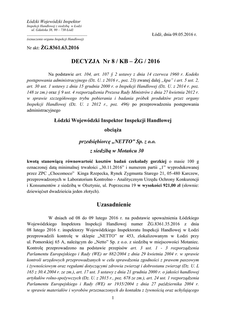 Łódzki Wojewódzki Inspektor Inspekcji Handlowej z siedzibą w Łodzi ul. Gdańska 38, 90 – 730 Łódź Łódź, dnia 09.05.2016 r. ..................................................... (oznaczenie organu Inspekcji Handlowej) Nr akt: ŻG.8361.63.2016 DECYZJA Nr 8 / KB – ŻG / 2016 Na podstawie art. 104, art. 107 § 2 ustawy z dnia 14 czerwca 1960 r. Kodeks postępowania administracyjnego (Dz. U. z 2016 r., poz. 23) zwanej dalej „kpa” i art. 5 ust. 2, art. 30 ust. 1 ustawy z dnia 15 grudnia 2000 r. o Inspekcji Handlowej (Dz. U. z 2014 r. poz. 148 ze zm.) oraz § 9 ust. 4 rozporządzenia Prezesa Rady Ministrów z dnia 27 kwietnia 2012 r. w sprawie szczegółowego trybu pobierania i badania próbek produktów przez organy Inspekcji Handlowej (Dz. U. z 2012 r., poz. 496) po przeprowadzeniu postępowania administracyjnego Łódzki Wojewódzki Inspektor Inspekcji Handlowej obciąża przedsiębiorcę „NETTO” Sp. z o.o. z siedzibą w Motańcu 30 kwotą stanowiącą równowartość kosztów badań czekolady gorzkiej o masie 100 g oznaczonej datą minimalnej trwałości „30.11.2016” i numerem partii „1” wyprodukowanej przez ZPC „Chocomoco” Kinga Rzepecka, Rynek Zygmunta Starego 21, 05-480 Karczew, przeprowadzonych w Laboratorium Kontrolno - Analitycznym Urzędu Ochrony Konkurencji i Konsumentów z siedzibą w Olsztynie, ul. Poprzeczna 19 w wysokości 921,00 zł (słownie: dziewięćset dwadzieścia jeden złotych). Uzasadnienie W dniach od 08 do 09 lutego 2016 r. na podstawie upoważnienia Łódzkiego Wojewódzkiego Inspektora Inspekcji Handlowej numer ŻG.8361.35.2016 z dnia 08 lutego 2016 r. inspektorzy Wojewódzkiego Inspektoratu Inspekcji Handlowej w Łodzi przeprowadzili kontrolę w sklepie „NETTO” nr 453, zlokalizowanym w Łodzi przy ul. Pomorskiej 65 A, należącym do „Netto” Sp. z o.o. z siedzibą w miejscowości Motaniec. Kontrolę przeprowadzono na podstawie przepisów art. 3 ust. 1 - 3 rozporządzenia Parlamentu Europejskiego i Rady (WE) nr 882/2004 z dnia 29 kwietnia 2004 r. w sprawie kontroli urzędowych przeprowadzanych w celu sprawdzenia zgodności z prawem paszowym i żywnościowym oraz regułami dotyczącymi zdrowia zwierząt i dobrostanu zwierząt (Dz. U. L 165 z 30.4.2004 r. ze zm.), art. 17 ust. 3 ustawy z dnia 21 grudnia 2000 r. o jakości handlowej artykułów rolno-spożywczych (Dz. U. z 2015 r., poz. 678 ze zm.), art. 24 ust. 1 rozporządzenia Parlamentu Europejskiego i Rady (WE) nr 1935/2004 z dnia 27 października 2004 r. w sprawie materiałów i wyrobów przeznaczonych do kontaktu z żywnością oraz uchylającego 1 dyrektywy 80/590/EWG (Dz. U. z 27.10.2004 s. 4 ze zm.) w związku z art. 3 ust. 1 pkt 6 oraz art. 3 ust. 1 pkt 1, 2 ustawy z dnia 15 grudnia 2000 r. o Inspekcji Handlowej (Dz. U. z 2014 r., poz. 148 ze zm.) w obecności osoby upoważnionej do reprezentowania kontrolowanego przedsiębiorcy (…). W toku kontroli w dniu 08 lutego 2016 r. na podstawie art. 16 ust. 1 pkt 10 i rozdziału 6 ustawy z dnia 15 grudnia 2000 r. o Inspekcji Handlowej (Dz. U. z 2014 r. poz. 148 ze zm.), zwanej dalej „ustawą o Inspekcji Handlowej” z partii liczącej 29 sztuk pobrano do badań laboratoryjnych (w tych samych ilościach) próbki (podstawową i kontrolną) czekolady gorzkiej o masie 100 g oznaczonej datą minimalnej trwałości „30.11.2016” i numerem partii „1” wyprodukowanej przez ZPC „Chocomoco” Kinga Rzepecka, Rynek Zygmunta Starego 21, 05-480 Karczew, zwanej dalej „czekoladą gorzką”. Próbka podstawowa została opisana w protokole pobrania próbki numer 02840 i przekazana do Laboratorium Kontrolno-Analitycznego Urzędu Ochrony Konkurencji i Konsumentów z siedzibą w Olsztynie, ul. Poprzeczna 19, zwanego dalej „Laboratorium w Olsztynie” celem przeprowadzenia badań organoleptycznych i fizyczno-chemicznych, zaś próbka kontrolna została opisana w protokole pobrania próbki numer 02841, zabezpieczona i pozostawiana w kontrolowanej placówce do czasu jej zwolnienia przez Łódzkiego Wojewódzkiego Inspektora Inspekcji Handlowej w warunkach uniemożliwiających zmianę jakości lub cech charakterystycznych produktu. Przeprowadzone w Laboratorium w Olsztynie analizy wykazały: obecność ekwiwalentów tłuszczu kakaowego (CBE) w ilości 1,64g/100g produktu, które nie były zadeklarowane w oznakowaniu, niewłaściwe cechy organoleptyczne – smak bardzo słodki, mało charakterystyczny dla czekolady gorzkiej, niższą zawartość tłuszczu – na opakowaniu jednostkowym w tabeli wartości odżywczej producent zadeklarował 32 g tłuszczu w 100 g produktu, a w wyniku urzędowej kontroli żywności stwierdzono 31,4 g, wyższą zawartość białka - na opakowaniu jednostkowym w tabeli wartości odżywczej producent zadeklarował 6,9 g białka w 100 g produktu, a w wyniku urzędowej kontroli żywności stwierdzono 7,4 g, wyższą zawartość cukrów ogółem - na opakowaniu jednostkowym w tabeli wartości odżywczej producent zadeklarował 38,2 g cukru w 100 g produktu, a w wyniku urzędowej kontroli żywności stwierdzono 41,8 g, co zostało udokumentowane w sprawozdaniu z badań numer 94/2016 z dnia 25 lutego 2016 r. wystawionym przez Laboratorium w Olsztynie. Łódzki Wojewódzki Inspektor Inspekcji Handlowej po uwzględnieniu tolerancji (dla tłuszczu, białka, cukru) wynikającej z tabeli numer 1 dokumentu Komisji Europejskiej o nazwie „Wytyczne dla właściwych organów w sprawie kontroli zgodności z prawodawstwem UE w odniesieniu do rozporządzenia Parlamentu Europejskiego i Rady (UE) nr 1169/2011 z dnia 25 października 2011 r. w sprawie przekazywania konsumentom 2 informacji na temat żywności, zmiany rozporządzeń Parlamentu Europejskiego i Rady (WE) nr 1924/2006 i (WE) nr 1925/2006 oraz uchylenia dyrektywy Komisji 87/250/EWG, dyrektywy Rady 90/496/EWG, dyrektywy Komisji 1999/10/WE, dyrektywy 2000/13/WE Parlamentu Europejskiego i Rady, dyrektyw Komisji 2002/67/WE i 2008/5/WE oraz rozporządzenia Komisji (
