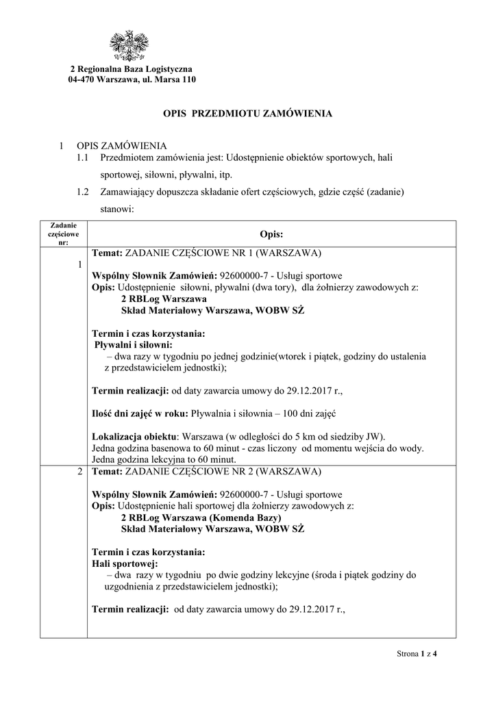 2 Regionalna Baza Logistyczna 04-470 Warszawa, ul. Marsa 110 OPIS PRZEDMIOTU ZAMÓWIENIA 1 OPIS ZAMÓWIENIA 1.1 Przedmiotem zamówienia jest: Udostępnienie obiektów sportowych, hali sportowej, siłowni, pływalni, itp. 1.2 Zamawiający dopuszcza składanie ofert częściowych, gdzie część (zadanie) stanowi: Zadanie częściowe nr: Opis: Temat: ZADANIE CZĘŚCIOWE NR 1 (WARSZAWA) 1 Wspólny Słownik Zamówień: 92600000-7 - Usługi sportowe Opis: Udostępnienie siłowni, pływalni (dwa tory), dla żołnierzy zawodowych z: 2 RBLog Warszawa Skład Materiałowy Warszawa, WOBW SŻ Termin i czas korzystania: Pływalni i siłowni: – dwa razy w tygodniu po jednej godzinie(wtorek i piątek, godziny do ustalenia z przedstawicielem jednostki); Termin realizacji: od daty zawarcia umowy do 29.12.2017 r., Ilość dni zajęć w roku: Pływalnia i siłownia – 100 dni zajęć Lokalizacja obiektu: Warszawa (w odległości do 5 km od siedziby JW). Jedna godzina basenowa to 60 minut - czas liczony od momentu wejścia do wody. Jedna godzina lekcyjna to 60 minut. 2 Temat: ZADANIE CZĘŚCIOWE NR 2 (WARSZAWA) Wspólny Słownik Zamówień: 92600000-7 - Usługi sportowe Opis: Udostępnienie hali sportowej dla żołnierzy zawodowych z: 2 RBLog Warszawa (Komenda Bazy) Skład Materiałowy Warszawa, WOBW SŻ Termin i czas korzystania: Hali sportowej: – dwa razy w tygodniu po dwie godziny lekcyjne (środa i piątek godziny do uzgodnienia z przedstawicielem jednostki); Termin realizacji: od daty zawarcia umowy do 29.12.2017 r., Strona 1 z 4 Ilość dni zajęć w roku: 84 dni zajęć. Lokalizacja obiektu: Warszawa (w odległości do 5 km od siedziby JW). Jedna godzina lekcyjna to 45 minut. Temat: ZADANIE CZĘŚCIOWE NR 3 (Bezwola) 3 Wspólny Słownik Zamówień: 92600000-7 - Usługi sportowe Opis: Udostępnienie pływalni dla 21 żołnierzy zawodowych z: 2 RBLog Warszawa Skład Bezwola Termin i czas korzystania z pływalni: – jeden raz w tygodniu po jednej godzinie - dostępność w piątki między godzinami 07:00 – 15:00 (godziny do uzgodnienia z przedstawicielem jednostki); Termin realizacji: od daty zawarcia umowy do 29.12.2017 r., Ilość wejść/osoba: 700 wejść. Lokalizacja basenu: do 30 km od jednostki Jedna godzina basenowa to 45 minut - czas liczony od momentu wejścia do wody. Temat: ZADANIE CZĘŚCIOWE NR 4 (NOWY DWÓR MAZOWIECKI, 4 POMIECHÓWEK) Wspólny Słownik Zamówień: 92600000-7 - Usługi świadczone przez ośrodki sportowe Opis: Udostępnienie obiektów sportowych dla 48 żołnierzy (jednorazowo grupa osób ćwiczących na basenie nie będzie przekraczała 25 osób) zawodowych z: 2 RBLog Warszawa RWT Nowy Dwór Mazowiecki Skład Pomiechówek Termin i czas korzystania z: 1. Pływalni: – dwa razy w tygodniu po dwie godziny basenowe - dostępność w poniedziałki i czwartki (godziny do uzgodnienia z przedstawicielem jednostki); 2. Hali sportowej – dwa razy w tygodniu po dwie godziny lekcyjne - dostępność w dniach w poniedziałki i czwartki (godziny do uzgodnienia z przedstawicielem jednostki); Termin realizacji: od daty zawarcia umowy do 29.12.2017 r., Ilość dni zajęć w roku: 1. Pływalnia: 82 dni zajęć. 2. Hala sportowa: 82 dni zajęć Lokalizacja basenu: do 15 km od jednostki Jedna godzina basenowa to 45 minut - czas liczony od momentu wejścia do wody. Jedna godzina lekcyjna to 45 minut. Temat: ZADANIE CZĘŚCIOWE NR 5 (PUSZCZA MARIAŃSKA) 5 Wspólny Słownik Zamówień: 92620000-3 - Usługi w zakresie sportu Opis: Udostępnienie pływalni dla 7 żołnierzy zawodowych z: 2 RBLog Warszawa Skład Puszcza Mariańska Strona 2 z 4 Termin i czas korzystania z basenu: – dwa razy w tygodniu w poniedziałki i czwartki po jednej godzinie, w godz. 07.0015.00 (godziny do uzgodnienia z przedstawicielem jednostki); Termin realizacji: od daty zawarcia umowy do 29.12.2017 r., Ilość dni zajęć w roku: 100 dni zajęć. Lokalizacja basenu: do 15 km od jednostki Jedna godzina basenowa to 60 minut - czas liczony od momentu wejścia do wody. Temat: ZADANIE CZĘŚCIOWE NR 6 (kompania rurociągów dalekosiężnych, Puszcza 6 Mariańska). Wspólny Słownik Zamówień: 92600000-7 - Usługi świadczone przez ośrodki sportowe. Opis: Udostępnienie obiektów sportowych dla 18 żołnierzy: 2 RBLog Warszawa kompania rurociągów dalekosiężnych (Puszcza Mariańska) Termin i czas korzystania z: 1. Pływalni: – raz w tygodniu po jednej godzinie basenowej (dni oraz godziny do uzgodnienia z przedstawicielem jednostki); 2. Siłownia i Hala sportowa: – raz w tygodniu po dwie godziny lekcyjne (dni oraz godziny do uzgodnienia z przedstawicielem jednostki); Termin realizacji: od daty zawarcia umowy do 29.12.2017 r., Gwarantowana ilość dni zajęć w roku: 1. Pływalnia: 51 dni zajęć. 2. Siłownia i Hala sportowa: 50 dni zajęć Lokalizacja obiektu: do 15 km od jednostki Jedna godzina basenowa to 60 minut - czas liczony od momentu wejścia do wody. Jedna godzina lekcyjna to 45 minut. 7 Temat: ZADANIE CZĘŚCIOWE NR 7 (WT Pilawa) Wspólny Słownik Zamówień: 92600000-7 - Usługi sportowe Opis: Udostępnienie siłowni, pływalni dla 3 żołnierzy: 2 RBLog Warszawa WT Pilawa Termin i czas korzystania: Siłowni i Pływalnia – dwa razy w tygodniu po dwie godziny - dostępność w poniedziałki i czwartki (godziny do uzgodnienia z przedstawicielem jednostki); Termin realizacji: od daty zawarcia umowy do 29.12.2017 r., Ilość dni zajęć w roku: 100 dni zajęć. Strona 3 z 4 Lokalizacja obiektu: Garwolin -do 15 km od siedziby 2 RBLog (WT Pilawa) Jedna godzina basenowa to 45 minut - czas liczony od momentu wejścia do wody. Jedna godzina lekcyjna to 45 minut. 8 Temat: ZADANIE CZĘŚCIOWE NR 8 (Skład Zegrze) Wspólny Słownik Zamówień: 92600000-7 - Usługi sportowe Opis: Udostępnienie pływalni dla 7 żołnierzy: 2 RBLog Warszawa Skład Zegrze Termin i czas korzystania: – raz w tygodniu po jednej godzinie - dostępność w czwartki między godzinami 07:30 – 15:00; Termin realizacji: od daty za