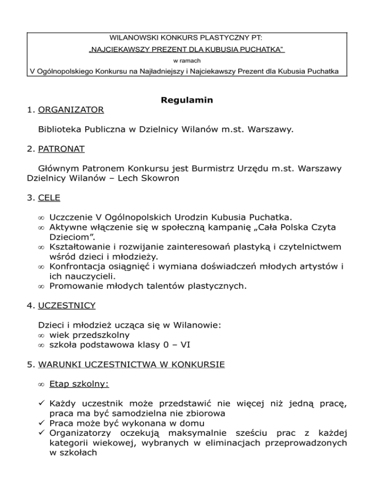 WILANOWSKI KONKURS PLASTYCZNY PT: „NAJCIEKAWSZY PREZENT DLA KUBUSIA PUCHATKA” w ramach V Ogólnopolskiego Konkursu na Najładniejszy i Najciekawszy Prezent dla Kubusia Puchatka Regulamin 1. ORGANIZATOR Biblioteka Publiczna w Dzielnicy Wilanów m.st. Warszawy. 2. PATRONAT Głównym Patronem Konkursu jest Burmistrz Urzędu m.st. Warszawy Dzielnicy Wilanów – Lech Skowron 3. CELE • Uczczenie V Ogólnopolskich Urodzin Kubusia Puchatka. • Aktywne włączenie się w społeczną kampanię „Cała Polska Czyta Dzieciom”. • Kształtowanie i rozwijanie zainteresowań plastyką i czytelnictwem wśród dzieci i młodzieży. • Konfrontacja osiągnięć i wymiana doświadczeń młodych artystów i ich nauczycieli. • Promowanie młodych talentów plastycznych. 4. UCZESTNICY Dzieci i młodzież ucząca się w Wilanowie: • wiek przedszkolny • szkoła podstawowa klasy 0 – VI 5. WARUNKI UCZESTNICTWA W KONKURSIE • Etap szkolny: Każdy uczestnik może przedstawić nie więcej niż jedną pracę, praca ma być samodzielna nie zbiorowa Praca może być wykonana w domu Organizatorzy oczekują maksymalnie sześciu prac z każdej kategorii wiekowej, wybranych w eliminacjach przeprowadzonych w szkołach Pracę należy dostarczyć do siedziby Biblioteki Publicznej w Dzielnicy Wilanów m.st. Warszawy do 20 października 2006 roku. • Etap międzyszkolny: Autorom najlepszych prac wyłonionych w szkole i zweryfikowanych przez komisję powołaną przez organizatora zostaną przyznane dyplomy, nagrody i wyróżnienia; prace, które zdobędą I nagrodę w każdej z kategorii wezmą udział w V Ogólnopolskim Konkursie na Najładniejszy i Najciekawszy Prezent dla Kubusia Puchatka organizowanym przez Fundację ABCXXI – Cała Polska czyta dzieciom, Stowarzyszenie Społeczne „Wzajemna Pomoc” oraz Miejskie Centrum Kultury w Skarżysku-Kamiennej Uroczyste podsumowanie konkursu z wręczeniem nagród, odbędzie się w listopadzie 2006 r w Bibliotece Publicznej w Dzielnicy Wilanów m.st. Warszawy O dokładnym terminie finału i jego programie powiadomimy pisemnie 6. TEMATYKA I TECHNIKA • Prace inspirowane bajkami o Kubusiu Puchatku; mogą być wykonane różnymi technikami – rysunek, malarstwo, grafika, wycinanka, wyklejanka, formy przestrzenne, ozdoby. • Organizator nie stawia żadnych dodatkowych ograniczeń w interpretacji tematu, jak również pozostawia swobodę środków jego realizacji. 7. SKŁADANIE PRAC Prace powinny zostać złożone najpóźniej do dnia 20 października 2006 roku w Bibliotece Publicznej w Dzielnicy Wilanów m.st. Warszawy przy ul. Radosnej 11. 8. KARTA UCZESTINKA Do prac każdego autora należy dołączyć KARTĘ UCZESTNIKA (załącznik 1). Pozwoli to uniknąć pomyłek i żmudnych poszukiwań autorów prac. 9. KATEGORIE I KRYTERIA OCENY PRAC • Prace będą oceniane w trzech grupach wiekowych: I grupa – wiek przedszkolny i szkoła podstawowa klasy 0 II grupa – szkoła podstawowa klasy I-III III grupa – szkoła podstawowa klasy IV-VI • Ocena prac dokonana zostanie przez Komisję powołaną przez organizatorów konkursu. 10.UWAGI KOŃCOWE • Organizatorzy nie zwracają prac i zastrzegają sobie prawo dysponowania nimi w wybrany przez siebie sposób. • Organizator zastrzega sobie prawo do reprodukcji i ekspozycji prac w materiałach i publikacjach bez zgody autora i bez uiszczenia autorowi należności finansowych • Organizator nie ponosi odpowiedzialności za uszkodzenia nadsyłanych prac powstałe w wyniku transportu • Prace nie spełniające wymagań regulaminowych nie będą oceniane. Nadesłanie prac jest równoznaczne z uznaniem regulaminu. • Kwestie sporne nie ujęte w Regulaminie zostaną rozstrzygnięte przez organizatorów. 11.KONTAKT I INFORMACJE: Biblioteka Publiczna w Dzielnicy Wilanów m.st. Warszawy 02- 956 Warszawa, ul. Radosna 11 tel. 0 22 423 57 55, tel. prywatny 0 602 709 634, Agnieszka Szymańska e-mail: [email protected], [email protected] Załącznik 1 Karta zgłoszenia: KONKURS PLASTYCZNY PT: „NAJCIEKAWSZY PREZENT DLA KUBUSIA PUCHATKA” Imię i nazwisko, wiek autora Tytuł, technika Placówka – adres i telefon Nauczyciel - opiekun * W razie potrzeby prosimy o powielenie karty.