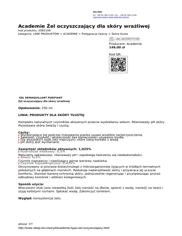 BIO-MED tel. +48 94 348-13-65 Fax.. +48 94 348-13-66 www.bio-med.pl www.sklep.bio-med.pl Academie Żel oczyszczający dla skóry wrażliwej kod produktu: 2082100 kategoria: LINIE PRODUKTÓW > ACADEMIE > Pielęgnacja twarzy > Skóra tłusta Producent: Academie 149,00 zł Kod QR: GEL DEMAQUILLANT PURIFIANT Żel oczyszczający dla skóry wrażliwej Opakowanie: 250 ml. LINIA: PRODUKTY DLA SKÓRY TŁUSTEJ Kompleks naturalnych czynników aktywnych przeciw wydzielaniu sebum. Równoważy pH skóry. Pozostawia skórę świeżą i czystą. Cechy: Wytwarzająca się podczas masowania pianka usuwa wszelkie zanieczyszczenia. Świeżość, czystość i skuteczność bez konieczności używania mydła. Dla wszystkich osób (też mężczyzn), które lubią kontakt z wodą. pH skóry jest wyrównane. Zawartość składników aktywnych: 1,025% Hydrolizat mlekowy: 0,5% Naturalny zakwaszasz, równoważy pH i zapobiega tworzeniu się niedoskonałości. Aloes: 0,5% Czynnik naprawczy i nawilżający górne warstwy naskórka. Czynnik hipoalergiczny: 0,025% Otrzymywany w procesie biotechnologii z mikroorganizmów żyjących w źródłach termalnych położonych na głębinach morskich. Redukuje nadwrażliwość skóry i przywraca jej uczucie komfortu. Stanowi barierę ochronną skóry, jednocześnie regenerując i przyśpieszając proces odbudowy komórek i włókien kolagenowych. Sposób użycia: Wieczorem i/lub rano niewielką ilość żelu nanieść na dłonie, spienić z wodą, nanieść na twarz i szyję kolistymi ruchami. Spłukać wodą. Zakończyć tonikiem. Wygląd: konsystencja żelu. strona: 1/1 http://www.sklep.bio-med.pl/academie-hypo-zel-oczyszczajacy.html