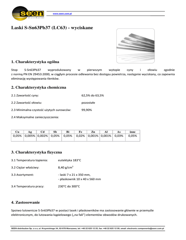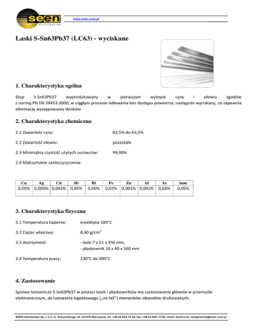 www.seen.com.pl Laski S-Sn63Pb37 (LC63) - wyciskane 1. Charakterystyka ogólna Stop S-Sn63Pb37 wyprodukowany w pierwszym wytopie cyny i ołowiu zgodnie z normą PN EN 29453:2000, w ciągłym procesie odlewania bez dostępu powietrza, następnie wyciskany, co zapewnia eliminację występowania tlenków. 2. Charakterystyka chemiczna 2.1 Zawartość cyny: 62,5% do 63,5% 2.2 Zawartość ołowiu: pozostałe 2.3 Minimalna czystość użytych surowców: 99,90% 2.4 Maksymalne zanieczyszczenia: Cu Ag Cd Sb Bi 0,05% 0,005% 0,002% 0,05% 0,05% Fe Zn Al As 0,02% 0,001% 0,001% 0,03% inne 0,05% 3. Charakterystyka fizyczna 3.1 Temperatura topienia: eutektyka 183°C 3.2 Ciężar właściwy: 8,40 g/cm3 3.3 Asortyment: - laski 7 x 21 x 350 mm, - płaskownik 10 x 40 x 560 mm 3.4 Temperatura pracy: 230°C do 300°C 4. Zastosowanie Spoiwo lutownicze S-Sn63Pb37 w postaci lasek i płaskowników ma zastosowanie głównie w przemyśle elektronicznym, do lutowania kąpielowego („na fali”) elementów obwodów drukowanych. SEEN distribution Sp. z o.o, ul. Krzywickiego 34, 02-078 Warszawa, tel: +48 22 625 12 25, fax: +48 22 625 12 09, email: [email protected] www.seen.com.pl Na życzenie Klienta w spoiwiewykonywane są otwory technologiczne do zawieszania w agregatach lutowniczych 5. Opakowania 5.1 Wyroby pakowane w kartony po 25 kg, płaskownik 28-29 kg (również w wersji z otworem do zawieszania). 5.2 Wyroby ocechowane rodzajem stopu, kartony oznaczone stopem, wagą i numerem partii. www.seen.com.pl SEEN distribution Sp. z o.o, ul. Krzywickiego 34, 02-078 Warszawa, tel: +48 22 625 12 25, fax: +48 22 625 12 09, email: [email protected]