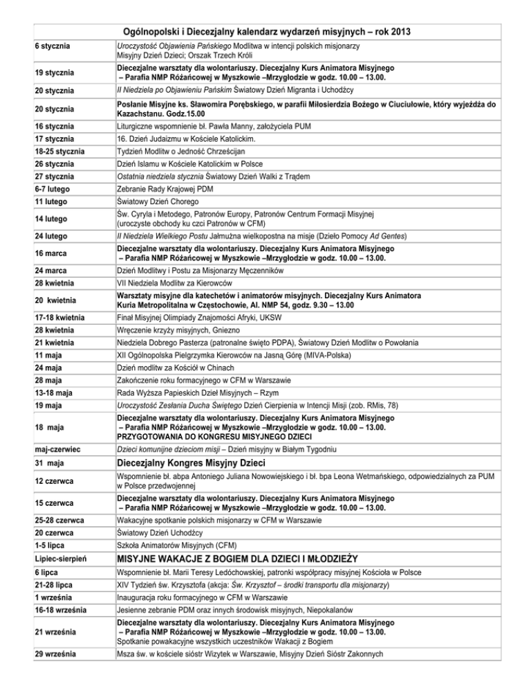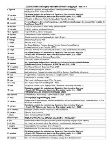Ogólnopolski i Diecezjalny kalendarz wydarzeń misyjnych – rok 2013 6 stycznia Uroczystość Objawienia Pańskiego Modlitwa w intencji polskich misjonarzy Misyjny Dzień Dzieci; Orszak Trzech Króli 19 stycznia Diecezjalne warsztaty dla wolontariuszy. Diecezjalny Kurs Animatora Misyjnego – Parafia NMP Różańcowej w Myszkowie –Mrzygłodzie w godz. 10.00 – 13.00. 20 stycznia II Niedziela po Objawieniu Pańskim Światowy Dzień Migranta i Uchodźcy 20 stycznia Posłanie Misyjne ks. Sławomira Porębskiego, w parafii Miłosierdzia Bożego w Ciuciułowie, który wyjeżdża do Kazachstanu. Godz.15.00 16 stycznia Liturgiczne wspomnienie bł. Pawła Manny, założyciela PUM 17 stycznia 16. Dzień Judaizmu w Kościele Katolickim. 18-25 stycznia Tydzień Modlitw o Jedność Chrześcijan 26 stycznia Dzień Islamu w Kościele Katolickim w Polsce 27 stycznia Ostatnia niedziela stycznia Światowy Dzień Walki z Trądem 6-7 lutego Zebranie Rady Krajowej PDM 11 lutego Światowy Dzień Chorego 14 lutego Św. Cyryla i Metodego, Patronów Europy, Patronów Centrum Formacji Misyjnej (uroczyste obchody ku czci Patronów w CFM) 24 lutego II Niedziela Wielkiego Postu Jałmużna wielkopostna na misje (Dzieło Pomocy Ad Gentes) 16 marca Diecezjalne warsztaty dla wolontariuszy. Diecezjalny Kurs Animatora Misyjnego – Parafia NMP Różańcowej w Myszkowie –Mrzygłodzie w godz. 10.00 – 13.00. 24 marca Dzień Modlitwy i Postu za Misjonarzy Męczenników 28 kwietnia VII Niedziela Modlitw za Kierowców 20 kwietnia Warsztaty misyjne dla katechetów i animatorów misyjnych. Diecezjalny Kurs Animatora Kuria Metropolitalna w Częstochowie, Al. NMP 54, godz. 9.30 – 13.00 17-18 kwietnia Finał Misyjnej Olimpiady Znajomości Afryki, UKSW 28 kwietnia Wręczenie krzyży misyjnych, Gniezno 21 kwietnia Niedziela Dobrego Pasterza (patronalne święto PDPA), Światowy Dzień Modlitw o Powołania 11 maja XII Ogólnopolska Pielgrzymka Kierowców na Jasną Górę (MIVA-Polska) 24 maja Dzień modlitw za Kościół w Chinach 28 maja Zakończenie roku formacyjnego w CFM w Warszawie 13-18 maja Rada Wyższa Papieskich Dzieł Misyjnych – Rzym 19 maja Uroczystość Zesłania Ducha Świętego Dzień Cierpienia w Intencji Misji (zob. RMis, 78) 18 maja Diecezjalne warsztaty dla wolontariuszy. Diecezjalny Kurs Animatora Misyjnego – Parafia NMP Różańcowej w Myszkowie –Mrzygłodzie w godz. 10.00 – 13.00. PRZYGOTOWANIA DO KONGRESU MISYJNEGO DZIECI maj-czerwiec Dzieci komunijne dzieciom misji – Dzień misyjny w Białym Tygodniu 31 maja Diecezjalny Kongres Misyjny Dzieci 12 czerwca Wspomnienie bł. abpa Antoniego Juliana Nowowiejskiego i bł. bpa Leona Wetmańskiego, odpowiedzialnych za PUM w Polsce przedwojennej 15 czerwca Diecezjalne warsztaty dla wolontariuszy. Diecezjalny Kurs Animatora Misyjnego – Parafia NMP Różańcowej w Myszkowie –Mrzygłodzie w godz. 10.00 – 13.00. 25-28 czerwca Wakacyjne spotkanie polskich misjonarzy w CFM w Warszawie 20 czerwca Światowy Dzień Uchodźcy 1-5 lipca Szkoła Animatorów Misyjnych (CFM) Lipiec-sierpień MISYJNE WAKACJE Z BOGIEM DLA DZIECI I MŁODZIEŻY 6 lipca Wspomnienie bł. Marii Teresy Ledóchowskiej, patronki współpracy misyjnej Kościoła w Polsce 21-28 lipca XIV Tydzień św. Krzysztofa (akcja: Św. Krzysztof – środki transportu dla misjonarzy) 1 września Inauguracja roku formacyjnego w CFM w Warszawie 16-18 września Jesienne zebranie PDM oraz innych środowisk misyjnych, Niepokalanów 21 września Diecezjalne warsztaty dla wolontariuszy. Diecezjalny Kurs Animatora Misyjnego – Parafia NMP Różańcowej w Myszkowie –Mrzygłodzie w godz. 10.00 – 13.00. Spotkanie powakacyjne wszystkich uczestników Wakacji z Bogiem 29 września Msza św. w kościele sióstr Wizytek w Warszawie, Misyjny Dzień Sióstr Zakonnych 1-31 października Październik różańcowy i misyjny 1 października Wspomnienie św. Teresy od Dzieciątka Jezus 5 października Światowa Eucharystyczna Godzina Święta – modlitwa dzieci w intencji pokoju w rodzinach i na całym świecie (inicjatywa apostolstwa fatimskiego w USA, w której uczestniczy PDMD) 19 października Warsztaty misyjne dla katechetów i animatorów misyjnych. Diecezjalny Kurs Animatora Kuria Metropolitalna w Częstochowie, Al. NMP 54, godz. 9.30 – 13.00 20 października Światowy Dzień Misyjny (przedostatnia niedziela października) 20-26 października Tydzień Misyjny 10 listopada II niedziela listopada Dzień Solidarności z Kościołem Prześladowanym 16 listopada Diecezjalne warsztaty dla wolontariuszy. Diecezjalny Kurs Animatora Misyjnego – Parafia NMP Różańcowej w Myszkowie –Mrzygłodzie w godz. 10.00 – 13.00. 17 listopada Światowy Dzień Pamięci o Ofiarach Wypadków Drogowych (MIVA-Polska) 3 grudnia Wspomnienie św. Franciszka Ksawerego 7-8 grudnia Sesja misjologiczna na Jasnej Górze oraz doroczne czuwanie Papieskiej Unii Misyjnej 14 lub 21 grudnia Posłanie misyjne Kolędników. Spotkanie opłatkowe grup dziecięcych z Archidiecezji Częstochowskiej – Parafia NMP Różańcowej w Myszkowie –Mrzygłodzie w godz. 10.00 – 15.00. 8 grudnia II Niedziela Adwentu Dzień Modlitwy za Kościół na Wschodzie 26 grudnia Posłanie kolędników w parafiach Grudzień Kolędnicy Misyjni 2013
