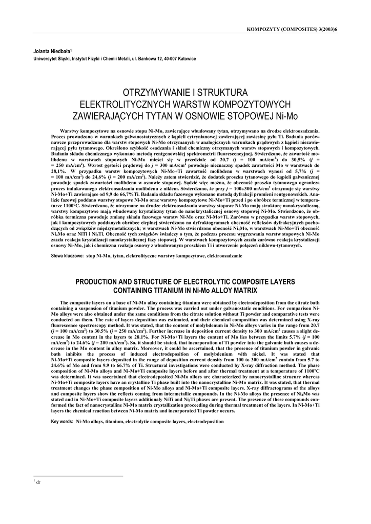 KOMPOZYTY (COMPOSITES) 3(2003)6 Jolanta Niedbała1 Uniwersytet Śląski, Instytut Fizyki i Chemii Metali, ul. Bankowa 12, 40-007 Katowice OTRZYMYWANIE I STRUKTURA ELEKTROLITYCZNYCH WARSTW KOMPOZYTOWYCH ZAWIERAJĄCYCH TYTAN W OSNOWIE STOPOWEJ Ni-Mo Warstwy kompozytowe na osnowie stopu Ni-Mo, zawierające wbudowany tytan, otrzymywano na drodze elektroosadzania. Proces prowadzono w warunkach galwanostatycznych z kąpieli cytrynianowej zawierającej zawiesinę pyłu Ti. Badania porównawcze przeprowadzono dla warstw stopowych Ni-Mo otrzymanych w analogicznych warunkach prądowych z kąpieli niezawierającej pyłu tytanowego. Określono szybkość osadzania i skład chemiczny otrzymanych warstw stopowych i kompozytowych. Badania składu chemicznego wykonano metodą rentgenowskiej spektrometrii fluorescencyjnej. Stwierdzono, że zawartość molibdenu w warstwach stopowych Ni-Mo mieści się w przedziale od 20,7 (j = 100 mA/cm2) do 30,5% (j = = 250 mA/cm2). Wzrost gęstości prądowej do j = 300 mA/cm2 powoduje nieznaczny spadek zawartości Mo w warstwach do 28,1%. W przypadku warstw kompozytowych Ni-Mo+Ti zawartość molibdenu w warstwach wynosi od 5,7% (j = = 100 mA/cm2) do 24,6% (j = 200 mA/cm2). Należy zatem stwierdzić, że dodatek proszku tytanowego do kąpieli galwanicznej powoduje spadek zawartości molibdenu w osnowie stopowej. Sądzić więc można, że obecność proszku tytanowego ogranicza proces indukowanego elektroosadzania molibdenu z niklem. Stwierdzono, że przy j = 100÷300 mA/cm2 otrzymuje się warstwy Ni-Mo+Ti zawierające od 9,9 do 66,7%Ti. Badania składu fazowego wykonano metodą dyfrakcji promieni rentgenowskich. Analizie fazowej poddano warstwy stopowe Ni-Mo oraz warstwy kompozytowe Ni-Mo+Ti przed i po obróbce termicznej w temperaturze 1100°C. Stwierdzono, że otrzymane na drodze elektroosadzania warstwy stopowe Ni-Mo mają strukturę nanokrystaliczną, warstwy kompozytowe mają wbudowany krystaliczny tytan do nanokrystalicznej osnowy stopowej Ni-Mo. Stwierdzono, że obróbka termiczna powoduje zmianę składu fazowego warstw Ni-Mo oraz Ni-Mo+Ti. Zarówno w przypadku warstw stopowych, jak i kompozytowych poddanych obróbce cieplnej stwierdzono na dyfraktogramach obecność refleksów dyfrakcyjnych pochodzących od związków międzymetalicznych; w warstwach Ni-Mo stwierdzono obecność Ni4Mo, w warstwach Ni-Mo+Ti obecność Ni4Mo oraz NiTi i Ni3Ti. Obecność tych związków świadczy o tym, że podczas procesu wygrzewania warstw stopowych Ni-Mo zaszła reakcja krystalizacji nanokrystalicznej fazy stopowej. W warstwach kompozytowych zaszła zarówno reakcja krystalizacji osnowy Ni-Mo, jak i chemiczna reakcja osnowy z wbudowanym proszkiem Ti i utworzenie połączeń niklowo-tytanowych. Słowa kluczowe: stop Ni-Mo, tytan, elektrolityczne warstwy kompozytowe, elektroosadzanie PRODUCTION AND STRUCTURE OF ELECTROLYTIC COMPOSITE LAYERS CONTAINING TITANIUM IN Ni-Mo ALLOY MATRIX The composite layers on a base of Ni-Mo alloy containing titanium were obtained by electrodeposition from the citrate bath containing a suspension of titanium powder. The process was carried out under galvanostatic conditions. For comparison NiMo alloys were also obtained under the same conditions from the citrate solution without Ti powder and comparative tests were conducted on them. The rate of layers deposition was estimated, and their chemical composition was determined using X-ray fluorescence spectroscopy method. It was stated, that the content of molybdenum in Ni-Mo alloys varies in the range from 20.7 (j = 100 mA/cm2) to 30.5% (j = 250 mA/cm2). Further increase in deposition current density to 300 mA/cm2 causes a slight decrease in Mo content in the layers to 28.1%. For Ni-Mo+Ti layers the content of Mo lies between the limits 5.7% (j = 100 mA/cm2) to 24.6% (j = 200 mA/cm2). So, it should be stated, that incorporation of Ti powder into the galvanic bath causes a decrease in the Mo content in alloy matrix. Moreover, it could be ascertained, that the presence of titanium powder in galvanic bath inhibits the process of induced electrodeposition of molybdenium with nickel. It was stated that Ni-Mo+Ti composite layers deposited in the range of deposition current density from 100 to 300 mA/cm2 contain from 5.7 to 24.6% of Mo and from 9.9 to 66.7% of Ti. Structural investigations were conducted by X-ray diffraction method. The phase composition of Ni-Mo alloys and Ni-Mo+Ti composite layers before and after thermal treatment at a temperature of 1100oC was determined. It was ascertained that electrodeposited Ni-Mo alloys are characterized by nanocrystalline strucure whereas Ni-Mo+Ti composite layers have an crystalline Ti phase built into the nanocrystalline Ni-Mo matrix. It was stated, that thermal treatment changes the phase composition of Ni-Mo alloys and Ni-Mo+Ti composite layers. X-ray diffractograms of the alloys and composite layers show the reflects coming from intermetallic compounds. In the Ni-Mo alloys the presence of Ni4Mo was stated and in Ni-Mo+Ti composite layers additionaly NiTi and Ni3Ti phases are present. The presence of these compounds conformed the fact of nanocrystalline Ni-Mo matrix crystallization proceeding during thermal treatment of the layers. In Ni-Mo+Ti layers the chemical reaction between Ni-Mo matrix and incorporated Ti powder occurs. Key words: Ni-Mo alloys, titanium, electrolytic composite layers, electrodeposition 1 dr 54 J. Niedbała WSTĘP W procesie elektrolitycznego osadzania warstw kompozytowych istnieje możliwość wykorzystywania zdolności wbudowywania zdyspergowanych cząstek z zawiesiny kąpieli galwanicznej w strukturę materiału osnowy [1, 2]. Celowość takiego postępowania jest zasadna, gdy w zasadniczy sposób zmienia ono właściwości otrzymanej warstwy. Stąd wiele prac poświęcono otrzymywaniu materiałów kompozytowych na drodze elektrochemicznej poprzez wprowadzenie do galwanicznej kąpieli i następnie wbudowanie do warstwy galwanicznej r
