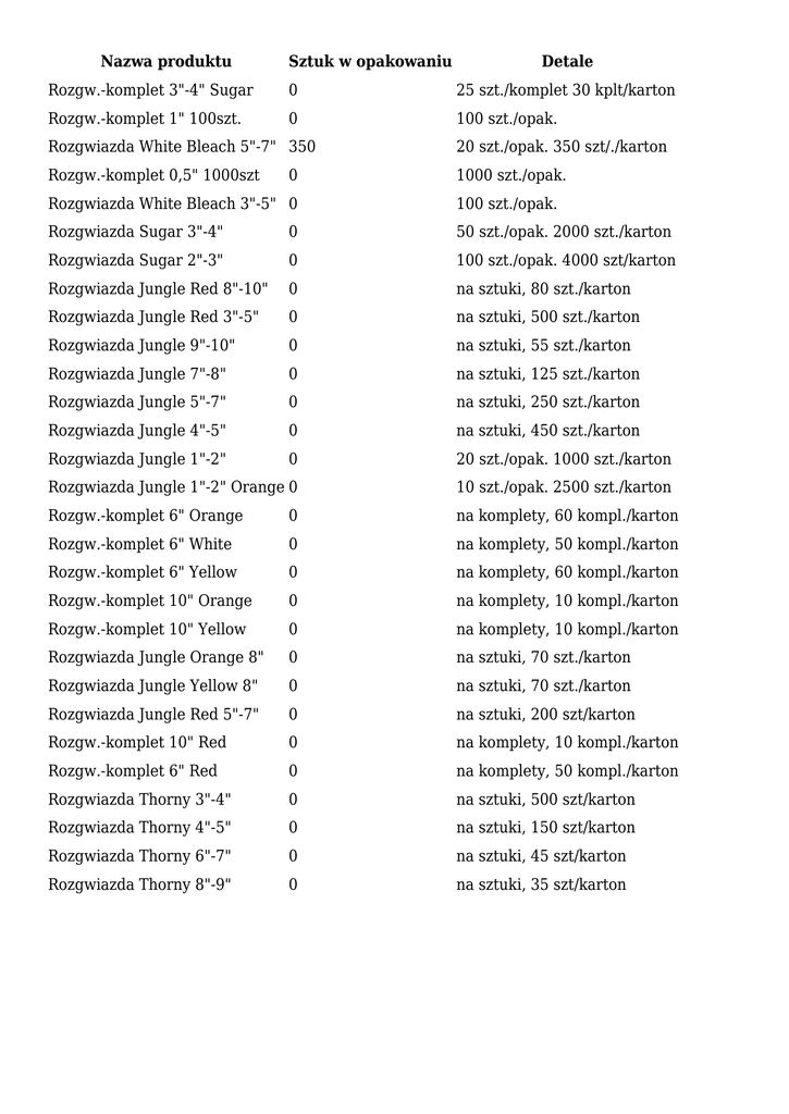 Nazwa produktu Sztuk w opakowaniu Detale Rozgw.-komplet 3"-4" Sugar 0 25 szt./komplet 30 kplt/karton Rozgw.-komplet 1" 100szt. 0 100 szt./opak. Rozgwiazda White Bleach 5"-7" 350 20 szt./opak. 350 szt/./karton Rozgw.-komplet 0,5" 1000szt 1000 szt./opak. 0 Rozgwiazda White Bleach 3"-5" 0 100 szt./opak. Rozgwiazda Sugar 3"-4" 0 50 szt./opak. 2000 szt./karton Rozgwiazda Sugar 2"-3" 0 100 szt./opak. 4000 szt/karton Rozgwiazda Jungle Red 8"-10" 0 na sztuki, 80 szt./karton Rozgwiazda Jungle Red 3"-5" 0 na sztuki, 500 szt./karton Rozgwiazda Jungle 9"-10" 0 na sztuki, 55 szt./karton Rozgwiazda Jungle 7"-8" 0 na sztuki, 125 szt./karton Rozgwiazda Jungle 5"-7" 0 na sztuki, 250 szt./karton Rozgwiazda Jungle 4"-5" 0 na sztuki, 450 szt./karton Rozgwiazda Jungle 1"-2" 0 20 szt./opak. 1000 szt./karton Rozgwiazda Jungle 1"-2" Orange 0 10 szt./opak. 2500 szt./karton Rozgw.-komplet 6" Orange 0 na komplety, 60 kompl./karton Rozgw.-komplet 6" White 0 na komplety, 50 kompl./karton Rozgw.-komplet 6" Yellow 0 na komplety, 60 kompl./karton Rozgw.-komplet 10" Orange 0 na komplety, 10 kompl./karton Rozgw.-komplet 10" Yellow 0 na komplety, 10 kompl./karton Rozgwiazda Jungle Orange 8" 0 na sztuki, 70 szt./karton Rozgwiazda Jungle Yellow 8" 0 na sztuki, 70 szt./karton Rozgwiazda Jungle Red 5"-7" 0 na sztuki, 200 szt/karton Rozgw.-komplet 10" Red 0 na komplety, 10 kompl./karton Rozgw.-komplet 6" Red 0 na komplety, 50 kompl./karton Rozgwiazda Thorny 3"-4" 0 na sztuki, 500 szt/karton Rozgwiazda Thorny 4"-5" 0 na sztuki, 150 szt/karton Rozgwiazda Thorny 6"-7" 0 na sztuki, 45 szt/karton Rozgwiazda Thorny 8"-9" 0 na sztuki, 35 szt/karton