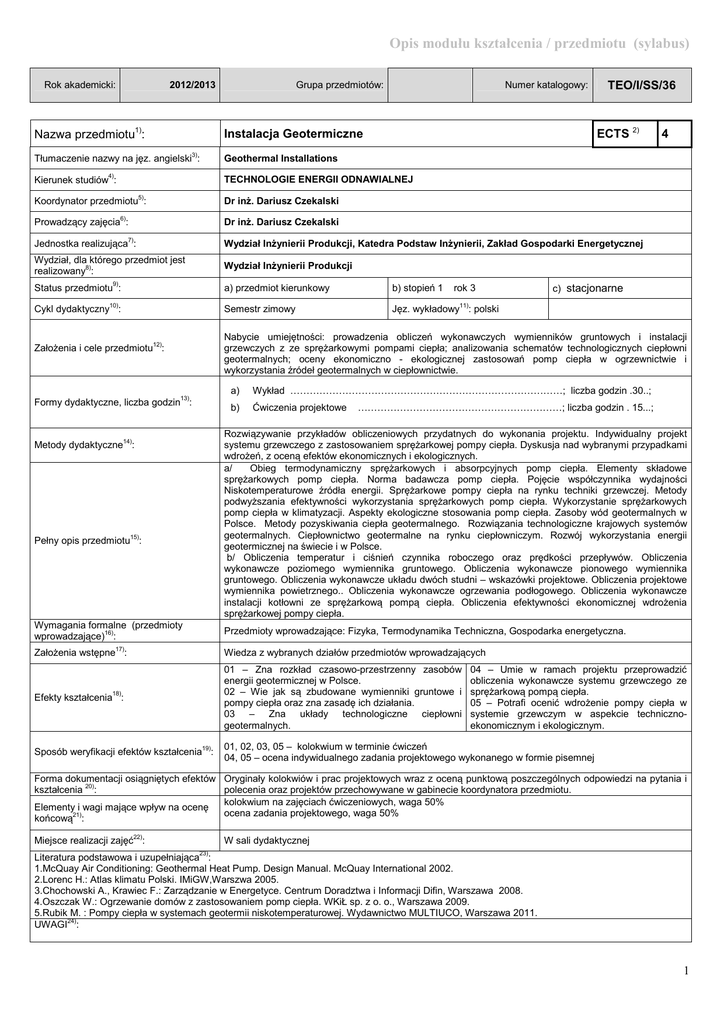 Opis modułu kształcenia / przedmiotu (sylabus) 2012/2013 Rok akademicki: Grupa przedmiotów: Nazwa przedmiotu1): Instalacja Geotermiczne Tłumaczenie nazwy na jęz. angielski3): Geothermal Installations 4) Numer katalogowy: TEO/I/SS/36 ECTS 2) 4 TECHNOLOGIE ENERGII ODNAWIALNEJ Kierunek studiów : Koordynator przedmiotu5): Dr inż. Dariusz Czekalski 6) Dr inż. Dariusz Czekalski Prowadzący zajęcia : 7) Jednostka realizująca : Wydział Inżynierii Produkcji, Katedra Podstaw Inżynierii, Zakład Gospodarki Energetycznej Wydział, dla którego przedmiot jest realizowany8): Wydział Inżynierii Produkcji 9) Status przedmiotu : a) przedmiot kierunkowy 10) Cykl dydaktyczny : Semestr zimowy b) stopień 1 rok 3 c) stacjonarne 11) Jęz. wykładowy : polski Nabycie umiejętności: prowadzenia obliczeń wykonawczych wymienników gruntowych i instalacji grzewczych z ze sprężarkowymi pompami ciepła; analizowania schematów technologicznych ciepłowni geotermalnych; oceny ekonomiczno - ekologicznej zastosowań pomp ciepła w ogrzewnictwie i wykorzystania źródeł geotermalnych w ciepłownictwie. Założenia i cele przedmiotu12): Formy dydaktyczne, liczba godzin13): a) Wykład …………………………………………………………………………; liczba godzin .30..; b) Ćwiczenia projektowe ………………………………………………………; liczba godzin . 15...; Rozwiązywanie przykładów obliczeniowych przydatnych do wykonania projektu. Indywidualny projekt systemu grzewczego z zastosowaniem sprężarkowej pompy ciepła. Dyskusja nad wybranymi przypadkami wdrożeń, z oceną efektów ekonomicznych i ekologicznych. Obieg termodynamiczny sprężarkowych i absorpcyjnych pomp ciepła. Elementy składowe a/ sprężarkowych pomp ciepła. Norma badawcza pomp ciepła. Pojęcie współczynnika wydajności Niskotemperaturowe źródła energii. Sprężarkowe pompy ciepła na rynku techniki grzewczej. Metody podwyższania efektywności wykorzystania sprężarkowych pomp ciepła. Wykorzystanie sprężarkowych pomp ciepła w klimatyzacji. Aspekty ekologiczne stosowania pomp ciepła. Zasoby wód geotermalnych w Polsce. Metody pozyskiwania ciepła geotermalnego. Rozwiązania technologiczne krajowych systemów geotermalnych. Ciepłownictwo geotermalne na rynku ciepłowniczym. Rozwój wykorzystania energii geotermicznej na świecie i w Polsce. b/ Obliczenia temperatur i ciśnień czynnika roboczego oraz prędkości przepływów. Obliczenia wykonawcze poziomego wymiennika gruntowego. Obliczenia wykonawcze pionowego wymiennika gruntowego. Obliczenia wykonawcze układu dwóch studni – wskazówki projektowe. Obliczenia projektowe wymiennika powietrznego.. Obliczenia wykonawcze ogrzewania podłogowego. Obliczenia wykonawcze instalacji kotłowni ze sprężarkową pompą ciepła. Obliczenia efektywności ekonomicznej wdrożenia sprężarkowej pompy ciepła. Metody dydaktyczne14): Pełny opis przedmiotu15): Wymagania formalne (przedmioty wprowadzające)16): Przedmioty wprowadzające: Fizyka, Termodynamika Techniczna, Gospodarka energetyczna. 17) Założenia wstępne : Wiedza z wybranych działów przedmiotów wprowadzających Efekty kształcenia18): 01 – Zna rozkład czasowo-przestrzenny zasobów energii geotermicznej w Polsce. 02 – Wie jak są zbudowane wymienniki gruntowe i pompy ciepła oraz zna zasadę ich działania. 03 – Zna układy technologiczne ciepłowni geotermalnych. Sposób weryfikacji efektów kształcenia19): 01, 02, 03, 05 – kolokwium w terminie ćwiczeń 04, 05 – ocena indywidualnego zadania projektowego wykonanego w formie pisemnej 04 – Umie w ramach projektu przeprowadzić obliczenia wykonawcze systemu grzewczego ze sprężarkową pompą ciepła. 05 – Potrafi ocenić wdrożenie pompy ciepła w systemie grzewczym w aspekcie technicznoekonomicznym i ekologicznym. Forma dokumentacji osiągniętych efektów Oryginały kolokwiów i prac projektowych wraz z oceną punktową poszczególnych odpowiedzi na pytania i kształcenia 20): polecenia oraz projektów przechowywane w gabinecie koordynatora przedmiotu. kolokwium na zajęciach ćwiczeniowych, waga 50% Elementy i wagi mające wpływ na ocenę ocena zadania projektowego, waga 50% 21) końcową : Miejsce realizacji zajęć22): W sali dydaktycznej 23) Literatura podstawowa i uzupełniająca : 1.McQuay Air Conditioning: Geothermal Heat Pump. Design Manual. McQuay International 2002. 2.Lorenc H.: Atlas klimatu Polski. IMiGW,Warszwa 2005. 3.Chochowski A., Krawiec F.: Zarządzanie w Energetyce. Centrum Doradztwa i Informacji Difin, Warszawa 2008. 4.Oszczak W.: Ogrzewanie domów z zastosowaniem pomp ciepła. WKiŁ sp. z o. o., Warszawa 2009. 5.Rubik M. : Pompy ciepła w systemach geotermii niskotemperaturowej. Wydawnictwo MULTIUCO, Warszawa 2011. UWAGI24): 1 Wskaźniki ilościowe charakteryzujące moduł/przedmiot25) : Szacunkowa sumaryczna liczba godzin pracy studenta (kontaktowych i pracy własnej) niezbędna dla osiągnięcia zakładanych efektów kształcenia18) - na tej podstawie należy wypełnić pole ECTS2: Łączna liczba punktów ECTS, którą student uzyskuje na zajęciach wymagających bezpośredniego udziału nauczycieli akademickich: Łączna liczba punktów ECTS, którą student uzyskuje w ramach zajęć o charakterze praktycznym, takich jak zajęcia laboratoryjne, projektowe, itp.: …92……. H …2……. ECTS …1……. ECTS Tabela zgodności kierunkowych efektów kształcenia efektami przedmiotu 26) Nr /symbol efektu 01 02 Wymienione w wierszu efekty kształcenia: Zna rozkład czasowo-przestrzenny zasobów energii geotermicznej w Polsce. Odniesienie do efektów dla programu kształcenia na kierunku K_W01, K_W07 Wie jak są zbudowane wymienniki gruntowe i pompy ciepła oraz zna zasadę ich K_W08 działania. 03 Zna układy technologiczne ciepłowni geotermalnych. K_W08 04 Umie w ramach projektu przeprowadzić obliczenia wykonawcze systemu grzewczego ze sprężarkową pompą ciepła. Potrafi ocen
