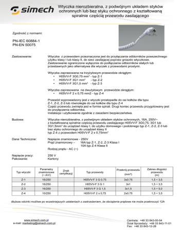 Wtyczka nierozbieralna, z podwójnym układem styków ochronnych lub bez styku ochronnego z kształtowaną spiralnie częścią przewodu zasilającego Zgodność z normami: PN-IEC 60884-1 PN-EN 50075 Zastosowanie: Wtyczka z przewodem przeznaczona jest do przyłączania odbiorników powszechnego użytku klasy I lub klasy II, do sieci zasilającej poprzez gniazdo wtyczkowe. Zastosowanie ograniczone wyłącznie do podłączania odbiorników stałych lub przestawnych jako alternatywa dla wtyczek z przewodami prostymi. Wtyczka zaprasowana na trzyżyłowym przewodzie okrągłym: • H05VV-F 3G0,75 mm2 - typ Z-1 • H05VV-F 3G1 mm2 - typ Z-2 • H05VV-F 3G1,5 mm2 - typ Z-3 Wtyczka zaprasowana na dwużyłowym przewodzie okrągłym: • H05VV-F 2 x 0,75 mm2 - typ Z-4 Przewód wyprowadzony jest z wtyczki prostopadle do osi kołków dla typu Z-1, Z-2, Z-3 lub równolegle do osi kołków dla typu Z-4 Część przewodu zwinięta jest w formie spirali. Drugi koniec przewodu przygotowany jest do przyłączenia odbiornika. Instalacja i użytkowanie zgodnie z zasadami bezpieczeństwa. Budowa: Wtyczka nierozbieralna, z podwójnym układem styków ochronnych, 16A, 250V~ z kształtowaną spiralnie częścią przewodu zasilającego H05VV-F 3G0,75; 3G1 lub 3G1,5mm2 do urządzeń klasy I, do użytku domowego i podobnego typ Z-1, Z-2, Z-3 lub bez styku ochronnego do urządzeń klasy II typ Z-4 z przewodem H05VV-F 2 x 0,75mm2 Dane Techniczne: Napięcie znamionowe - 250V Prąd znamionowy – 16A typ Z-1, Z-2, Z-3 Klasa I 10A typ Z-4 Klasa II Rodzaj prądu - AC (~) Napięcie pracy: Pakowanie: 250 V Kartony Typ wtyczki Parametry znamionowe (~ A/V) (mm²) Zakres długości przewodu (m) Z-1 16/250 H05VV-F 3 G 0,75 3x0.75 1,5 ÷ 3,5 Z-2 16/250 H05VV-F 3 G 1 3x1 1,5 ÷ 3,5 Z-3 16/250 H05VV-F 3 G 1,5 3x1,5 1,5 ÷ 5,0 Z-4 10/250 H05VV-F 2 x 0,75 2x0.75 1,5 ÷ 3,5 Znak certyfikacji Typ przewody Przekrój przewodu dłuższe odcinki możliwe po wcześniejszych ustaleniach z zastrzeżeniem, że obciążenie prądowe nie może przekroczyć 12A www.simech.com.pl e-mail: [email protected] Centrala: +48 33 843-00-54 Dział Sprzedaży: +48 33 843-11-01 Fax: +48 33 843-12-28