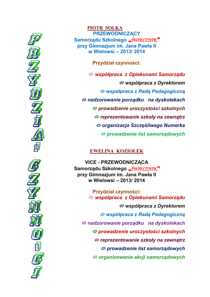 PIOTR SOLKA PRZEWODNICZĄCY Samorządu Szkolnego „ŚWIECZNIK” przy Gimnazjum im. Jana Pawła II w Wielowsi – 2013/ 2014 Przydział czynności: współpraca z Opiekunami Samorządu współpraca z Dyrektorem współpraca z Radą Pedagogiczną nadzorowanie porządku na dyskotekach prowadzenie uroczystości szkolnych reprezentowanie szkoły na zewnątrz organizacja Szczęśliwego Numerka prowadzenie list samorządowych EWELINA KOZIOŁEK VICE - PRZEWODNICZĄCA Samorządu Szkolnego „ŚWIECZNIK” przy Gimnazjum im. Jana Pawła II w Wielowsi – 2013/ 2014 Przydział czynności: współpraca z Opiekunami Samorządu współpraca z Dyrektorem współpraca z Radą Pedagogiczną nadzorowanie porządku na dyskotekach prowadzenie uroczystości szkolnych reprezentowanie szkoły na zewnątrz prowadzenie list samorządowych organizowanie akcji samorządowych SEBASTIAN BIENIEK SEKRETARZ Samorządu Szkolnego „ŚWIECZNIK” przy Gimnazjum im. Jana Pawła II w Wielowsi – 2012/ 13 Przydział czynności: współpraca z Opiekunami Samorządu współpraca z Dyrektorem współpraca z Radą Pedagogiczną nadzorowanie porządku na dyskotekach redagowanie notatek z uroczystości szkolnych – współpraca z kronikarzem i sprawozdawcą www. nadzorowanie list dyżurów samorządowych JULIA KNOPIK KRONIKARZ Samorządu Szkolnego „ŚWIECZNIK” przy Gimnazjum im. Jana Pawła II w Wielowsi – 2013/ 2014 Przydział czynności: współpraca z Opiekunami Samorządu współpraca z Dyrektorem współpraca z Radą Pedagogiczną prowadzenie kroniki samorządowej - współpraca z sekretarzem i sprawozdawcą sprawy organizacyjne organizowanie akcji samorządowych pomoc w prowadzeniu sklepiku na dyskotekach i uroczystościach szkolnych DANIEL OSMAN manager nagłośnienia Samorządu Szkolnego „ŚWIECZNIK” na uroczystościach szkolnych w Gimnazjum im. Jana Pawła II w Wielowsi – 2013/ 2014 Przydział czynności: współpraca z Opiekunami Samorządu współpraca z Radą Pedagogiczną dbanie o sprzęt nagłośnieniowy nadzorowanie aktualizacji sprzętu JULIA WALCZYSZYN SKARBNIK Samorządu Szkolnego „ŚWIECZNIK” przy Gimnazjum im. Jana Pawła II w Wielowsi – 2013/ 2014 Przydział czynności: organizowanie akcji samorządowych współpraca z Opiekunami Samorządu zbieranie wpłat od skarbników klasowych zbieranie składek na dyskotekach prowadzenie list samorządowych pomoc w prowadzeniu sklepiku na dyskotekach i uroczystościach szkolnych JULIA MIGAS AKCJE CHARYTATYWNE Samorządu Szkolnego „ŚWIECZNIK” przy Gimnazjum im. Jana Pawła II w Wielowsi – 2013/ 2014 Przydział czynności: organizowanie akcji samorządowych współpraca z Opiekunami Samorządu pomoc w zbieraniu wpłat od skarbników klasowych prowadzenie list samorządowych organizacja akcji charytatywnych pomoc w prowadzeniu sklepiku na dyskotekach i uroczystościach szkolnych ADRIANNA GUSDEK DYŻURY UCZNIOWSKIE Samorządu Szkolnego „ŚWIECZNIK” przy Gimnazjum im. Jana Pawła II w Wielowsi – 2013/ 2014 Przydział czynności: nadzorowanie wystroju gazetek udział w organizowaniu akcji samorządowych współpraca z Opiekunami Samorządu organizowanie i nadzorowanie dyżurów samorządowych nadzorowanie porządku na dyskotekach sprawy organizacyjne DOMINIK BREMORA SEKRETARZ STRONY INTERNETOWEJ Samorządu Szkolnego „ŚWIECZNIK” przy Gimnazjum im. Jana Pawła II w Wielowsi – 2013/ 2014 Przydział czynności: współpraca z Opiekunami Samorządu współpraca z Dyrektorem współpraca z Radą Pedagogiczną nadzorowanie porządku na dyskotekach sprawy organizacyjne współpraca ze stroną www.gimbuda.szkola.pl udział w akcjach samorządowych ANDREAS OSMAN manager nagłośnienia Samorządu Szkolnego „ŚWIECZNIK” na uroczystościach szkolnych w Gimnazjum im. Jana Pawła II w Wielowsi – 2013/ 2014 Przydział czynności: współpraca z Opiekunami Samorządu współpraca z Radą Pedagogiczną dbanie o sprzęt nagłośnieniowy nadzorowanie aktualizacji sprzętu