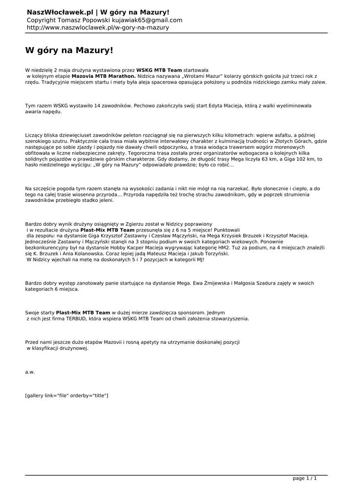 NaszWłocławek.pl | W góry na Mazury! Copyright Tomasz Popowski [email protected] http://www.naszwloclawek.pl/w-gory-na-mazury W góry na Mazury! W niedzielę 2 maja drużyna wystawiona przez WSKG MTB Team startowała w kolejnym etapie Mazovia MTB Marathon. Nidzica nazywana „Wrotami Mazur” kolarzy górskich gościła już trzeci rok z rzędu. Tradycyjnie miejscem startu i mety była aleja spacerowa opasująca położony u podnóża nidzickiego zamku mały zalew. Tym razem WSKG wystawiło 14 zawodników. Pechowo zakończyła swój start Edyta Macieja, którą z walki wyeliminowała awaria napędu. Liczący bliska dziewięciuset zawodników peleton rozciągnął się na pierwszych kilku kilometrach: wpierw asfaltu, a później szerokiego szutru. Praktycznie cała trasa miała wybitnie interwałowy charakter z kulminacją trudności w Złotych Górach, gdzie następujące po sobie zjazdy i pojazdy nie dawały chwili odpoczynku, a trasa wiodąca trawersem wzgórz morenowych obfitowała w liczne niebezpieczne zakręty. Tegoroczna trasa została przez organizatorów wzbogacona o kolejnych kilka solidnych pojazdów o prawdziwie górskim charakterze. Gdy dodamy, że długość trasy Mega liczyła 63 km, a Giga 102 km, to hasło niedzielnego wyścigu: „W góry na Mazury” odpowiadało prawdzie; było co robić… Na szczęście pogoda tym razem stanęła na wysokości zadania i nikt nie mógł na nią narzekać. Było słonecznie i ciepło, a do tego na całej trasie wiosenna przyroda… Przyroda napędziła też trochę strachu zawodnikom, gdy w poprzek strumienia zawodników przebiegło stadko jeleni. Bardzo dobry wynik drużyny osiągnięty w Zgierzu został w Nidzicy poprawiony i w rezultacie drużyna Plast-Mix MTB Team przesunęła się z 6 na 5 miejsce! Punktowali dla zespołu: na dystansie Giga Krzysztof Zastawny i Czesław Mączyński, na Mega Krzysiek Brzuzek i Krzysztof Macieja. Jednocześnie Zastawny i Mączyński stanęli na 3 stopniu podium w swoich kategoriach wiekowych. Ponownie bezkonkurencyjny był na dystansie Hobby Kacper Macieja wygrywając kategorię HM2. Tuż za podium, na 4 miejscach znaleźli się K. Brzuzek i Ania Kolanowska. Coraz lepiej jadą Mateusz Macieja i Jakub Torzyński. W Nidzicy wjechali na metę na doskonałych 5 i 7 pozycjach w kategorii MJ! Bardzo dobry występ zanotowały panie startujące na dystansie Mega. Ewa Żmijewska i Małgosia Szadura zajęły w swoich kategoriach 6 miejsca. Swoje starty Plast-Mix MTB Team w dużej mierze zawdzięcza sponsorom. Jednym z nich jest firma TERBUD, która wspiera WSKG MTB Team od chwili założenia stowarzyszenia. Przed nami jeszcze dużo etapów Mazovii i rosną apetyty na utrzymanie doskonałej pozycji w klasyfikacji drużynowej. a.w. [gallery link="file" orderby="title"] page 1 / 1