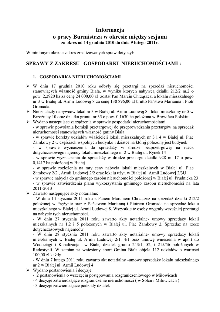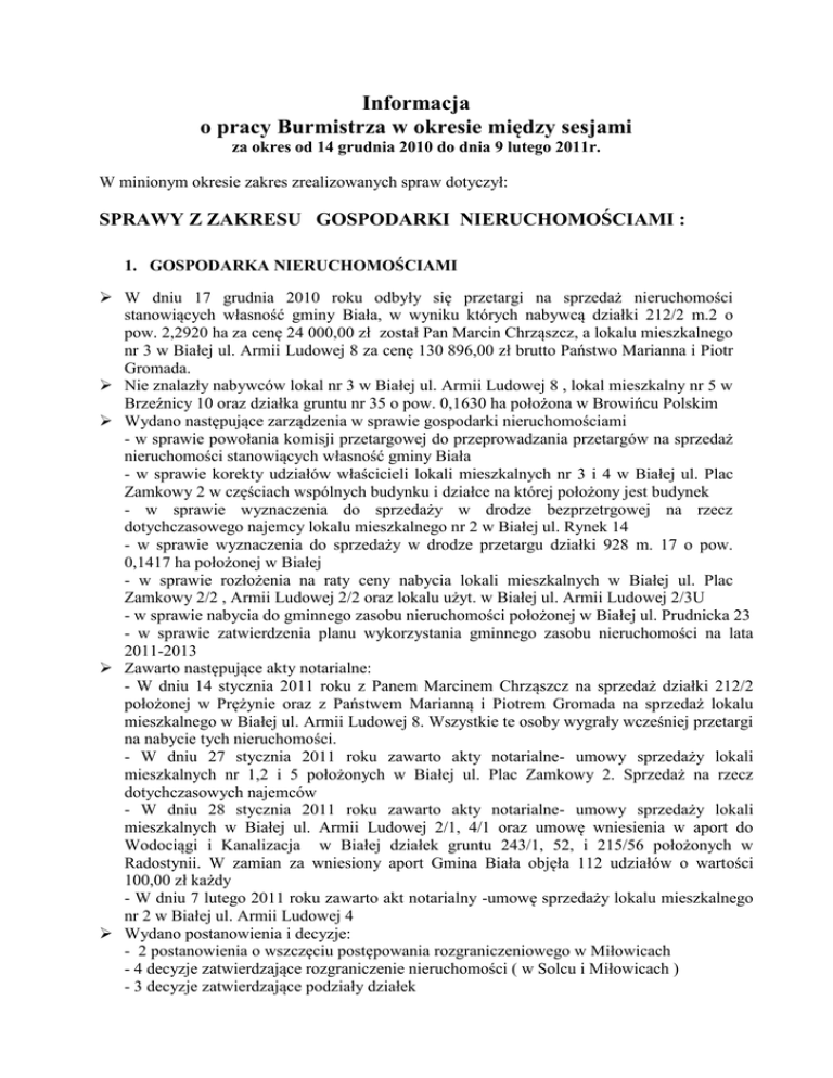Informacja o pracy Burmistrza w okresie między sesjami za okres od 14 grudnia 2010 do dnia 9 lutego 2011r. W minionym okresie zakres zrealizowanych spraw dotyczył: SPRAWY Z ZAKRESU GOSPODARKI NIERUCHOMOŚCIAMI : 1. GOSPODARKA NIERUCHOMOŚCIAMI W dniu 17 grudnia 2010 roku odbyły się przetargi na sprzedaż nieruchomości stanowiących własność gminy Biała, w wyniku których nabywcą działki 212/2 m.2 o pow. 2,2920 ha za cenę 24 000,00 zł został Pan Marcin Chrząszcz, a lokalu mieszkalnego nr 3 w Białej ul. Armii Ludowej 8 za cenę 130 896,00 zł brutto Państwo Marianna i Piotr Gromada. Nie znalazły nabywców lokal nr 3 w Białej ul. Armii Ludowej 8 , lokal mieszkalny nr 5 w Brzeźnicy 10 oraz działka gruntu nr 35 o pow. 0,1630 ha położona w Browińcu Polskim Wydano następujące zarządzenia w sprawie gospodarki nieruchomościami - w sprawie powołania komisji przetargowej do przeprowadzania przetargów na sprzedaż nieruchomości stanowiących własność gminy Biała - w sprawie korekty udziałów właścicieli lokali mieszkalnych nr 3 i 4 w Białej ul. Plac Zamkowy 2 w częściach wspólnych budynku i działce na której położony jest budynek - w sprawie wyznaczenia do sprzedaży w drodze bezprzetrgowej na rzecz dotychczasowego najemcy lokalu mieszkalnego nr 2 w Białej ul. Rynek 14 - w sprawie wyznaczenia do sprzedaży w drodze przetargu działki 928 m. 17 o pow. 0,1417 ha położonej w Białej - w sprawie rozłożenia na raty ceny nabycia lokali mieszkalnych w Białej ul. Plac Zamkowy 2/2 , Armii Ludowej 2/2 oraz lokalu użyt. w Białej ul. Armii Ludowej 2/3U - w sprawie nabycia do gminnego zasobu nieruchomości położonej w Białej ul. Prudnicka 23 - w sprawie zatwierdzenia planu wykorzystania gminnego zasobu nieruchomości na lata 2011-2013 Zawarto następujące akty notarialne: - W dniu 14 stycznia 2011 roku z Panem Marcinem Chrząszcz na sprzedaż działki 212/2 położonej w Prężynie oraz z Państwem Marianną i Piotrem Gromada na sprzedaż lokalu mieszkalnego w Białej ul. Armii Ludowej 8. Wszystkie te osoby wygrały wcześniej przetargi na nabycie tych nieruchomości. - W dniu 27 stycznia 2011 roku zawarto akty notarialne- umowy sprzedaży lokali mieszkalnych nr 1,2 i 5 położonych w Białej ul. Plac Zamkowy 2. Sprzedaż na rzecz dotychczasowych najemców - W dniu 28 stycznia 2011 roku zawarto akty notarialne- umowy sprzedaży lokali mieszkalnych w Białej ul. Armii Ludowej 2/1, 4/1 oraz umowę wniesienia w aport do Wodociągi i Kanalizacja w Białej działek gruntu 243/1, 52, i 215/56 położonych w Radostynii. W zamian za wniesiony aport Gmina Biała objęła 112 udziałów o wartości 100,00 zł każdy - W dniu 7 lutego 2011 roku zawarto akt notarialny -umowę sprzedaży lokalu mieszkalnego nr 2 w Białej ul. Armii Ludowej 4 Wydano postanowienia i decyzje: - 2 postanowienia o wszczęciu postępowania rozgraniczeniowego w Miłowicach - 4 decyzje zatwierdzające rozgraniczenie nieruchomości ( w Solcu i Miłowicach ) - 3 decyzje zatwierdzające podziały działek Wybrano i podpisano umowę z rzeczoznawcą majątkowym Panem Andrzejem Kowalem na sporządzanie operatów szacunkowych dla celów sprzedaży nieruchomości. SPRAWY Z ZAKRESU REFERATU INŻYNIERII KOMUNALNEJ I INTEGRACJI EUROPEJSKIEJ : 1. Wybrano wykonawcę map do celów projektowych związanych z adaptacją i budową boiska wielofunkcyjnego (ORLIK 2012) w Białej – park miejski. Wykonawcą jest Biuro Usług Geodezyjnych Stanisław Jaśkowiec z siedzibą w Prudniku, koszt opracowania 8 610,00 zł brutto. 2. Wybrano wykonawcę na adaptację projektu typowego (ORLIK 2012) którym został PRONABUD Jerzy Sylwestrzak z siedzibą w Prudniku. Koszt opracowania 12 300,00 zł brutto. 3. Dokonano wyboru wykonawcy zadania pod nazwą „Przyłączenie budynków komunalnych do wybudowanej kanalizacji sanitarnej przy ul. 1 Maja, Prudnicka, Czarna, Szkolna i Rynek”. Zadanie realizować będzie Spółka Wodociągi i Kanalizacja w Białej na kwotę 30 539,19 zł brutto. Przewidywany termin zakończenia 2011r. 4. Rozpoczęto prace „ Remont budynku Centrum Aktywności Wiejskiej w Solcu” Opis przedmiotu zamówienia: remont dachu, wymiana stolarki okiennej i drzwiowej, wykonanie łazienki (ubikacji), roboty instalacyjne, wentylacyjne, elektryczne. Wykonawcą zadania jest firma Kurnatowski z siedzibą w Nysie. Kwota zadania to 59 161,31zł brutto. 5. Podpisano umowę na remont wieży wodnej przy ul. Hanki Sawickiej. Zadanie realizowane z projektu „Śląsk bez granic - wieże i punkty widokowe”. 6. W ramach zadań realizowanych w gospodarce mieszkaniowej (mieszkania komunalne) w omawianym okresie wykonano następujące prace: - przebudowano ogrzewanie w mieszkaniu przy ul. Składowej 1 (mieszkanie Pani Owczarz), - przebudowano piec wraz z ogrzewaniem w mieszkaniu przy ul. Rynek 23 (mieszkanie Państwa Kapral), - wybudowano piec pokojowy w mieszkaniu komunalnym przy ul. Kościuszki 30, - przebudowano instalację elektryczną wraz z zabudową tablicy licznikowej mieszkaniu komunalnym przy ul. Kościuszki 30, 7. Przygotowano materiały pod remont i przebudowę dachu krytego eternitem przy ul. Kościuszki 16 w Białej. 8. Wydano 8 decyzji o przyznaniu dodatku mieszkaniowego . 9. Wydano 6 decyzji o warunkach zabudowy. 10. Wydano 4 wypisy z m.p.z. miasta Biała. 11. Wydano 29 decyzji na wycinkę drzew. UCZESTNICZYŁEM : 11.01.11 - w spotkaniu w sprawie sposobu podziału środków europejskich RPO, PROW zorganizowanym przez Śląskie Stowarzyszenie Samorządowe- zebraniu sprawozdawczo - wyborczym w Wilkowie 12.01.11 - zebraniu sprawozdawczo - wyborczym w Olbrachcicach 13.01.11 - zebraniu sprawozdawczo - wyborczym w Gostomii 24.01.11 - w spotkaniu z rodzicami i nauczycielami PSP w Gostomii w sprawie racjonalizacji placówek oświatowych 25.01.11 - zebraniu sprawozdawczo - wyborczym w Józefowie 27.01.11 - zebraniu sprawozdawczo - wyborczym Czartowicach i Ogierniczu 28.01.11 - w spotkaniu z Dyrektorem Caritas , ksi