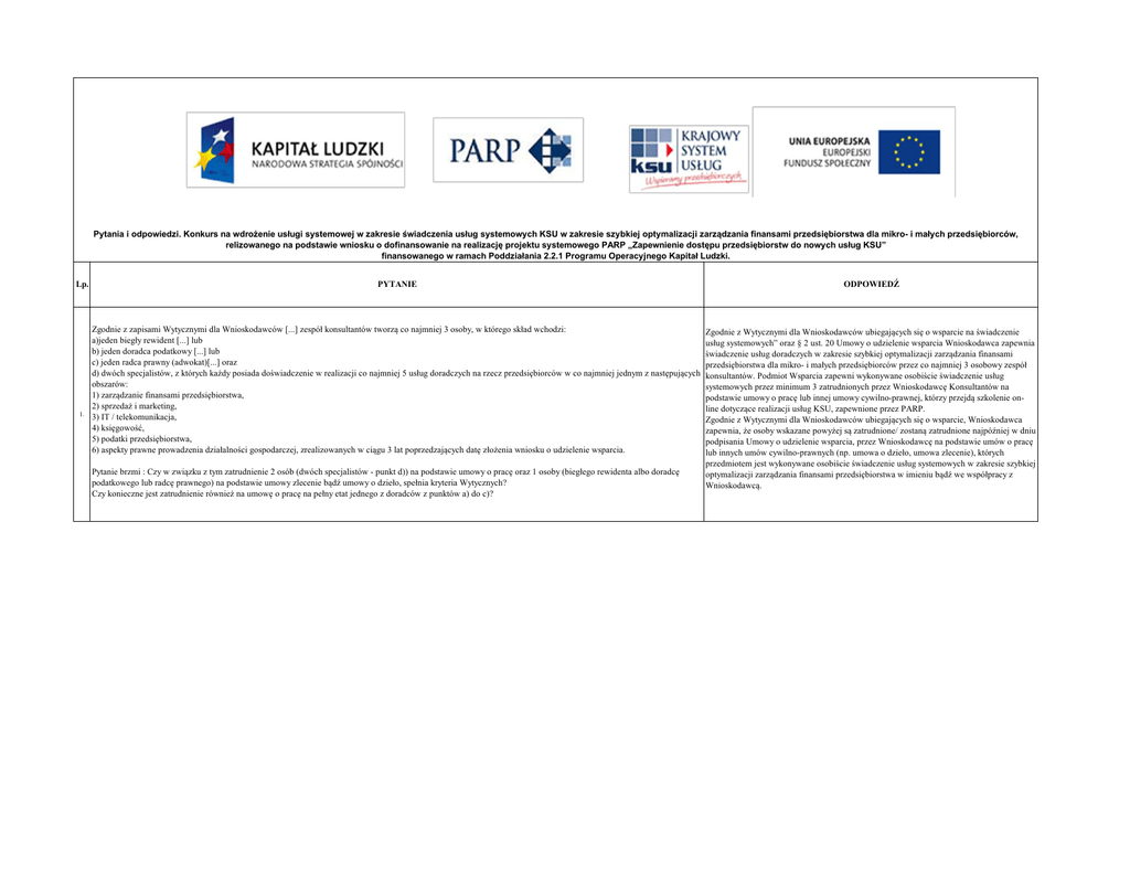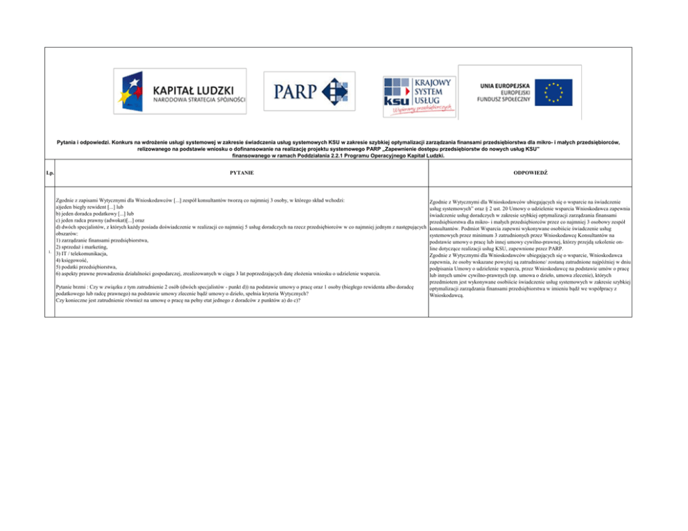 Pytania i odpowiedzi. Konkurs na wdrożenie usługi systemowej w zakresie świadczenia usług systemowych KSU w zakresie szybkiej optymalizacji zarządzania finansami przedsiębiorstwa dla mikro- i małych przedsiębiorców, relizowanego na podstawie wniosku o dofinansowanie na realizację projektu systemowego PARP „Zapewnienie dostępu przedsiębiorstw do nowych usług KSU” finansowanego w ramach Poddziałania 2.2.1 Programu Operacyjnego Kapitał Ludzki. Lp. 1. PYTANIE ODPOWIEDŹ Zgodnie z zapisami Wytycznymi dla Wnioskodawców [...] zespół konsultantów tworzą co najmniej 3 osoby, w którego skład wchodzi: a)jeden biegły rewident [...] lub b) jeden doradca podatkowy [...] lub c) jeden radca prawny (adwokat)[...] oraz d) dwóch specjalistów, z których każdy posiada doświadczenie w realizacji co najmniej 5 usług doradczych na rzecz przedsiębiorców w co najmniej jednym z następujących obszarów: 1) zarządzanie finansami przedsiębiorstwa, 2) sprzedaż i marketing, 3) IT / telekomunikacja, 4) księgowość, 5) podatki przedsiębiorstwa, 6) aspekty prawne prowadzenia działalności gospodarczej, zrealizowanych w ciągu 3 lat poprzedzających datę złożenia wniosku o udzielenie wsparcia. Zgodnie z Wytycznymi dla Wnioskodawców ubiegających się o wsparcie na świadczenie usług systemowych” oraz § 2 ust. 20 Umowy o udzielenie wsparcia Wnioskodawca zapewnia świadczenie usług doradczych w zakresie szybkiej optymalizacji zarządzania finansami przedsiębiorstwa dla mikro- i małych przedsiębiorców przez co najmniej 3 osobowy zespół konsultantów. Podmiot Wsparcia zapewni wykonywane osobiście świadczenie usług systemowych przez minimum 3 zatrudnionych przez Wnioskodawcę Konsultantów na podstawie umowy o pracę lub innej umowy cywilno-prawnej, którzy przejdą szkolenie online dotyczące realizacji usług KSU, zapewnione przez PARP. Zgodnie z Wytycznymi dla Wnioskodawców ubiegających się o wsparcie, Wnioskodawca zapewnia, że osoby wskazane powyżej są zatrudnione/ zostaną zatrudnione najpóźniej w dniu podpisania Umowy o udzielenie wsparcia, przez Wnioskodawcę na podstawie umów o pracę lub innych umów cywilno-prawnych (np. umowa o dzieło, umowa zlecenie), których przedmiotem jest wykonywane osobiście świadczenie usług systemowych w zakresie szybkiej optymalizacji zarządzania finansami przedsiębiorstwa w imieniu bądź we współpracy z Wnioskodawcą. Pytanie brzmi : Czy w związku z tym zatrudnienie 2 osób (dwóch specjalistów - punkt d)) na podstawie umowy o pracę oraz 1 osoby (biegłego rewidenta albo doradcę podatkowego lub radcę prawnego) na podstawie umowy zlecenie bądź umowy o dzieło, spełnia kryteria Wytycznych? Czy konieczne jest zatrudnienie również na umowę o pracę na pełny etat jednego z doradców z punktów a) do c)? 2. Zgodnie z regulaminem konkursu: 8)Wnioskodawca dysponuje zespołem Konsultantów, który składa się z minimum 3 osób, a w jego skład wchodzi co najmniej: a) jeden biegły rewident (który posiada doświadczenie w realizacji co najmniej 5 usług w zakresie audytu lub doradztwa finansowego lub rachunkowego, zrealizowanych w ciągu 3 lat poprzedzających datę złożenia wniosku o udzielenie wsparcia) lub b) jeden doradca podatkowy (który posiada doświadczenie w realizacji, co najmniej 5 usług w zakresie doradztwa podatkowego na rzecz przedsiębiorców, zrealizowanych w ciągu 3 lat poprzedzających datę złożenia wniosku o udzielenie wsparcia) lub c) jeden radca prawny (adwokat) lub prawnik posiadający, co najmniej 3-letnią praktykę w świadczeniu usług optymalizacji zarządzania finansami przedsiębiorstwa (który posiada doświadczenie w realizacji co najmniej dwóch usług w zakresie doradztwa prawnego na rzecz przedsiębiorców, zrealizowanych w ciągu 3 lat poprzedzających datę złożenia wniosku o udzielenie wsparcia) oraz d) dwóch specjalistów, z których każdy posiada doświadczenie w realizacji co najmniej pięciu usług doradczych na rzecz przedsiębiorców w co najmniej jednym z obszarów: zarządzania finansami przedsiębiorstwa, sprzedaży i marketingu, IT / telekomunikacji, księgowości, podatków przedsiębiorstwa, aspektów prawnych prowadzenia działalności gospodarczej, zrealizowanych w ciągu 3 lat poprzedzających datę złożenia wniosku o udzielenie wsparcia; 9) Wnioskodawca zapewnia, że usługi systemowe w zakresie szybkiej optymalizacji zarządzania finansami przedsiębiorstwa będą w ramach Projektu świadczone przez Konsultantów, o których mowa w punkcie 8, przy czym a) dopuszcza się, że usługi będą świadczone przez nowozatrudnionych, dodatkowych Konsultantów o równoważnym wykształceniu i doświadczeniu pod warunkiem ich zaakceptowania przez PARP; b) dopuszcza się, że jedna osoba może pełnić rolę więcej niż jednego Konsultanta z zastrzeżeniem, że każda pojedyncza usługa musi być realizowana przez minimum jednego Konsultanta (jedna osoba). Zgodnie z Regulaminem konkursu: „Wnioskodawca dysponuje zespołem Konsultantów, który składa się z minimum 3 osób ”, zatem możliwe jest aby Wnioskodawca zwiększył liczbę konsultantów ponad wymaganych trzech pod warunkiem jednak, że zgodnie ze Standardem świadczenia usługi „w skład Zespołu Konsultantów wchodzi co najmniej: jeden biegły rewident lub jeden doradca podatkowy lub jeden radca prawny oraz 2 specjalistów”. Czy liczba konsultantów w pozycji od a) do d) może zostać zwiększona np.: na dwóch doradców podatkowych, czterech specjalistów? Czy w trakcie realizacji projektu będzie można zwiększyć skład podstawowy konsultantów w pkt. 8 a-d, np.: W złożonym wniosku podanych jest 3 konsultantów( doradca podatkowy , prawnik, specjalista), a w trakcie realizacji projektu zwiększamy ich liczbę do 5 konsultantów o np.: dwóch – biegłego rewidenta, adwokata ? 3. 4. 5. Czy konsultanci podani w pkt.8 a-d mogą być w trakcie realizacji projektu wymieniani na no