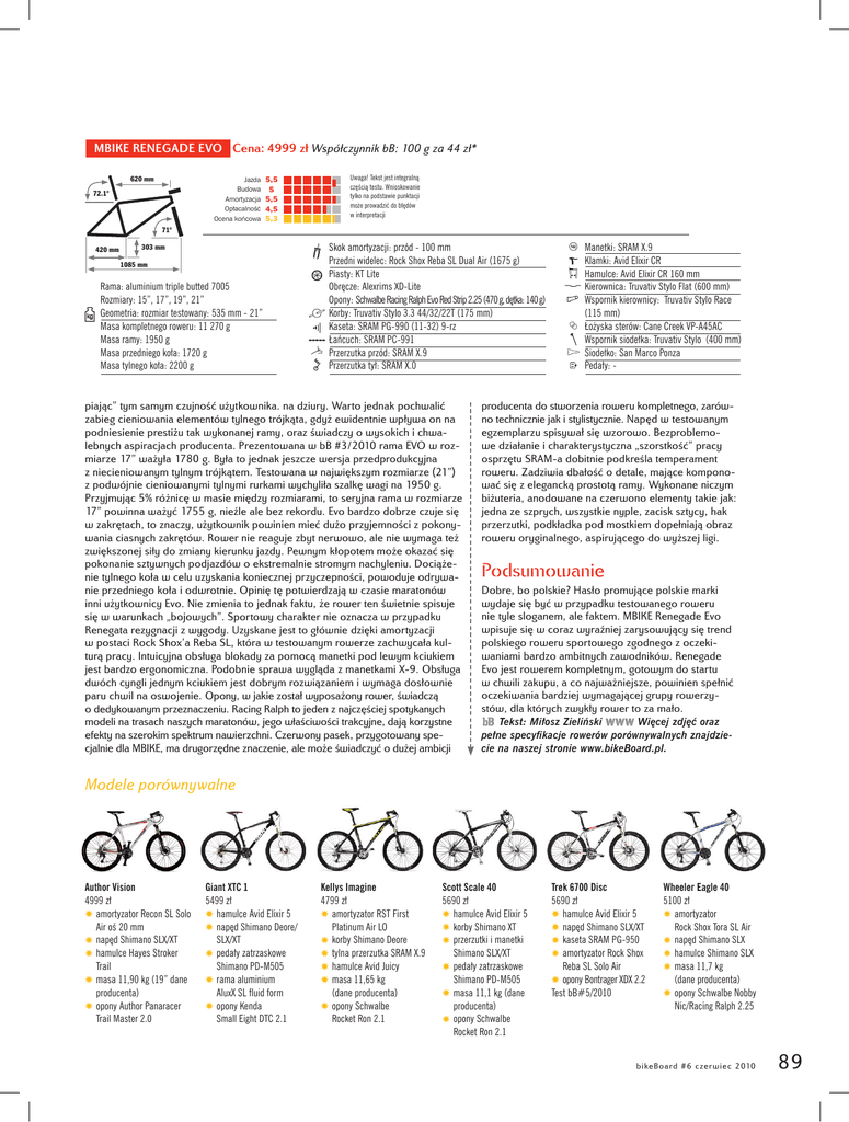 MBIKE RENEGADE EVO Cena: 4999 zł Współczynnik bB: 100 g za 44 zł* 620 mm Jazda Budowa Amortyzacja Opłacalność Ocena końcowa 72.1° 5,5 5 5,5 4,5 5,3 Uwaga! Tekst jest integralną częścią testu. Wnioskowanie tylko na podstawie punktacji może prowadzić do błędów w interpretacji 71° 420 mm 303 mm 1085 mm Rama: aluminium triple butted 7005 Rozmiary: 15”, 17”, 19”, 21” Geometria: rozmiar testowany: 535 mm - 21” Masa kompletnego roweru: 11 270 g Masa ramy: 1950 g Masa przedniego koła: 1720 g Masa tylnego koła: 2200 g Skok amortyzacji: przód - 100 mm Przedni widelec: Rock Shox Reba SL Dual Air (1675 g) Piasty: KT Lite Obręcze: Alexrims XD-Lite Opony: Schwalbe Racing Ralph Evo Red Strip 2.25 (470 g, dętka: 140 g) Korby: Truvativ Stylo 3.3 44/32/22T (175 mm) Kaseta: SRAM PG-990 (11-32) 9-rz Łańcuch: SRAM PC-991 Przerzutka przód: SRAM X.9 Przerzutka tył: SRAM X.0 piając” tym samym czujność użytkownika. na dziury. Warto jednak pochwalić zabieg cieniowania elementów tylnego trójkąta, gdyż ewidentnie wpływa on na podniesienie prestiżu tak wykonanej ramy, oraz świadczy o wysokich i chwalebnych aspiracjach producenta. Prezentowana w bB #3/2010 rama EVO w rozmiarze 17” ważyła 1780 g. Była to jednak jeszcze wersja przedprodukcyjna z niecieniowanym tylnym trójkątem. Testowana w największym rozmiarze (21”) z podwójnie cieniowanymi tylnymi rurkami wychyliła szalkę wagi na 1950 g. Przyjmując 5% różnicę w masie między rozmiarami, to seryjna rama w rozmiarze 17” powinna ważyć 1755 g, nieźle ale bez rekordu. Evo bardzo dobrze czuje się w zakrętach, to znaczy, użytkownik powinien mieć dużo przyjemności z pokonywania ciasnych zakrętów. Rower nie reaguje zbyt nerwowo, ale nie wymaga też zwiększonej siły do zmiany kierunku jazdy. Pewnym kłopotem może okazać się pokonanie sztywnych podjazdów o ekstremalnie stromym nachyleniu. Dociążenie tylnego koła w celu uzyskania koniecznej przyczepności, powoduje odrywanie przedniego koła i odwrotnie. Opinię tę potwierdzają w czasie maratonów inni użytkownicy Evo. Nie zmienia to jednak faktu, że rower ten świetnie spisuje się w warunkach „bojowych”. Sportowy charakter nie oznacza w przypadku Renegata rezygnacji z wygody. Uzyskane jest to głównie dzięki amortyzacji w postaci Rock Shox’a Reba SL, która w testowanym rowerze zachwycała kulturą pracy. Intuicyjna obsługa blokady za pomocą manetki pod lewym kciukiem jest bardzo ergonomiczna. Podobnie sprawa wygląda z manetkami X-9. Obsługa dwóch cyngli jednym kciukiem jest dobrym rozwiązaniem i wymaga dosłownie paru chwil na oswojenie. Opony, w jakie został wyposażony rower, świadczą o dedykowanym przeznaczeniu. Racing Ralph to jeden z najczęściej spotykanych modeli na trasach naszych maratonów, jego właściwości trakcyjne, dają korzystne efekty na szerokim spektrum nawierzchni. Czerwony pasek, przygotowany specjalnie dla MBIKE, ma drugorzędne znaczenie, ale może świadczyć o dużej ambicji Manetki: SRAM X.9 Klamki: Avid Elixir CR Hamulce: Avid Elixir CR 160 mm Kierownica: Truvativ Stylo Flat (600 mm) Wspornik kierownicy: Truvativ Stylo Race (115 mm) Łożyska sterów: Cane Creek VP-A45AC Wspornik siodełka: Truvativ Stylo (400 mm) Siodełko: San Marco Ponza Pedały: - producenta do stworzenia roweru kompletnego, zarówno technicznie jak i stylistycznie. Napęd w testowanym egzemplarzu spisywał się wzorowo. Bezproblemowe działanie i charakterystyczna „szorstkość” pracy osprzętu SRAM-a dobitnie podkreśla temperament roweru. Zadziwia dbałość o detale, mające komponować się z elegancką prostotą ramy. Wykonane niczym biżuteria, anodowane na czerwono elementy takie jak: jedna ze szprych, wszystkie nyple, zacisk sztycy, hak przerzutki, podkładka pod mostkiem dopełniają obraz roweru oryginalnego, aspirującego do wyższej ligi. Podsumowanie Dobre, bo polskie? Hasło promujące polskie marki wydaje się być w przypadku testowanego roweru nie tyle sloganem, ale faktem. MBIKE Renegade Evo wpisuje się w coraz wyraźniej zarysowujący się trend polskiego roweru sportowego zgodnego z oczekiwaniami bardzo ambitnych zawodników. Renegade Evo jest rowerem kompletnym, gotowym do startu w chwili zakupu, a co najważniejsze, powinien spełnić oczekiwania bardziej wymagającej grupy rowerzystów, dla których zwykły rower to za mało. Tekst: Miłosz Zieliński Więcej zdjęć oraz pełne specyfikacje rowerów porównywalnych znajdziecie na naszej stronie www.bikeBoard.pl. Modele porównywalne Author Vision 4999 zł amortyzator Recon SL Solo Air oś 20 mm napęd Shimano SLX/XT hamulce Hayes Stroker Trail masa 11,90 kg (19” dane producenta) opony Author Panaracer Trail Master 2.0 Giant XTC 1 5499 zł hamulce Avid Elixir 5 napęd Shimano Deore/ SLX/XT pedały zatrzaskowe Shimano PD-M505 rama aluminium AluxX SL fluid form opony Kenda Small Eight DTC 2.1 Kellys Imagine 4799 zł amortyzator RST First Platinum Air LO korby Shimano Deore tylna przerzutka SRAM X.9 hamulce Avid Juicy masa 11,65 kg (dane producenta) opony Schwalbe Rocket Ron 2.1 Scott Scale 40 5690 zł hamulce Avid Elixir 5 korby Shimano XT przerzutki i manetki Shimano SLX/XT pedały zatrzaskowe Shimano PD-M505 masa 11,1 kg (dane producenta) opony Schwalbe Rocket Ron 2.1 Trek 6700 Disc 5690 zł hamulce Avid Elixir 5 napęd Shimano SLX/XT kaseta SRAM PG-950 amortyzator Rock Shox Reba SL Solo Air opony Bontrager XDX 2.2 Test bB#5/2010 Wheeler Eagle 40 5100 zł amortyzator Rock Shox Tora SL Air napęd Shimano SLX hamulce Shimano SLX masa 11,7 kg (dane producenta) opony Schwalbe Nobby Nic/Racing Ralph 2.25 bi ke Boa r d # 6 c zer wi ec 2 010 89