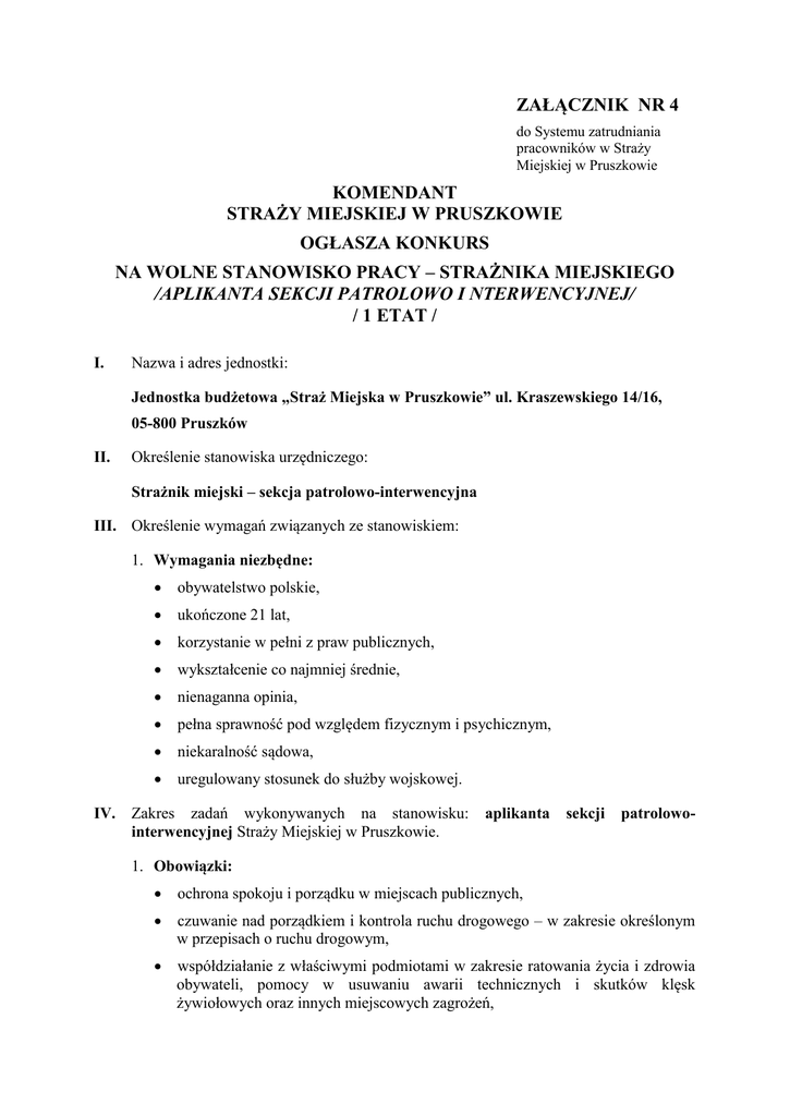ZAŁĄCZNIK NR 4 do Systemu zatrudniania pracowników w Straży Miejskiej w Pruszkowie KOMENDANT STRAŻY MIEJSKIEJ W PRUSZKOWIE OGŁASZA KONKURS NA WOLNE STANOWISKO PRACY – STRAŻNIKA MIEJSKIEGO /APLIKANTA SEKCJI PATROLOWO I NTERWENCYJNEJ/ / 1 ETAT / I. Nazwa i adres jednostki: Jednostka budżetowa „Straż Miejska w Pruszkowie” ul. Kraszewskiego 14/16, 05-800 Pruszków II. Określenie stanowiska urzędniczego: Strażnik miejski – sekcja patrolowo-interwencyjna III. Określenie wymagań związanych ze stanowiskiem: 1. Wymagania niezbędne: obywatelstwo polskie, ukończone 21 lat, korzystanie w pełni z praw publicznych, wykształcenie co najmniej średnie, nienaganna opinia, pełna sprawność pod względem fizycznym i psychicznym, niekaralność sądowa, uregulowany stosunek do służby wojskowej. IV. Zakres zadań wykonywanych na stanowisku: interwencyjnej Straży Miejskiej w Pruszkowie. aplikanta sekcji patrolowo- 1. Obowiązki: ochrona spokoju i porządku w miejscach publicznych, czuwanie nad porządkiem i kontrola ruchu drogowego – w zakresie określonym w przepisach o ruchu drogowym, współdziałanie z właściwymi podmiotami w zakresie ratowania życia i zdrowia obywateli, pomocy w usuwaniu awarii technicznych i skutków klęsk żywiołowych oraz innych miejscowych zagrożeń, zabezpieczanie miejsca przestępstwa, katastrofy lub innego podobnego zdarzenia albo miejsc zagrożonych takim zdarzeniem przed dostępem osób postronnych lub zniszczeniem śladów i dowodów, do momentu przybycia właściwych służb, a także ustalenie w miarę możliwości świadków zdarzenia, ochrona obiektów komunalnych i urządzeń użyteczności publicznej oraz realizacja zadań zleconych przez dyżurnych w ramach Systemu Monitoringu Wizyjnego Miasta, współdziałanie z organizatorami i innymi służbami w ochronie porządku podczas zgromadzeń i imprez publicznych, doprowadzanie osób nietrzeźwych do izby wytrzeźwień lub miejsca ich zamieszkania, jeżeli osoby te zachowaniem swoim dają powód do zgorszenia w miejscach publicznych, znajdują się w okolicznościach zagrażających ich życiu lub zdrowiu albo zagrażają życiu i zdrowiu innych osób, informowanie społeczności lokalnej o stanie i rodzajach zagrożeń, a także inicjowanie i uczestnictwo w działaniach mających na celu zapobieganie popełnianiu przestępstw i wykroczeń oraz zjawiskom kryminogennym i współdziałanie w tym zakresie z organami państwowymi, samorządowymi i organizacjami społecznymi, konwojowanie dokumentów, przedmiotów pieniężnych dla potrzeb miasta, wykonywanie innych określonych przez przełożonych zadań w ustawowym zakresie obowiązków w ramach zarządzeń i poleceń służbowych. wartościowych lub wartości Zadania realizowane są w czasie służby patrolowej /patrole piesze i zmotoryzowane/ w miejscu i czasie zgodnie z wytycznymi postawionymi na codziennej odprawie zadaniowej do służby. 2. Odpowiedzialność: V. strażnik miejski podlega szczególnej odpowiedzialności prawnej za naruszenia podczas pełnienia służby, określonej aktami prawnymi w zakresie kodeksu karnego, kodeksu pracy, regulaminu pracy, w zakresie zadaniowości podlega codziennej ocenie i rozliczaniu z nałożonych zadań przez przełożonych w służbie oraz ocenie w systemie oceny terminowej. Wymagane dokumenty: życiorys /CV/, list motywacyjny, dokument poświadczający wykształcenie /ksero dokumentu ukończenia szkoły lub uczelni/, kwestionariusz osobowy, zaświadczenie o niekaralności, dowód osobisty /ksero/. Preferowani będą kandydaci posiadający kwalifikacje i umiejętności z zakresu bezpieczeństwa, samoobrony i innych sportów obronnych, o wykształceniu wyższym (administracja, prawo, resocjalizacja, wychowanie fizyczne) w wieku do 35 lat, posiadający prawo jazdy kat. B, ze znajomością podstaw obsługi komputera. VI. Termin i miejsce składania wymaganych dokumentów. Wymagane dokumenty aplikacyjne należy składać osobiście w siedzibie Straży Miejskiej w Pruszkowie ul. Kraszewskiego14/16, pokój nr 2, z dopiskiem: Dotyczy naboru na stanowisko aplikant Straży Miejskiej w terminie do dnia 20 listopada 2014 roku do godziny 12:00. Aplikacje, które wpłyną do siedziby Straży, po wyżej określonym terminie nie będą rozpatrywane. Informacja o wyniku naboru będzie umieszczana na stronie internetowej Straży Miejskiej w Pruszkowie www.strazmiejska.pruszkow.pl., Biuletynie Informacji Publicznej Urzędu Miasta w Pruszkowie oraz na tablicy informacyjnej w siedzibie Straży Miejskiej w Pruszkowie, ul. Kraszewskiego14/16. Wymagane dokumenty aplikacyjne powinny być opatrzone klauzulą: wyrażam zgodę na przetwarzanie moich danych osobowych zawartych w ofercie pracy dla potrzeb niezbędnych do realizacji procesu rekrutacji zgodnie z ustawą z dnia 29 sierpnia 1997r. o ochronie danych osobowych (Dz. U. z 2002r. Nr 101, poz. 926 z późn. zm.) oraz ustawą z dnia 22 marca 1990r. o pracownikach samorządowych (Dz. U. z 2001r. Nr 142, poz. 1593 z późn. zm.). KOMENDANT STRAŻY MIEJSKIEJ W PRUSZKOWIE mgr Włodzimierz Majchrzak Pruszków, dnia 05 listopada 2014 roku