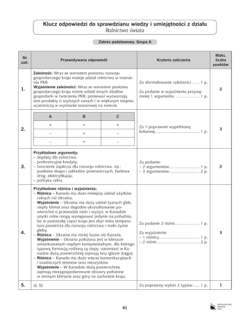 Klucz odpowiedzi do sprawdzianu wiedzy i umiejętności z działu Rolnictwo świata Zakres podstawowy. Grupa A Nr zad. 1. Przewidywana odpowiedź Kryteria zaliczenia Zależność: Wraz ze wzrostem poziomu rozwoju gospodarczego kraju maleje udział rolnictwa w tworzeniu PKB. Wyjaśnienie zależności: Wraz ze wzrostem poziomu gospodarczego kraju rośnie udział innych działów gospodarki w tworzeniu PKB, ponieważ wytwarzają one produkty o wyższych cenach i w większym stopniu uczestniczą w wymianie towarowej na świecie. A B C + + + – + – – + – 2. 3. Przykładowe argumenty: – dopłaty dla rolnictwa, – preferencyjne kredyty, – tworzenie zaplecza dla rozwoju rolnictwa, np.: punktów skupu i zakładów przetwórczych, budowa dróg, elektryfikacja, – polityka celna. 4. Przykładowe różnice i wyjaśnienia: – Różnica – Kanada ma dużo mniejszy udział użytków rolnych niż Ukraina. Wyjaśnienie – Ukraina ma duży udział żyznych gleb, ciepły klimat oraz dogodne ukształtowanie powierzchni o przewadze nizin i wyżyn; w Kanadzie użytki rolne mogą występować jedynie na południu, bo w pozostałej części kraju jest zbyt niska temperatura powietrza dla rozwoju rolnictwa i mało żyzne gleby. – Różnica – Ukraina ma mniej lasów niż Kanada. Wyjaśnienie – Ukraina położona jest w klimacie umiarkowanym ciepłym kontynentalnym, dla którego typową formacją roślinną są stepy, natomiast w Kanadzie dużą powierzchnię zajmują lasy iglaste (tajga). – Różnica – Kanada ma dużo więcej komunikacyjnych i osadniczych terenów oraz nieużytków. Wyjaśnienie – W Kanadzie dużą powierzchnię zajmują niezagospodarowane obszary położone w zimnym klimacie oraz góry na zachodzie kraju. 5. a), b) 61 Maks. liczba punktów Za sformułowanie zależności ...... 1 p. Za podanie w wyjaśnieniu przynajmniej 1 argumentu .................... 1 p. 2 Za 1 poprawnie wypełnioną kolumnę..................................... 1 p. 3 Za podanie: – 2 argumentów ......................... 1 p. – 3 argumentów ......................... 2 p. 2 Za podanie 2 różnic .................... 1 p. Za wyjaśnienie: – 1 różnicy ................................. 1 p. – 2 różnic ................................... 2 p. 3 Za poprawny wybór 2 typów...... 1 p. 1 6. Przykładowe podobieństwa: – duże nakłady kapitału, – wysoki poziom mechanizacji, – wysoki poziom kultury rolnej, – specjalizacja produkcji rolnej, – wysoki poziom towarowości. Przykładowe różnice: – wyższe plony w rolnictwie intensywnym, – większe nawożenie chemiczne w rolnictwie intensywnym, – większe powierzchnie gospodarstw rolnych w rolnictwie ekstensywnym. Za podanie: – 2 podobieństw ........................ 1 p. – 2 różnic ................................... 1 p. – 1 podobieństwa i 1 różnicy ...... 1 p. 2 7 Przykładowe konsekwencje: – zmniejszanie się powierzchni naturalnych formacji roślinnych (lasów, sawann), – jałowienie gleb, – wzmożona erozja gleb, – ginięcie zwierząt podczas pożarów i kurczenie się ich siedlisk. Za wymienienie: – 1 konsekwencji ........................ 1 p. – 2 konsekwencji ........................ 2 p. 2 8. a) 2; b) 3; c) 4; d) 1 Za 2 przyporządkowania ............ 1 p. Za 4 przyporządkowania ............ 2 p. 2 9. Przykładowe przyczyny: – Ocean Indyjski ma najmniejszą powierzchnię, – nad tym oceanem położone są kraje słabo rozwinięte gospodarczo, – większa część wód tego oceanu ma wysoką temperaturę i charakteryzuje się mniejszą zasobnością łowisk. Za podanie 1 przyczyny.............. 1 p. 2 10. b), c), e) Za wybór: – 2 zdań prawidłowych............... 1 p. – 3 zdań prawidłowych............... 2 p. 2 11. Przykładowe przyczyny: – duża efektywność rolnictwa (wysokie plony i zbiory), – niewielki przyrost naturalny, – intensywne nawożenie zwiększające plony, – modyfikacje gatunków upraw i zwierząt hodowlanych sprzyjające zwiększaniu produktywności rolnictwa, – duże nakłady kapitału pozwalają na zwalczanie szkodników i przeciwdziałanie skutkom anomalii pogodowych. Za podanie: – 2 przyczyn .............................. 1 p. – 3 przyczyn .............................. 2 p. 2 12. Wyjaśnienie: Głód jawny polega na niedoborze kalorii i białka w spożywanym przez człowieka pożywieniu. Jest to głód ilościowy. Natomiast głód utajony to przyswajanie kalorii w pożywieniu w ilości wystarczającej, ale występuje niedobór białka, soli mineralnych i witamin. Jest to głód jakościowy. Obszary głodu utajonego: Azja Południowo-Wschodnia, Ameryka Południowa. 13. Przykładowe przyczyny: – przeludnienie, – niewielkie nakłady kapitału na rozwój rolnictwa, – wojny i konflikty plemienne, – brak stabilnych rządów, które mogłyby prowadzić długofalową politykę rolną, – duży udział nieużytków, – niski poziom wykształcenia rolników. 62 Za wyjaśnienie różnicy................ 1 p. Za wymienienie 2 obszarów (mogą to być również przykłady krajów).... 1 p. Za podanie: – 2 przyczyn .............................. 1 p. – 4 przyczyn .............................. 2 p. 2 2 Klucz odpowiedzi do sprawdzianu wiedzy i umiejętności z działu Rolnictwo świata Zakres podstawowy. Grupa B Nr zad. 1. Przewidywana odpowiedź Kryteria zaliczenia Zależność: Wraz ze wzrostem poziomu rozwoju gospodarczego kraju maleje poziom zatrudnienia w rolnictwie. Wyjaśnienie zależności: Wraz ze wzrostem poziomu gospodarczego kraju rośnie efektywność rolnictwa z powodu chemizacji i wysokiego poziomu kultury rolnej oraz wyższego poziomu mechanizacji. A B C + + + – + – – + – 2. 3. Przykładowe argumenty: – większe inwestycje na modyfikacje warunków przyrodniczych dla potrzeb rolnictwa, – rozwój badań nad udoskonaleniem technik, modyfikacją gatunków upraw i zwierząt hodowlanych, – wytwarzanie środków produkcji dla roln