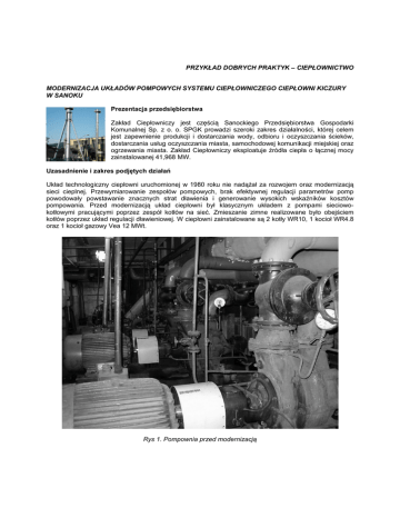 PRZYKŁAD DOBRYCH PRAKTYK – CIEPŁOWNICTWO MODERNIZACJA UKŁADÓW POMPOWYCH SYSTEMU CIEPŁOWNICZEGO CIEPŁOWNI KICZURY W SANOKU Prezentacja przedsiębiorstwa Zakład Ciepłowniczy jest częścią Sanockiego Przedsiębiorstwa Gospodarki Komunalnej Sp. z o. o. SPGK prowadzi szeroki zakres działalności, której celem jest zapewnienie produkcji i dostarczania wody, odbioru i oczyszczania ścieków, dostarczania usług oczyszczania miasta, samochodowej komunikacji miejskiej oraz ogrzewania miasta. Zakład Ciepłowniczy eksploatuje źródła ciepła o łącznej mocy zainstalowanej 41,968 MW. Uzasadnienie i zakres podjętych działań Układ technologiczny ciepłowni uruchomionej w 1980 roku nie nadążał za rozwojem oraz modernizacją sieci cieplnej. Przewymiarowanie zespołów pompowych, brak efektywnej regulacji parametrów pomp powodowały powstawanie znacznych strat dławienia i generowanie wysokich wskaźników kosztów pompowania. Przed modernizacją układ ciepłowni był klasycznym układem z pompami sieciowokotłowymi pracującymi poprzez zespół kotłów na sieć. Zmieszanie zimne realizowane było obejściem kotłów poprzez układ regulacji dławieniowej. W ciepłowni zainstalowane są 2 kotły WR10, 1 kocioł WR4.8 oraz 1 kocioł gazowy Vea 12 MWt. Rys 1. Pompownia przed modernizacją Rys. 2. Technologia pompowania przed modernizacją ciepłowni Na rysunku 2 pokazana została technologia pompowania przed modernizacją. Dwie pompy W18P, niedopasowane do układu, musiały pracować przy znacznym dławieniu. W skrajnym przypadku przy minimalnych przepływach dławione było prawie 50% mocy hydraulicznej generowanej przez pompy. Na zdjęciu pokazana została pompownia przed modernizacją. Rys 3. Praca pomp sieciowych 15A40, na podstawie pomiarów powykonawczych Rys 4. Praca pompy przewałowej kotła WR10 Rys 5. Pompownia sieciowa po modernizacji Modernizacja układu hydraulicznego ciepłowni polegała na zabudowaniu na każdym kotle rusztowym pompy przewałowej oraz na wymianie pomp głównych na pompy o niższych parametrach, wyposażonych w nowe silniki o wyższych sprawnościach oraz napędy regulowane. Ze względu na pracę kotłów w szerokim zakresie zmian przepływów, również pompy przewałowe zostały wyposażone w przemienniki częstotliwości. Układ zabezpieczeń kotłów został dozbrojony w automatykę tzw. pływającej blokady minimalnego ciśnienia. Współpraca nowych pomp po modernizacji pokazana została na rysunkach 3 i 4, natomiast wygląd pompowni zaprezentowano na rys 5. W wyniku modernizacji uzyskano ok. 40% zmniejszenia energetycznego wskaźnika kosztu transportu (rys. 6). Rys 6. Energetyczny wskaźnik kosztu transportu wody sieciowej Wskaźnik ten definiowany jest jako stosunek mocy pobieranej przez pompy biorące udział w pracy źródła w danej chwili do przepływu sieciowego. K = Pe / Qs gdzie: Pe – (kW), Qs – (m3/h), K – (kWh/m3) Uwaga: posługiwanie się wskaźnikiem kosztu transportu ma sens tylko przy porównywaniu i ocenie tego samego systemu. Nie należy wyciągać wniosków co do jakości pompowania na podstawie wskaźnika K z innych obiektów, gdyż inna charakterystyka sieci lub inne urządzenia wytwórcze w źródle ciepła powodują, że wartości wskaźnika K dla innego systemu będą całkowicie inne. Źródło: Wojciech Misiewicz, Andrzej Misiewicz „Napędy regulowane w układach pompowych źródeł ciepła” – publikacja wydana w ramach Programu PEMP
