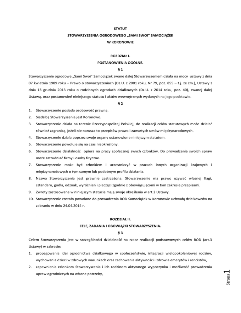 STATUT STOWARZYSZENIA OGRODOWEGO „SAMI SWOI” SAMOCIĄŻEK W KORONOWIE ROZDZIAŁ I. POSTANOWIENIA OGÓLNE. §1 Stowarzyszenie ogrodowe „Sami Swoi” Samociążek zwane dalej Stowarzyszeniem działa na mocy ustawy z dnia 07 kwietnia 1989 roku – Prawo o stowarzyszeniach (Dz.U. z 2001 roku, Nr 79, poz. 855 – t.j. ze zm.), Ustawy z dnia 13 grudnia 2013 roku o rodzinnych ogrodach działkowych (Dz.U. z 2014 roku, poz. 40), zwanej dalej Ustawą, oraz postanowień niniejszego statutu i aktów wewnętrznych wydanych na jego podstawie. §2 1. Stowarzyszenie posiada osobowość prawną. 2. Siedzibą Stowarzyszenia jest Koronowo. 3. Stowarzyszenie działa na terenie Rzeczypospolitej Polskiej, do realizacji celów statutowych może działać również zagranicą, jeżeli nie narusza to przepisów prawa i zawartych umów międzynarodowych. 4. Stowarzyszenie działa poprzez swoje organy ustanowione niniejszym statutem. 5. Stowarzyszenie powołuje się na czas nieokreślony. 6. Stowarzyszenie działalność opiera na pracy społecznej swych członków. Do prowadzenia swoich spraw może zatrudniać firmy i osoby fizyczne. 7. Stowarzyszenie może być członkiem i uczestniczyć w pracach innych organizacji krajowych i międzynarodowych o tym samym lub podobnym profilu działania. 8. Nazwa Stowarzyszenia jest prawnie zastrzeżona. Stowarzyszenie ma prawo używać własnej flagi, sztandaru, godła, odznak, wyróżnień i pieczęci zgodnie z obowiązującymi w tym zakresie przepisami. 9. Zwroty zastosowane w niniejszym statucie mają swoje określenia w art.2 Ustawy. 10. Stowarzyszenie zostało powołane do prowadzenia ROD Samociążek w Koronowie uchwałą działkowców na zebraniu w dniu 24.04.2014 r. ROZDZIAŁ II. CELE, ZADANIA I OBOWIĄZKI STOWARZYSZENIA. §3 Celem Stowarzyszenia jest w szczególności działalność na rzecz realizacji podstawowych celów ROD (art.3 Ustawy) w zakresie: 1. propagowania idei ogrodnictwa działkowego w społeczeństwie, integracji wielopokoleniowej rodziny, wychowania dzieci w zdrowych warunkach oraz zachowania aktywności i zdrowia emerytów i rencistów, upraw ogrodniczych na własne potrzeby, 1 zapewnienia członkom Stowarzyszenia i ich rodzinom aktywnego wypoczynku i możliwość prowadzenia Strona 2. 3. przywracania społeczności i przyrodzie terenów zdegradowanych, racjonalnego wykorzystania gruntów i oddziaływania na poprawę warunków ekologicznych w gminie, 4. ochrony środowiska i przyrody, kształtowania zdrowego otoczenia człowieka, 5. promocji zdrowego trybu życia, 6. poprawy warunków bytowych społeczności lokalnej. §4 Stowarzyszenie realizuje swoje cele poprzez: 1. zagospodarowywanie i prowadzenie ogrodu działkowego, 2. organizowanie niezbędnej pomocy oraz poradnictwa w zagospodarowaniu działek i prowadzeniu upraw ogrodniczych, 3. propagowanie wiedzy ogrodniczej i ekologicznej, organizowanie imprez integracyjnych, pomocniczych i kulturalnych, 4. prowadzenie działalności społecznej, wychowawczej, wypoczynkowej, rekreacyjnej, kulturalnej i innej na rzecz swoich członków, ich rodzin oraz społeczności lokalnych, 5. współpracę z organami administracji publicznej, organizacjami społecznymi i zawodowymi oraz przedsiębiorcami i innymi instytucjami w zakresie realizacji swoich celów, 6. zabieranie głosu i wyrażanie swojego stanowiska na forum publicznym w sprawach związanych z realizacją celów statutowych Stowarzyszenia, 7. oddawanie działki w bezpłatne użytkowanie (art. 27 ust. 4) uchwałą Walnego Zebrania, na wniosek Zarządu. §5 Stowarzyszenie w szczególności zobowiązane jest do: 1. zawiadamiania działkowców ROD o zmianie wysokości opłat ogrodowych co najmniej 14 dni przed upływem terminu wznoszenia opłat (art. 34 ust.1 Ustawy): - listownie po każdym Walnym Zebraniu Członków lub elektronicznie za zgodą adresata - za pomocą komunikatów wywieszonych w gablotach na terenie ROD 2. ustanawiania praw do działek (art. 41 Ustawy), 3. prowadzenie ewidencji działek (art. 51 Ustawy) w formie elektronicznej lub kartoteki zawierającej: numer porządkowy działki, powierzchnię działki, imię i nazwisko oraz miejsce zamieszkania osoby lub osób, którym przysługuje tytuł prawny do działki i rodzaj tego tytułu prawnego, 4. przedstawiania działkowcom raz w roku, nie później niż do 1 lipca, informacji finansowej dotyczącej prowadzenia ROD za poprzedni rok i udostępnienia w sposób umożliwiający każdemu działkowcowi zapoznania się z nią (art.33 ust.3 i 4 Ustawy). ROZDZIAŁ III. 1. Działkowiec jest zobowiązany do: Strona §6 2 DZIAŁKOWCY – PRAWA I OBOWIĄZKI 1) uczestniczenia w pokrywaniu kosztów funkcjonowania ROD w częściach przypadających na jego działkę, poprzez regularne i terminowe uiszczanie opłat ogrodowych uchwalanych przez władze Stowarzyszenia ; od każdej działki koszty pokrywa tylko jeden działkowiec. 2) przestrzegania przepisów prawnych, postanowień statutu, regulaminów i uchwał władz Stowarzyszenia, 3) dbania o majątek Stowarzyszenia, 4) aktualizowania swoich danych osobowych i kontaktowych, a w szczególności adresu do korespondencji. 2. Na koszty funkcjonowania ROD składają się w szczególności: 1) wydatki na inwestycje, remonty i bieżącą konserwację infrastruktury ogrodowej, 2) opłaty za dostawę energii elektrycznej w części dotyczącej terenu ogólnego i infrastruktury ogrodowej, 3) opłaty za odprowadzanie ścieków i dostawę wody, 4) ubezpieczenia, podatki i inne opłaty publicznoprawne, 5) wydatki na utrzymanie porządku i czystości, 6) wydatki związane z zarządzaniem ROD, 7) inne opłaty uchwalone przez Walne Zebranie Członków. 3. Działkowcowi przysługuje prawo do działki na podstawie umowy dzierżawy. 4. Prawo działkowca do działki wygasa, po wypowiedzeniu mu przez Stowarzyszenie umowy dzierżawy na podstawie przepisów (art. 36 Ustawy). 5. Działkowcowi, po wypowiedzeniu umowy dzierżawy, przysługują prawa określone w art.37 Ustawy. 