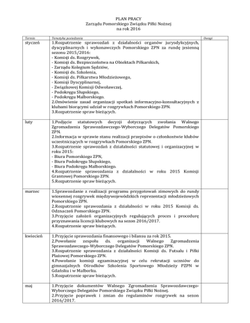 PLAN PRACY Zarządu Pomorskiego Związku Piłki Nożnej na rok 2016 Termin Tematyka posiedzenia styczeń 1.Rozpatrzenie sprawozdań z działalności organów jurysdykcyjnych, dyscyplinarnych i wykonawczych Pomorskiego ZPN za rundę jesienną sezonu 2015/2016: - Komisji ds. Rozgrywek, - Komisji ds. Bezpieczeństwa na Obiektach Piłkarskich, - Zarządu Kolegium Sędziów, - Komisji ds. Szkolenia, - Komisji ds. Piłkarstwa Młodzieżowego, - Komisji Dyscyplinarnej, - Związkowej Komisji Odwoławczej, - Podokręgu Słupskiego, - Podokręgu Malborskiego. 2.Omówienie zasad organizacji spotkań informacyjno-konsultacyjnych z klubami biorącymi udział w rozgrywkach Pomorskiego ZPN. 3.Rozpatrzenie spraw bieżących. luty 1.Podjęcie statutowych decyzji dotyczących zwołania Walnego Zgromadzenia Sprawozdawczego-Wyborczego Delegatów Pomorskiego ZPN. 2.Informacja w sprawie stanu realizacji przepisów o członkostwie klubów uczestniczących w rozgrywkach Pomorskiego ZPN. 3.Rozpatrzenie sprawozdań z działalności statutowej i organizacyjnej w roku 2015: - Biura Pomorskiego ZPN, - Biura Podokręgu Słupskiego, - Biura Podokręgu Malborskiego. 4.Rozpatrzenie sprawozdania z działalności w roku 2015 Komisji Grantowej Pomorskiego ZPN. 5.Rozpatrzenie spraw bieżących. marzec 1.Sprawozdanie z realizacji programu przygotowań zimowych do rundy wiosennej rozgrywek międzywojewódzkich reprezentacji młodzieżowych Pomorskiego ZPN. 2.Rozpatrzenie sprawozdania z działalności w roku 2015 Komisji ds. Odznaczeń Pomorskiego ZPN. 3.Przyjęcie założeń organizacyjnych regulujących proces i procedurę przyznawania licencji klubowych na sezon 2016/2017. 4.Rozpatrzenie spraw bieżących. kwiecień 1.Przyjęcie sprawozdania finansowego i bilansu za rok 2015. 2.Powołanie zespołu ds. organizacji Walnego Zgromadzenia Sprawozdawczego-Wyborczego Delegatów Pomorskiego ZPN. 3.Rozpatrzenie sprawozdania z działalności Komisji ds. Futsalu i Piłki Plażowej Pomorskiego ZPN. 4.Powołanie komisji egzaminacyjnej w celu rekrutacji uczniów do gimnazjalnych Ośrodków Szkolenia Sportowego Młodzieży PZPN w Gdańsku i w Malborku. 5.Rozpatrzenie spraw bieżących. maj 1.Przyjęcie dokumentów Walnego Zgromadzenia SprawozdawczegoWyborczego Delegatów Pomorskiego Związku Piłki Nożnej. 2.Przyjęcie poprawek i zmian do regulaminów rozgrywek na sezon 2016/2017. Uwagi 3.Przyjęcie uchwał w sprawach finansowych dotyczących organizacji rozgrywek sezonu 2016/2017. 4.Przyjęcie kalendarza rozgrywek rundy jesiennej sezonu 2016/2017. 5.Zatwierdzenie dokumentu regulującego zasady selekcji i nadawania uprawnień dla obserwatorów na sezon 2016/2017. 6.Zatwierdzenie przepisów regulujących zasady awansów i spadków sędziów Pomorskiego ZPN w sezonie 2016/2017. 7.Zatwierdzenie kandydatów na obserwatorów szczebla centralnego w sezonie 2016/2017. 8.Rozpatrzenie spraw bieżących. czerwiec 1.Udzielenie pełnomocnictw do organizacji i prowadzenia rozgrywek w sezonie 2016/2017. 2.Nadanie uprawnień dla sędziów i obserwatorów sędziów na sezon 2016/2017. 3.Nadanie uprawnień dla delegatów meczowych na sezon 2016/2017. 4.Rozpatrzenie spraw bieżących. lipiec 1.Rozpatrzenie sprawozdań z działalności organów jurysdykcyjnych, dyscyplinarnych i wykonawczych za sezonu 2015/2016: - Komisji ds. Rozgrywek, - Komisji ds. Bezpieczeństwa na Obiektach Piłkarskich, - Zarządu Kolegium Sędziów, - Komisji Dyscyplinarnej, - Związkowej Komisji Odwoławczej, - Podokręgu Słupskiego, - Podokręgu Malborskiego. 2.Ocena wyników sportowych poszczególnych reprezentacji Pomorskiego ZPN za sezon 2016/2017. 3.Zatwierdzenie sztabów szkoleniowych dla poszczególnych reprezentacji młodzieżowych Pomorskiego ZPN na sezon 2016/2017. 4.Zatwierdzenie kadry szkoleniowej OSSM Gdańsk i Malbork na rok szkolny 2016/2017. 5.Rozpatrzenie spraw bieżących. sierpień 1.Przyjęcie informacji w sprawie stanu realizacji budżetu Pomorskiego ZPN za I półrocze 2016 roku. 2.Rozpatrzenie sprawozdań z działalności szkoleniowej Ośrodka Szkolenia Sportowego Młodzieży PZPN w Gdańsku i Malborku za rok szkolny 2015/2016. 3.Rozpatrzenie sprawozdań z procesu nadawania licencji klubowych na sezon 2016/2017: - Komisji ds. Licencji Klubowych, - Komisji Odwoławcza ds. Licencji Klubowych. 4.Przyjęcie informacji z przebiegu procesu licencyjnego trenerów i sędziów: - Komisja Licencji Trenerskich, - Komisja Licencji Sędziowskich. 5.Rozpatrzenie spraw bieżących. sierpień Walne Zgromadzenie Sprawozdawczo-Wyborcze Delegatów Pomorskiego Związku Piłki Nożnej. Uwaga. 1. Posiedzenia Zarządu Pomorskiego ZPN co do zasady odbywać się będą w każdy ostatni poniedziałek miesiąca, a rozpoczynać się będą o godz. 13:00. 2.Posiedzenia Zarządu Pomorskiego ZPN co do zasady odbywać się będą w siedzibie Związku: Gdańsk al. Zwycięstwa 51. 3.Problematyka posiedzeń związana ze sprawozdaniami czy informacjami dotycząca określonej działalności musi być poprzedzona stosownym materiałem na piśmie. 4.Dla merytoryczności wszelkich sprawozdań ewentualne pytania czy uwagi do przedłożonych sprawozdań należy kierować w formie pisemnej do organu przygotowującego sprawozdanie w takim wyprzedzeniem by można było wyjaśnienia przedstawić na posiedzeniu Zarządu. 5.Wszelkie wnioski finansowe muszą zawierać wskazanie z jakiej pozycji planu finansowego mają być realizowane. 6.Tematyka poszczególnych posiedzeń Zarządu Pomorskiego ZPN uzupełniana będzie o sprawy wynikające z bieżącej działalności Związku. 7.Zastrzega się możliwość przeniesienia rozpatrzenie konkretnego tematu posiedzenia na inny termin. Józef Dąbrowski Sekretarz Zarządu Pomorskiego ZPN