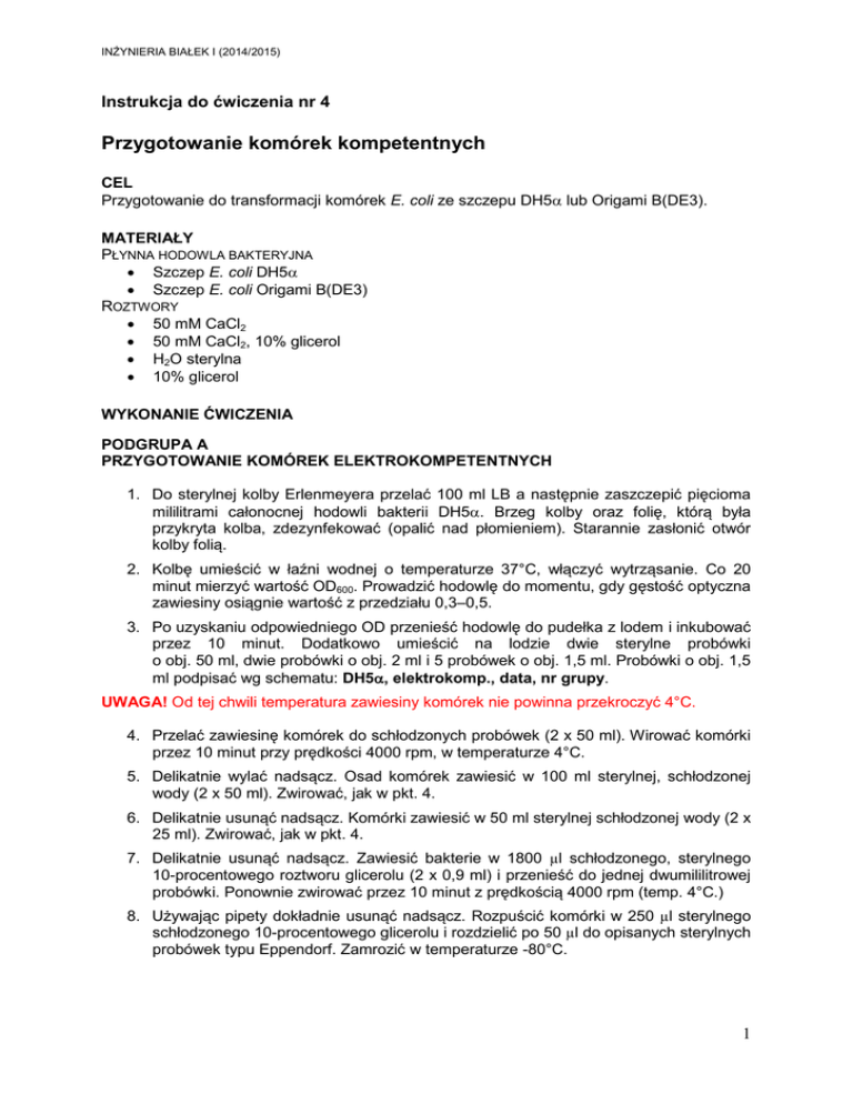 INŻYNIERIA BIAŁEK I (2014/2015) Instrukcja do ćwiczenia nr 4 Przygotowanie komórek kompetentnych CEL Przygotowanie do transformacji komórek E. coli ze szczepu DH5α lub Origami B(DE3). MATERIAŁY PŁYNNA HODOWLA BAKTERYJNA • Szczep E. coli DH5α • Szczep E. coli Origami B(DE3) ROZTWORY • 50 mM CaCl2 • 50 mM CaCl2, 10% glicerol • H2O sterylna • 10% glicerol WYKONANIE ĆWICZENIA PODGRUPA A PRZYGOTOWANIE KOMÓREK ELEKTROKOMPETENTNYCH 1. Do sterylnej kolby Erlenmeyera przelać 100 ml LB a następnie zaszczepić pięcioma mililitrami całonocnej hodowli bakterii DH5α. Brzeg kolby oraz folię, którą była przykryta kolba, zdezynfekować (opalić nad płomieniem). Starannie zasłonić otwór kolby folią. 2. Kolbę umieścić w łaźni wodnej o temperaturze 37°C, włączyć wytrząsanie. Co 20 minut mierzyć wartość OD600. Prowadzić hodowlę do momentu, gdy gęstość optyczna zawiesiny osiągnie wartość z przedziału 0,3–0,5. 3. Po uzyskaniu odpowiedniego OD przenieść hodowlę do pudełka z lodem i inkubować przez 10 minut. Dodatkowo umieścić na lodzie dwie sterylne probówki o obj. 50 ml, dwie probówki o obj. 2 ml i 5 probówek o obj. 1,5 ml. Probówki o obj. 1,5 ml podpisać wg schematu: DH5α, elektrokomp., data, nr grupy. UWAGA! Od tej chwili temperatura zawiesiny komórek nie powinna przekroczyć 4°C. 4. Przelać zawiesinę komórek do schłodzonych probówek (2 x 50 ml). Wirować komórki przez 10 minut przy prędkości 4000 rpm, w temperaturze 4°C. 5. Delikatnie wylać nadsącz. Osad komórek zawiesić w 100 ml sterylnej, schłodzonej wody (2 x 50 ml). Zwirować, jak w pkt. 4. 6. Delikatnie usunąć nadsącz. Komórki zawiesić w 50 ml sterylnej schłodzonej wody (2 x 25 ml). Zwirować, jak w pkt. 4. 7. Delikatnie usunąć nadsącz. Zawiesić bakterie w 1800 µl schłodzonego, sterylnego 10-procentowego roztworu glicerolu (2 x 0,9 ml) i przenieść do jednej dwumililitrowej probówki. Ponownie zwirować przez 10 minut z prędkością 4000 rpm (temp. 4°C.) 8. Używając pipety dokładnie usunąć nadsącz. Rozpuścić komórki w 250 µl sterylnego schłodzonego 10-procentowego glicerolu i rozdzielić po 50 µl do opisanych sterylnych probówek typu Eppendorf. Zamrozić w temperaturze -80°C. 1 INŻYNIERIA BIAŁEK I (2014/2015) PODGRUPA B PRZYGOTOWANIE KOMÓREK KOMPETENTNYCH METODĄ CHEMICZNĄ 1. Do sterylnej kolby Erlenmeyera przelać 50 ml LB (w przypadku komórek Origami B(DE3) LB powinno dodatkowo zawierać antybiotyki kanamycynę oraz tetracyklinę) a następnie dodać 2,5 ml całonocnej hodowli bakterii DH5α lub Origami B(DE3). Brzeg kolby oraz folię, którą była przykryta kolba, zdezynfekować (opalić nad płomieniem). Starannie zasłonić otwór kolby folią. 2. Kolbę umieścić w łaźni wodnej o temperaturze 37°C, włączyć wytrząsanie. Co 20 minut mierzyć wartość OD600. Prowadzić hodowlę do momentu, gdy gęstość optyczna zawiesiny osiągnie wartość z przedziału 0,3–0,5. 3. Po uzyskaniu odpowiedniego OD przenieść hodowlę do pudełka z lodem i inkubować przez 10 minut. Dodatkowo umieścić na lodzie dwie sterylne probówki o obj. 50 ml i 10 probówek o obj. 1,5 ml. Probówki o obj. 1,5 ml podpisać wg schematu: Kom. komp. DH5α, data, nr grupy lub Kom. komp. Origami B (DE3), data, nr grupy UWAGA! Od tej chwili temperatura zawiesiny komórek nie powinna przekroczyć 4°C. 4. Przelać zawiesinę komórek do schłodzonych probówek (2 x 25 ml). Wirować komórki przez 10 minut, przy prędkości 4000 rpm, w temperaturze 4°C. 5. Delikatnie wylać nadsącz. Komórki bakteryjne zawiesić w sterylnym schłodzonym buforze: 50mM CaCl2, pH 8 w objętości równej ½ początkowej objętości hodowli (2 x 12,5 ml). 6. Inkubować na lodzie 10 minut. 7. Powtórnie zwirować (15 minut, 4000 rpm, 4°C). 8. Delikatnie usunąć nadsącz. Komórki zawiesić w roztworze: 50mM CaCl2, 10% glicerol, pH 8 w 1/15 objętości wyjściowej hodowli (2 x 1,66 ml). 9. Do każdej z podpisanych, schłodzonych probówek typu Eppendorf dodać po 300 µl zawiesiny komórek, delikatnie wymieszać i zamrozić w temperaturze -80°C. WYTYCZNE DO SPRAWOZDANIA NR 1 Po czwartych ćwiczeniach w sprawozdaniu proszę napisać, którą z metod wykorzystywali Państwo do przygotowania komórek kompetentnych oraz podać wartość OD600, przy której rozpoczęto procedurę. 2