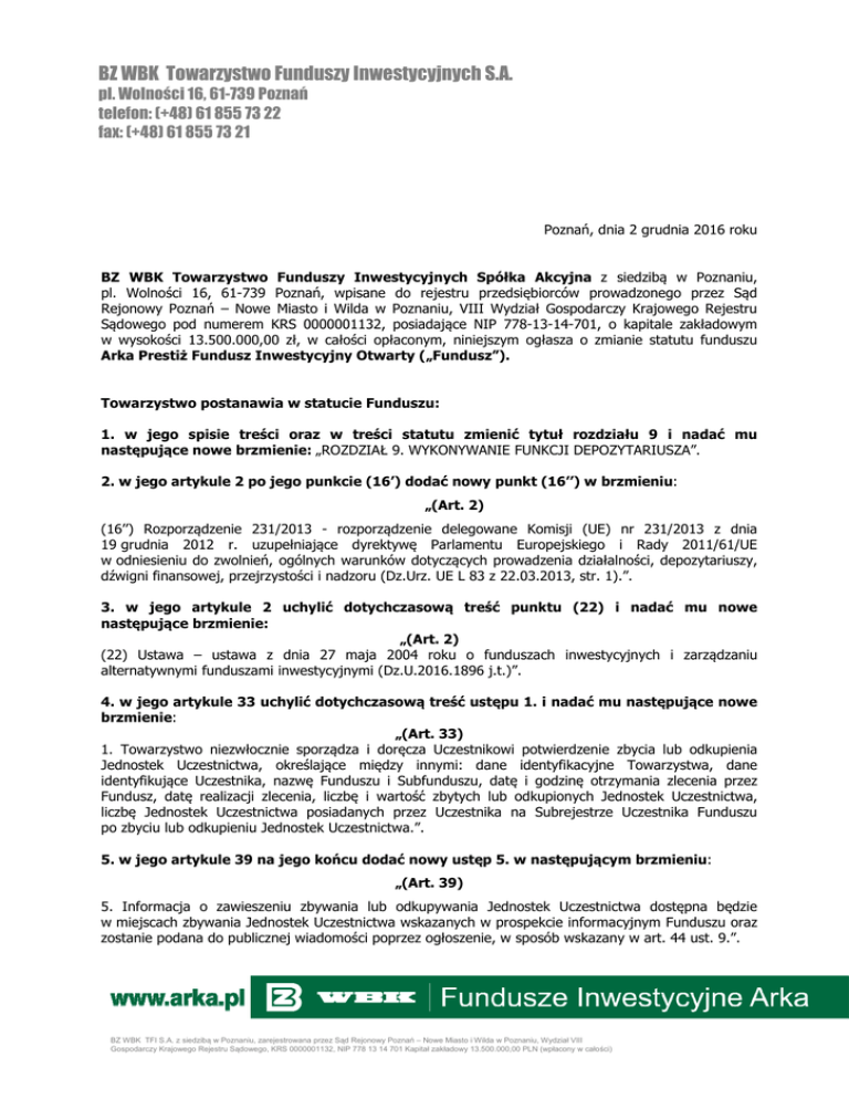 BZ WBK Towarzystwo Funduszy Inwestycyjnych S.A. pl. Wolności 16, 61-739 Poznań telefon: (+48) 61 855 73 22 fax: (+48) 61 855 73 21 Poznań, dnia 2 grudnia 2016 roku BZ WBK Towarzystwo Funduszy Inwestycyjnych Spółka Akcyjna z siedzibą w Poznaniu, pl. Wolności 16, 61-739 Poznań, wpisane do rejestru przedsiębiorców prowadzonego przez Sąd Rejonowy Poznań – Nowe Miasto i Wilda w Poznaniu, VIII Wydział Gospodarczy Krajowego Rejestru Sądowego pod numerem KRS 0000001132, posiadające NIP 778-13-14-701, o kapitale zakładowym w wysokości 13.500.000,00 zł, w całości opłaconym, niniejszym ogłasza o zmianie statutu funduszu Arka Prestiż Fundusz Inwestycyjny Otwarty („Fundusz”). Towarzystwo postanawia w statucie Funduszu: 1. w jego spisie treści oraz w treści statutu zmienić tytuł rozdziału 9 i nadać mu następujące nowe brzmienie: „ROZDZIAŁ 9. WYKONYWANIE FUNKCJI DEPOZYTARIUSZA”. 2. w jego artykule 2 po jego punkcie (16’) dodać nowy punkt (16’’) w brzmieniu: „(Art. 2) (16’’) Rozporządzenie 231/2013 - rozporządzenie delegowane Komisji (UE) nr 231/2013 z dnia 19 grudnia 2012 r. uzupełniające dyrektywę Parlamentu Europejskiego i Rady 2011/61/UE w odniesieniu do zwolnień, ogólnych warunków dotyczących prowadzenia działalności, depozytariuszy, dźwigni finansowej, przejrzystości i nadzoru (Dz.Urz. UE L 83 z 22.03.2013, str. 1).”. 3. w jego artykule 2 uchylić dotychczasową treść punktu (22) i nadać mu nowe następujące brzmienie: „(Art. 2) (22) Ustawa – ustawa z dnia 27 maja 2004 roku o funduszach inwestycyjnych i zarządzaniu alternatywnymi funduszami inwestycyjnymi (Dz.U.2016.1896 j.t.)”. 4. w jego artykule 33 uchylić dotychczasową treść ustępu 1. i nadać mu następujące nowe brzmienie: „(Art. 33) 1. Towarzystwo niezwłocznie sporządza i doręcza Uczestnikowi potwierdzenie zbycia lub odkupienia Jednostek Uczestnictwa, określające między innymi: dane identyfikacyjne Towarzystwa, dane identyfikujące Uczestnika, nazwę Funduszu i Subfunduszu, datę i godzinę otrzymania zlecenia przez Fundusz, datę realizacji zlecenia, liczbę i wartość zbytych lub odkupionych Jednostek Uczestnictwa, liczbę Jednostek Uczestnictwa posiadanych przez Uczestnika na Subrejestrze Uczestnika Funduszu po zbyciu lub odkupieniu Jednostek Uczestnictwa.”. 5. w jego artykule 39 na jego końcu dodać nowy ustęp 5. w następującym brzmieniu: „(Art. 39) 5. Informacja o zawieszeniu zbywania lub odkupywania Jednostek Uczestnictwa dostępna będzie w miejscach zbywania Jednostek Uczestnictwa wskazanych w prospekcie informacyjnym Funduszu oraz zostanie podana do publicznej wiadomości poprzez ogłoszenie, w sposób wskazany w art. 44 ust. 9.”. BZ WBK TFI S.A. z siedzibą w Poznaniu, zarejestrowana przez Sąd Rejonowy Poznań – Nowe Miasto i Wilda w Poznaniu, Wydział VIII Gospodarczy Krajowego Rejestru Sądowego, KRS 0000001132, NIP 778 13 14 701 Kapitał zakładowy 13.500.000,00 PLN (wpłacony w całości) 6. zmienić tytuł oraz treść jego artykułu 42 i nadać im następujące nowe brzmienie: „Art. 42 Wykonywanie funkcji Depozytariusza 1. Depozytariusz na podstawie umowy o wykonywanie funkcji depozytariusza prowadzi rejestr Aktywów Funduszu oraz subrejestry Aktywów Subfunduszy oraz wykonuje inne obowiązki depozytariusza określone Ustawą i Rozporządzeniem 231/2013. 2. Depozytariusz może w drodze umowy zawartej w formie pisemnej, powierzyć przedsiębiorcy lub przedsiębiorcy zagranicznemu wykonywanie czynności w zakresie związanym z realizacją funkcji przechowywania Aktywów Funduszu w zakresie i na zasadach opisanych w Ustawie i Rozporządzeniu 231/2013.”. 7. w jego artykule 43 w ustępie 1. skreślić słowa: „prowadzenie rejestru Aktywów” i zastąpić je słowami: „wykonywanie funkcji depozytariusza”. 8. w jego w jego artykule 43 w ustępie 2. po słowach: „Szczegółowe obowiązki Depozytariusza są ustalone w umowie między Towarzystwem” dodać przecinek oraz słowo: „Funduszem”. 9. nadać nowy tytuł jego artykułu 44 w brzmieniu: „(Art. 44) Udostępnianie informacji o Funduszu”. 10. w jego artykule 44 w ustępie 1. po słowach: „Fundusz publikuje prospekt informacyjny,” dodać słowa: „informacje, o których mowa w ust. 11,”. 11. w jego artykule 44 na jego końcu dodać nowy ustęp 11. w następującym brzmieniu: „(Art. 44) 11. Przy zbywaniu Jednostek Uczestnictwa Towarzystwo udostępnia informację dla klienta, której mowa w art. 222a ust. 1 Ustawy, w formie jednolitego dokumentu stanowiącego uzupełnienie prospektu informacyjnego, umożliwiając zapoznanie się z nią przed nabyciem Jednostek Uczestnictwa. Udostępnieniu podlegają również istotne zmiany w informacji wymienionej w poprzednim zdaniu. Wykonanie obowiązku, o którym mowa w zdaniu poprzednim obciąża Dystrybutora, w przypadku gdy Jednostki Uczestnictwa są zbywane za jego pośrednictwem.”. 12. w jego artykule 46 w ustępie 1. uchylić dotychczasową treść punktu (2) i nadać mu nowe następujące brzmienie: „(Art. 46) (2) Depozytariusz zaprzestał wykonywania swoich obowiązków i nie zawarto z innym depozytariuszem umowy o wykonywanie funkcji depozytariusza Funduszu, najpóźniej do końca dnia roboczego następującego po dniu zaprzestania wykonywania przez Depozytariusza obowiązków,”. 13. w jego artykule 46 w ustępie 1. po jego dotychczasowym punkcie (2) dodać nowy punkt (2’) w następującym brzmieniu: „(Art. 46) (2’) upłynie okres wypowiedzenia umowy o wykonywanie funkcji Depozytariusza, a do dnia upływu tego okresu Fundusz nie zawrze umowy o wykonywanie funkcji depozytariusza z innym depozytariuszem,”. BZ WBK TFI S.A. z siedzibą w Poznaniu, zarejestrowana przez Sąd Rejonowy Poznań – Nowe Miasto i Wilda w Poznaniu, Wydział VIII Gospodarczy Krajowego Rejestru Sądowego, KRS 0000001132, NIP 778 13 14 701 Kapitał zakładowy 13.500.000,00 PLN (wpłacony w całości) Pozostałe zapisy 