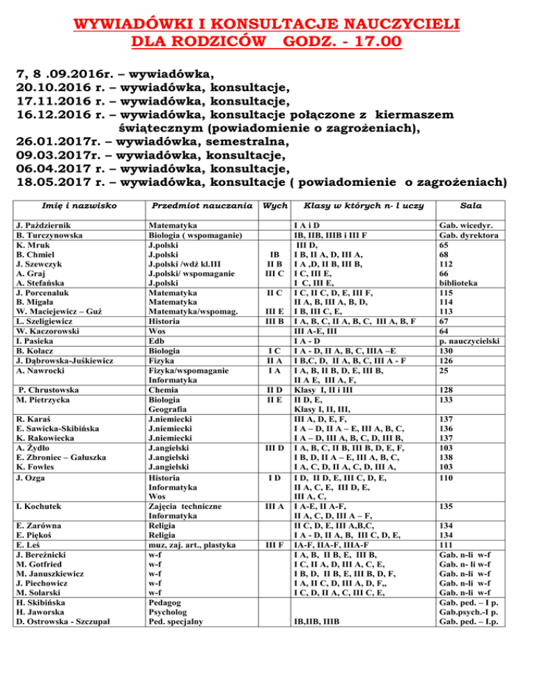 WYWIADÓWKI I KONSULTACJE NAUCZYCIELI DLA RODZICÓW GODZ. - 17.00 7, 8 .09.2016r. – wywiadówka, 20.10.2016 r. – wywiadówka, konsultacje, 17.11.2016 r. – wywiadówka, konsultacje, 16.12.2016 r. – wywiadówka, konsultacje połączone z kiermaszem świątecznym (powiadomienie o zagrożeniach), 26.01.2017r. – wywiadówka, semestralna, 09.03.2017r. – wywiadówka, konsultacje, 06.04.2017 r. – wywiadówka, konsultacje, 18.05.2017 r. – wywiadówka, konsultacje ( powiadomienie o zagrożeniach) Imię i nazwisko J. Październik B. Turczynowska K. Mruk B. Chmiel J. Szewczyk A. Graj A. Stefańska J. Porcenaluk B. Migała W. Maciejewicz – Guź L. Szeligiewicz W. Kaczorowski I. Pasieka B. Kołacz J. Dąbrowska-Juśkiewicz A. Nawrocki P. Chrustowska M. Pietrzycka R. Karaś E. Sawicka-Skibińska K. Rakowiecka A. Żydło E. Zbroniec – Gałuszka K. Fowles J. Ozga I. Kochutek E. Zarówna E. Piękoś E. Leś J. Bereźnicki M. Gotfried M. Januszkiewicz J. Piechowicz M. Solarski H. Skibińska H. Jaworska D. Ostrowska - Szczupał Przedmiot nauczania Matematyka Biologia ( wspomaganie) J.polski J.polski J.polski /wdż kl.III J.polski/ wspomaganie J.polski Matematyka Matematyka Matematyka/wspomag. Historia Wos Edb Biologia Fizyka Fizyka/wspomaganie Informatyka Chemia Biologia Geografia J.niemiecki J.niemiecki J.niemiecki J.angielski J.angielski J.angielski Historia Informatyka Wos Zajęcia techniczne Informatyka Religia Religia muz, zaj. art., plastyka w-f w-f w-f w-f w-f Pedagog Psycholog Ped. specjalny Wych IB II B III C II C III E III B IC II A IA II D II E III D ID III A III F Klasy w których n- l uczy IAiD IB, IIB, IIIB i III F III D, I B, II A, D, III A, I A ,D, II B, III B, I C, III E, I C, III E, I C, II C, D, E, III F, II A, B, III A, B, D, I B, III C, E, I A, B, C, II A, B, C, III A, B, F III A-E, III IA-D I A - D, II A, B, C, IIIA –E I B,C, D, II A, B, C, III A - F I A, B, II B, D, E, III B, II A E, III A, F, Klasy I, II i III II D, E, Klasy I, II, III, III A, D, E, F, I A – D, II A – E, III A, B, C, I A – D, III A, B, C, D, III B, I A, B, C, II B, III B, D, E, F, I B, D, II A – E, III A, B, C, I A, C, D, II A, C, D, III A, I D, II D, E, III C, D, E, II A, C, E, III D, E, III A, C, I A-E, II A-F, II A, C, D, III A – F, II C, D, E, III A,B,C, I A - D, II A, B, III C, D, E, IA-F, IIA-F, IIIA-F I A, B, II B, E, III B, I C, II A, D, III A, C, E, I B, D, II B, E, III B, D, F, I A, II C, D, III A, D, F,, I C, D, II A, C, III C, E, IB,IIB, IIIB Sala Gab. wicedyr. Gab. dyrektora 65 68 112 66 biblioteka 115 114 113 67 64 p. nauczycielski 130 126 25 128 133 137 136 137 103 138 103 110 135 134 134 111 Gab. n-li w-f Gab. n- li w-f Gab. n-li w-f Gab. n-li w-f Gab. n-li w-f Gab. ped. – I p. Gab.psych.-I p. Gab. ped. – I.p.