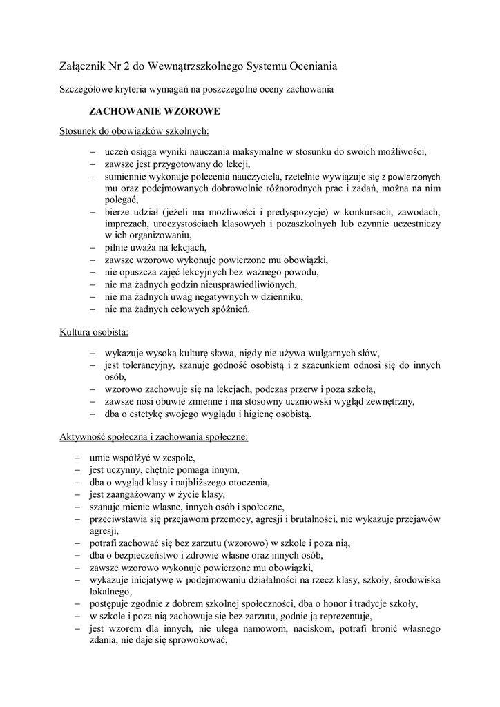 Załącznik Nr 2 do Wewnątrzszkolnego Systemu Oceniania Szczegółowe kryteria wymagań na poszczególne oceny zachowania ZACHOWANIE WZOROWE Stosunek do obowiązków szkolnych: uczeń osiąga wyniki nauczania maksymalne w stosunku do swoich możliwości, zawsze jest przygotowany do lekcji, sumiennie wykonuje polecenia nauczyciela, rzetelnie wywiązuje się z powierzonych mu oraz podejmowanych dobrowolnie różnorodnych prac i zadań, można na nim polegać, bierze udział (jeżeli ma możliwości i predyspozycje) w konkursach, zawodach, imprezach, uroczystościach klasowych i pozaszkolnych lub czynnie uczestniczy w ich organizowaniu, pilnie uważa na lekcjach, zawsze wzorowo wykonuje powierzone mu obowiązki, nie opuszcza zajęć lekcyjnych bez ważnego powodu, nie ma żadnych godzin nieusprawiedliwionych, nie ma żadnych uwag negatywnych w dzienniku, nie ma żadnych celowych spóźnień. Kultura osobista: wykazuje wysoką kulturę słowa, nigdy nie używa wulgarnych słów, jest tolerancyjny, szanuje godność osobistą i z szacunkiem odnosi się do innych osób, wzorowo zachowuje się na lekcjach, podczas przerw i poza szkołą, zawsze nosi obuwie zmienne i ma stosowny uczniowski wygląd zewnętrzny, dba o estetykę swojego wyglądu i higienę osobistą. Aktywność społeczna i zachowania społeczne: umie współżyć w zespole, jest uczynny, chętnie pomaga innym, dba o wygląd klasy i najbliższego otoczenia, jest zaangażowany w życie klasy, szanuje mienie własne, innych osób i społeczne, przeciwstawia się przejawom przemocy, agresji i brutalności, nie wykazuje przejawów agresji, potrafi zachować się bez zarzutu (wzorowo) w szkole i poza nią, dba o bezpieczeństwo i zdrowie własne oraz innych osób, zawsze wzorowo wykonuje powierzone mu obowiązki, wykazuje inicjatywę w podejmowaniu działalności na rzecz klasy, szkoły, środowiska lokalnego, postępuje zgodnie z dobrem szkolnej społeczności, dba o honor i tradycje szkoły, w szkole i poza nią zachowuje się bez zarzutu, godnie ją reprezentuje, jest wzorem dla innych, nie ulega namowom, naciskom, potrafi bronić własnego zdania, nie daje się sprowokować, respektuje zasady współżycia społecznego i ogólnie przyjęte normy etyczne wobec siebie i innych, nie ulega nałogom. ZACHOWANIE BARDZO DOBRE Stosunek do obowiązków szkolnych: osiąga wyniki nauczania wysokie w stosunku do swoich możliwości, zawsze jest przygotowany do lekcji, wykonuje polecenia nauczyciela, podejmuje się wykonywania dodatkowych zadań na prośbę nauczyciela, angażuje się (jeśli ma możliwość możliwości i predyspozycje) do udziału w konkursach, zawodach, imprezach, uroczystościach klasowych, szkolnych i pozaszkolnych lub czynnie uczestniczy w ich organizowaniu, pilnie uważa na lekcjach, nie ma godzin nieusprawiedliwionych, nie opuszcza zajęć lekcyjnych bez ważnego powodu, nie ma żadnych celowych spóźnień, może mieć jedną uwagę negatywną w dzienniku i zastosowane środki zaradcze przyniosły pozytywne rezultaty. Kultura osobistą: nie używa wulgarnych słów, stosuje zwroty grzecznościowe, jest miły i uprzejmy we wszystkich kontaktach interpersonalnych, zachowanie na lekcjach, podczas przerw i poza szkołą nie budzi zastrzeżeń, nosi obuwie zmienne i ma stosowny uczniowski wygląd zewnętrzny, dba o estetykę swojego wyglądu i higienę osobistą. Aktywność społeczna i zachowania społeczne: umie współżyć w zespole, jest uczynny, w razie potrzeby pomaga innym, bardzo dobrze wykonuje powierzone mu obowiązki (np. dyżurny, inne zobowiązania), szanuje mienie własne, innych osób i społeczne, przeciwstawia się przejawom przemocy i agresji, sam nie wykazuje jej angażuje się w życie klasy, dba o wygląd klasy i najbliższego otoczenia, dba o bezpieczeństwo i zdrowie własne i innych, postępuje zgodnie z dobrem szkolnej społeczności, dba o honor i tradycje szkoły, zachowuje się bez zarzutu w szkole i poza nią, nie ulega namowom, naciskom, potrafi bronić własnego zdania, nie daje się sprowokować, respektuje zasady współżycia społecznego i ogólnie przyjęte normy etyczne wobec siebie i innych, nie ulega nałogom. ZACHOWANIE DOBRE Stosunek do obowiązków szkolnych: osiąga wyniki nauczania adekwatne w stosunku do swoich możliwości, jest przygotowany do lekcji, podejmuje się wykonywania dodatkowych zadań na polecenie nauczyciela, uważa na lekcjach, wywiązuje się ze swoich obowiązków szkolnych, nie ma godzin nieusprawiedliwionych, może mieć dwie uwagi negatywne w dzienniku, jednak zastosowane środki zaradcze przyniosły pozytywne rezultaty, może pięciokrotnie w semestrze spóźnić się na lekcje. Kultura osobista: zachowuje się odpowiednio do sytuacji, nie używa wulgarnych słów, stosuje zwroty grzecznościowe, nosi obuwie zmienne i ma stosowny uczniowski wygląd zewnętrzny, dba o estetykę swojego wyglądu i higienę osobistą. Zachowania społeczne i aktywność społeczna: respektuje zasady współżycia społecznego i ogólnie przyjęte normy etyczne wobec siebie i innych, zachowanie na lekcjach, podczas przerw i poza szkołą nie budzi poważnych zastrzeżeń, wywiązuje się z powierzonych mu obowiązków, angażuje się w życie klasy w wybrany przez siebie sposób lub na prośbę nauczyciela, dba o wygląd klasy i najbliższego otoczenia, dba o bezpieczeństwo i zdrowie własne, nie naraża innych, nie przejawia agresji słownej i fizycznej, szanuje mienie własne, innych osób i społeczne, dba honor i tradycje szkoły, jego zachowanie nie budzi zastrzeżeń w szkole i poza nią, nie ulega nałogom. ZACHOWANIE POPRAWNE Stosunek do obowiązków szkolnych uczy się na minimum swoich możliwości, nie wykorzystuje całego swojego potencjału, motywowany nie podejmuje dodatkowych działań, wykonuje polecenia nauczyciela, zdarza mu się nie przygotować do lekcji (brak pracy domowej, podręcznika itp.), pozytywnie reaguje na uwagi nauczyciela, posiada do 4 negatyw