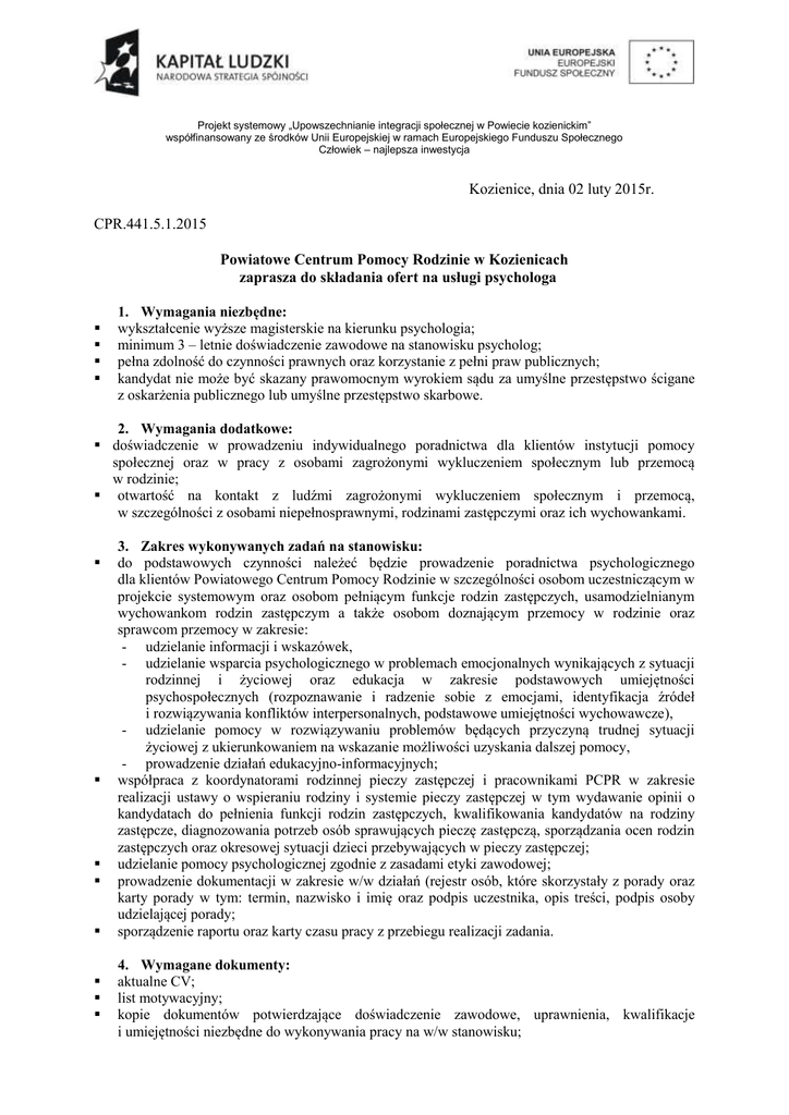Projekt systemowy „Upowszechnianie integracji społecznej w Powiecie kozienickim” współfinansowany ze środków Unii Europejskiej w ramach Europejskiego Funduszu Społecznego Człowiek – najlepsza inwestycja Kozienice, dnia 02 luty 2015r. CPR.441.5.1.2015 Powiatowe Centrum Pomocy Rodzinie w Kozienicach zaprasza do składania ofert na usługi psychologa 1. Wymagania niezbędne: wykształcenie wyższe magisterskie na kierunku psychologia; minimum 3 – letnie doświadczenie zawodowe na stanowisku psycholog; pełna zdolność do czynności prawnych oraz korzystanie z pełni praw publicznych; kandydat nie może być skazany prawomocnym wyrokiem sądu za umyślne przestępstwo ścigane z oskarżenia publicznego lub umyślne przestępstwo skarbowe. 2. Wymagania dodatkowe: doświadczenie w prowadzeniu indywidualnego poradnictwa dla klientów instytucji pomocy społecznej oraz w pracy z osobami zagrożonymi wykluczeniem społecznym lub przemocą w rodzinie; otwartość na kontakt z ludźmi zagrożonymi wykluczeniem społecznym i przemocą, w szczególności z osobami niepełnosprawnymi, rodzinami zastępczymi oraz ich wychowankami. 3. Zakres wykonywanych zadań na stanowisku: do podstawowych czynności należeć będzie prowadzenie poradnictwa psychologicznego dla klientów Powiatowego Centrum Pomocy Rodzinie w szczególności osobom uczestniczącym w projekcie systemowym oraz osobom pełniącym funkcje rodzin zastępczych, usamodzielnianym wychowankom rodzin zastępczym a także osobom doznającym przemocy w rodzinie oraz sprawcom przemocy w zakresie: udzielanie informacji i wskazówek, udzielanie wsparcia psychologicznego w problemach emocjonalnych wynikających z sytuacji rodzinnej i życiowej oraz edukacja w zakresie podstawowych umiejętności psychospołecznych (rozpoznawanie i radzenie sobie z emocjami, identyfikacja źródeł i rozwiązywania konfliktów interpersonalnych, podstawowe umiejętności wychowawcze), udzielanie pomocy w rozwiązywaniu problemów będących przyczyną trudnej sytuacji życiowej z ukierunkowaniem na wskazanie możliwości uzyskania dalszej pomocy, prowadzenie działań edukacyjno-informacyjnych; współpraca z koordynatorami rodzinnej pieczy zastępczej i pracownikami PCPR w zakresie realizacji ustawy o wspieraniu rodziny i systemie pieczy zastępczej w tym wydawanie opinii o kandydatach do pełnienia funkcji rodzin zastępczych, kwalifikowania kandydatów na rodziny zastępcze, diagnozowania potrzeb osób sprawujących pieczę zastępczą, sporządzania ocen rodzin zastępczych oraz okresowej sytuacji dzieci przebywających w pieczy zastępczej; udzielanie pomocy psychologicznej zgodnie z zasadami etyki zawodowej; prowadzenie dokumentacji w zakresie w/w działań (rejestr osób, które skorzystały z porady oraz karty porady w tym: termin, nazwisko i imię oraz podpis uczestnika, opis treści, podpis osoby udzielającej porady; sporządzenie raportu oraz karty czasu pracy z przebiegu realizacji zadania. 4. Wymagane dokumenty: aktualne CV; list motywacyjny; kopie dokumentów potwierdzające doświadczenie zawodowe, uprawnienia, kwalifikacje i umiejętności niezbędne do wykonywania pracy na w/w stanowisku; oświadczenie o niekaralności o treści: „Oświadczam że nie byłem/am karany/a za przestępstwo popełnione umyślnie i nie toczy się przeciwko mnie postępowanie karne. Oświadczam, że posiadam pełną zdolność do czynności prawnych i korzystam w pełni z praw publicznych zgodnie z art. 6 ust. 1 pkt 2 ustawy o pracownikach samorządowych /Dz. U. z 2008r. Nr 223 poz. 1458 z późn. zm./.” oświadczenie dot. zatrudnienia w instytucjach realizujących projekty w tym POKL stanowiące zał. Nr 1 do niniejszego ogłoszenia; zamawiający zastrzega sobie prawo żądania dodatkowych dokumentów niezbędnych do rozpatrzenia oferty. Wymagane dokumenty aplikacyjne: CV oraz list motywacyjny, powinny być opatrzone klauzulą: „Wyrażam zgodę na przetwarzanie moich danych osobowych zawartych w ofercie pracy dla potrzeb niezbędnych do realizacji procesu rekrutacji zgodnie z ustawą z dnia 29 sierpnia 1997 r. o ochronie danych osobowych (Dz. U. z 2002r. Nr 101, poz. 926 z późn. zm.).” 5. Dokumenty dodatkowe. Oferta cenowa zawierająca cenę jednostkową brutto za jedną godzinę usługi - załącznik Nr 2 do niniejszego ogłoszenia. 6. Kryterium oceny ofert: Zaoferowana cena usługi i doświadczenie w prowadzeniu indywidualnego poradnictwa dla klientów instytucji pomocy społecznej. Rozmowa kwalifikacyjna. 7. Informacja dodatkowe: Termin realizacji zamówienia: marzec 2015r. - listopad 2015r. Miejsce wykonywania zadania: Powiatowe Centrum Pomocy Rodzinie w Kozienicach ul. Kochanowskiego 15. Wymiar godzin : Na wykonanie zadań w Punkcie Poradnictwa Specjalistycznego w okresie od marca 2015 roku do listopada 2015 roku planuje się 25 godzin w ramach projektu systemowego „Upowszechnianie integracji społecznej w Powiecie kozienickim” współfinansowanego ze środków Unii Europejskiej w ramach Europejskiego Funduszu Społecznego oraz 35 godzin w ramach podstawowej działalności PCPR w Kozienicach. 8. Osobą uprawnioną do kontaktu z Oferentami: Violetta Bednarek tel. 48/ 3820562 –z zakresu przedmiotu zamówienia; Marcin Styś tel. /48/ 3820564 –z zakresu procedur. Termin złożenia dokumentów: do dnia 13 lutego 2015 roku Wymagane dokumenty należy składać osobiście w Dziale Organizacyjno-Administracyjnym /pok. 4/ Powiatowego Centrum Pomocy Rodzinie w Kozienicach lub pocztą na adres : Powiatowe Centrum Pomocy Rodzinie ul. Kochanowskiego 15 26-900 Kozienice z dopiskiem na kopercie „Oferta PSYCHOLOG” Z kandydatami spełniającymi powyższe wymagania zapisane w niniejszym ogłoszeniu zostanie przeprowadzona rozmowa kwalifikacyjna, na którą kandydaci zostaną zaproszeni telefonicznie. Dokumenty, które wpłyną do tut. urzędu po wyżej określonym terminie nie będą rozpatrywane i zostaną wpięte do akt spraw. Informacja o wyniku 