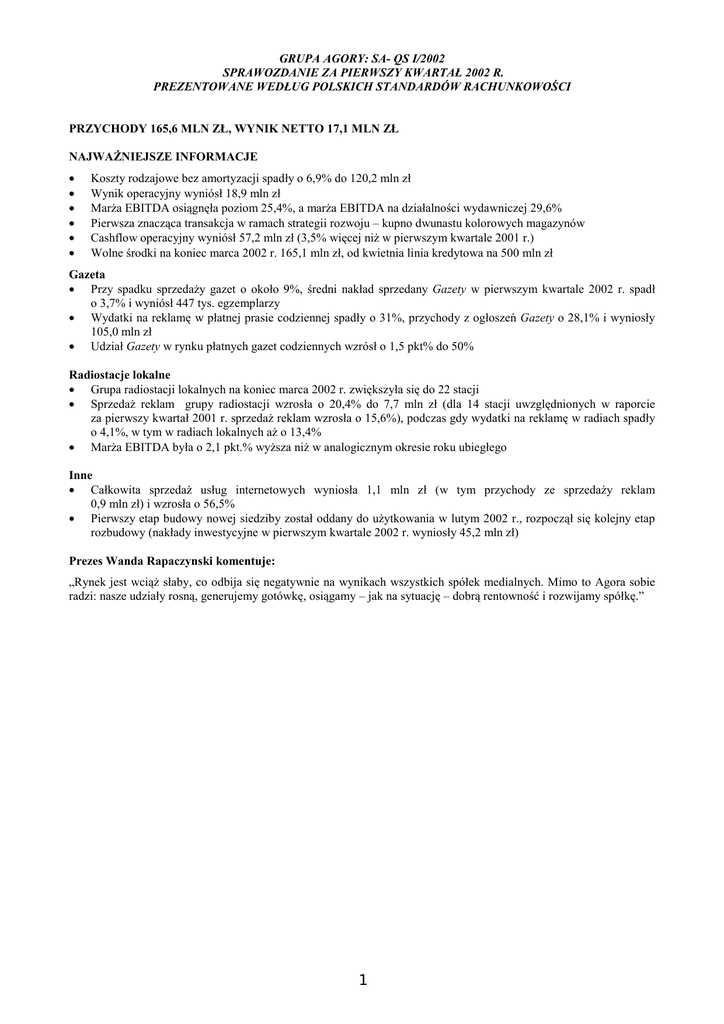 GRUPA AGORY: SA- QS I/2002 SPRAWOZDANIE ZA PIERWSZY KWARTAŁ 2002 R. PREZENTOWANE WEDŁUG POLSKICH STANDARDÓW RACHUNKOWOŚCI PRZYCHODY 165,6 MLN ZŁ, WYNIK NETTO 17,1 MLN ZŁ NAJWAŻNIEJSZE INFORMACJE · · · · · · Koszty rodzajowe bez amortyzacji spadły o 6,9% do 120,2 mln zł Wynik operacyjny wyniósł 18,9 mln zł Marża EBITDA osiągnęła poziom 25,4%, a marża EBITDA na działalności wydawniczej 29,6% Pierwsza znacząca transakcja w ramach strategii rozwoju – kupno dwunastu kolorowych magazynów Cashflow operacyjny wyniósł 57,2 mln zł (3,5% więcej niż w pierwszym kwartale 2001 r.) Wolne środki na koniec marca 2002 r. 165,1 mln zł, od kwietnia linia kredytowa na 500 mln zł Gazeta · Przy spadku sprzedaży gazet o około 9%, średni nakład sprzedany Gazety w pierwszym kwartale 2002 r. spadł o 3,7% i wyniósł 447 tys. egzemplarzy · Wydatki na reklamę w płatnej prasie codziennej spadły o 31%, przychody z ogłoszeń Gazety o 28,1% i wyniosły 105,0 mln zł · Udział Gazety w rynku płatnych gazet codziennych wzrósł o 1,5 pkt% do 50% Radiostacje lokalne · Grupa radiostacji lokalnych na koniec marca 2002 r. zwiększyła się do 22 stacji · Sprzedaż reklam grupy radiostacji wzrosła o 20,4% do 7,7 mln zł (dla 14 stacji uwzględnionych w raporcie za pierwszy kwartał 2001 r. sprzedaż reklam wzrosła o 15,6%), podczas gdy wydatki na reklamę w radiach spadły o 4,1%, w tym w radiach lokalnych aż o 13,4% · Marża EBITDA była o 2,1 pkt.% wyższa niż w analogicznym okresie roku ubiegłego Inne · Całkowita sprzedaż usług internetowych wyniosła 1,1 mln zł (w tym przychody ze sprzedaży reklam 0,9 mln zł) i wzrosła o 56,5% · Pierwszy etap budowy nowej siedziby został oddany do użytkowania w lutym 2002 r., rozpoczął się kolejny etap rozbudowy (nakłady inwestycyjne w pierwszym kwartale 2002 r. wyniosły 45,2 mln zł) Prezes Wanda Rapaczynski komentuje: „Rynek jest wciąż słaby, co odbija się negatywnie na wynikach wszystkich spółek medialnych. Mimo to Agora sobie radzi: nasze udziały rosną, generujemy gotówkę, osiągamy – jak na sytuację – dobrą rentowność i rozwijamy spółkę.” 1 CZYNNIKI ZEWNĘTRZNE I WEWNĘTRZNE ISTOTNE DLA ROZWOJU GRUPY Sytuacja gospodarcza i rynek reklamowy Pierwszy kwartał 2002 r. nie przyniósł pozytywnych wieści makroekonomicznych. Według szacunków rządowych wzrost PKB wyniósł jedynie 0,4-0,6%, a stopa bezrobocia na koniec marca 2002 r. wzrosła do 18,1%. Jak zwykle, kiedy zwalnia gospodarka, pogarszają się trendy na rynku sprzedaży prasy i reklamy. Według wstępnych szacunków ZKDP sprzedaż egzemplarzy dzienników spadła o około 9%. Pogłębiła się również recesja na rynku reklamy. Wydatki na reklamę w Polsce w pierwszym kwartale 2002 r. zmniejszyły się aż o 14,7% w stosunku do pierwszego kwartału 2001 r. Wydatki na reklamę w TV spadły tylko o 6%, w prasie o 26% (w tym w dziennikach aż o 31%, w magazynach o 16%). Radio i outdoor straciły odpowiednio 4% i 3,5%. W dziennikach spadkowy trend kontynuowały branże motoryzacyjna (spadek o 31%), budownictwo (spadek o 46%), praca (spadek o 30%) i komunikaty (spadek o 28%). Ponadto wyraźnie spadły wydatki w branżach: telekomunikacja (40%), sieci handlowe (23%) oraz turystyka (32%). Analizując rynek reklamy należy pamiętać, że pierwszy kwartał zeszłego roku nie zapowiadał recesji na rynku reklamowym. Dynamika wydatków była jeszcze dodatnia, a spadek rozpoczął się od drugiego kwartału 2001 r. Stąd tak wielki rozziew między pierwszym kwartałem 2002 r., a pierwszym kwartałem poprzedniego roku. Wyniki pierwszego kwartału 2002 r., a także bardzo słabe wyniki pierwszych tygodni drugiego kwartału br. świadczą o tym, że spadkowy trend może jeszcze potrwać. Jak oczekiwaliśmy, trudno będzie o odbicie tego negatywnego trendu przed końcem roku. Dane dotyczące wydatków na reklamę podawane w treści niniejszego sprawozdania – według szacunków Agory uwzględniających poziom średniego rabatu, nie uwzględniających inflacji. WYNIKI OPERACYJNE Wyniki Grupy przedstawione w niniejszym sprawozdaniu obejmują konsolidację dwóch spółek: Agorę SA oraz Agorę Poligrafię Sp. z o.o. Pozostałe spółki, w których Agora SA posiada udziały (radiostacje, City Magazine Sp. z o.o., Centrum Handlu Internetowego Sp. z o.o.) nie są konsolidowane z racji nie spełnienia warunku istotności określonego w zasadach rachunkowości. Poniższa tabela przedstawia wyniki głównych gałęzi działalności Grupy Agora: Główne gałęzie działalności Grupy Agora w mln zł Łączne przychody IQ 2002 Działalność wydawnicza 164,2 w tym „Metro” 0,4 Internet 1,1 Radiostacje lokalne (1) 8,3 TOK FM (2) 0,6 City Magazine (3) 0,7 Ø Ø Ø Ø IQ 2001 % zmiany 197,3 -16,8% - 0,7 6,9 0,5 1,0 Przychody z reklam 56,5% 19,0% 15,9% -26,0% IQ 2002 IQ 2001 109,5 0,4 0,9 7,7 0,6 0,7 150,3 % zmiany -27,1% - 0,5 6,4 0,4 1,0 EBITDA 87,2% 20,4% 37,7% -26,0% IQ 2002 IQ 2001 48,6 -0,1 -3,0 -0,4 -0,4 -0,7 67,7 % zmiany -28,3% - -3,0 -0,4 -1,4 0,1 0,3% 19,1% 75,4% - Szarym kolorem zaznaczono działalności nie konsolidowane w sprawozdaniu Grupy. (1) 22 stacje w marcu 2002 r., w których Agora jest właścicielem od 4% do 100% udziałów (w marcu 2001 r. 14 stacji) (2) Agora jest właścicielem 41,6% udziałów (3) Agora jest właścicielem 100% udziałów GAZETA WYBORCZA Sprzedaż egzemplarzy Przy średniej cenie netto (bez VAT) wyższej o 19,0% w stosunku do ubiegłego roku przychody ze sprzedaży Gazety w pierwszym kwartale 2002 r. wzrosły o 14,5% do 48,3 mln zł i stanowiły 29,1% przychodów Grupy. Według wstępnych danych ZKDP w pierwszym kwartale 2002 r. liczba sprzedanych egzemplarzy gazet codziennych spadła o około 9%, zaś dzienna sprzedaż egzemplarzowa Gazety spadła w omawianym okresie o 3,7% i wyniosła średnio 447 tys. egzemplarzy. 2 Sprzedaż reklam Rynek reklamy w Polsce w 2002 r. spadł o 14,7%. Rynek reklamy płatnych ga