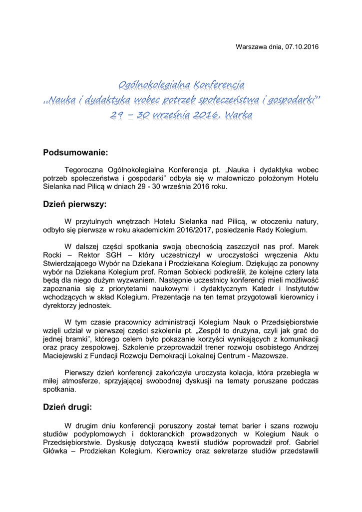 Warszawa dnia, 07.10.2016 Podsumowanie: Tegoroczna Ogólnokolegialna Konferencja pt. „Nauka i dydaktyka wobec potrzeb społeczeństwa i gospodarki” odbyła się w malowniczo położonym Hotelu Sielanka nad Pilicą w dniach 29 - 30 września 2016 roku. Dzień pierwszy: W przytulnych wnętrzach Hotelu Sielanka nad Pilicą, w otoczeniu natury, odbyło się pierwsze w roku akademickim 2016/2017, posiedzenie Rady Kolegium. W dalszej części spotkania swoją obecnością zaszczycił nas prof. Marek Rocki – Rektor SGH – który uczestniczył w uroczystości wręczenia Aktu Stwierdzającego Wybór na Dziekana i Prodziekana Kolegium. Dziękując za ponowny wybór na Dziekana Kolegium prof. Roman Sobiecki podkreślił, że kolejne cztery lata będą dla niego dużym wyzwaniem. Następnie uczestnicy konferencji mieli możliwość zapoznania się z priorytetami naukowymi i dydaktycznym Katedr i Instytutów wchodzących w skład Kolegium. Prezentacje na ten temat przygotowali kierownicy i dyrektorzy jednostek. W tym czasie pracownicy administracji Kolegium Nauk o Przedsiębiorstwie wzięli udział w pierwszej części szkolenia pt. „Zespół to drużyna, czyli jak grać do jednej bramki”, którego celem było pokazanie korzyści wynikających z komunikacji oraz pracy zespołowej. Szkolenie przeprowadził trener rozwoju osobistego Andrzej Maciejewski z Fundacji Rozwoju Demokracji Lokalnej Centrum - Mazowsze. Pierwszy dzień konferencji zakończyła uroczysta kolacja, która przebiegła w miłej atmosferze, sprzyjającej swobodnej dyskusji na tematy poruszane podczas spotkania. Dzień drugi: W drugim dniu konferencji poruszony został temat barier i szans rozwoju studiów podyplomowych i doktoranckich prowadzonych w Kolegium Nauk o Przedsiębiorstwie. Dyskusję dotyczącą kwestii studiów poprowadził prof. Gabriel Główka – Prodziekan Kolegium. Kierownicy oraz sekretarze studiów przedstawili swoje opinie na temat napotykanych problemów organizacyjnych oraz możliwości rozwoju i promocji studiów. W tym czasie pracownicy administracji Kolegium uczestniczyli w II części szkolenia poświęconego pracy zespołowej. Zakończenie Wszyscy uczestnicy Konferencji zgodnie podkreślili, że problematyka poruszana podczas spotkania ma istotne znaczenie dla rozwoju oferty dydaktycznej realizowanej w Kolegium Nauk o Przedsiębiorstwie.